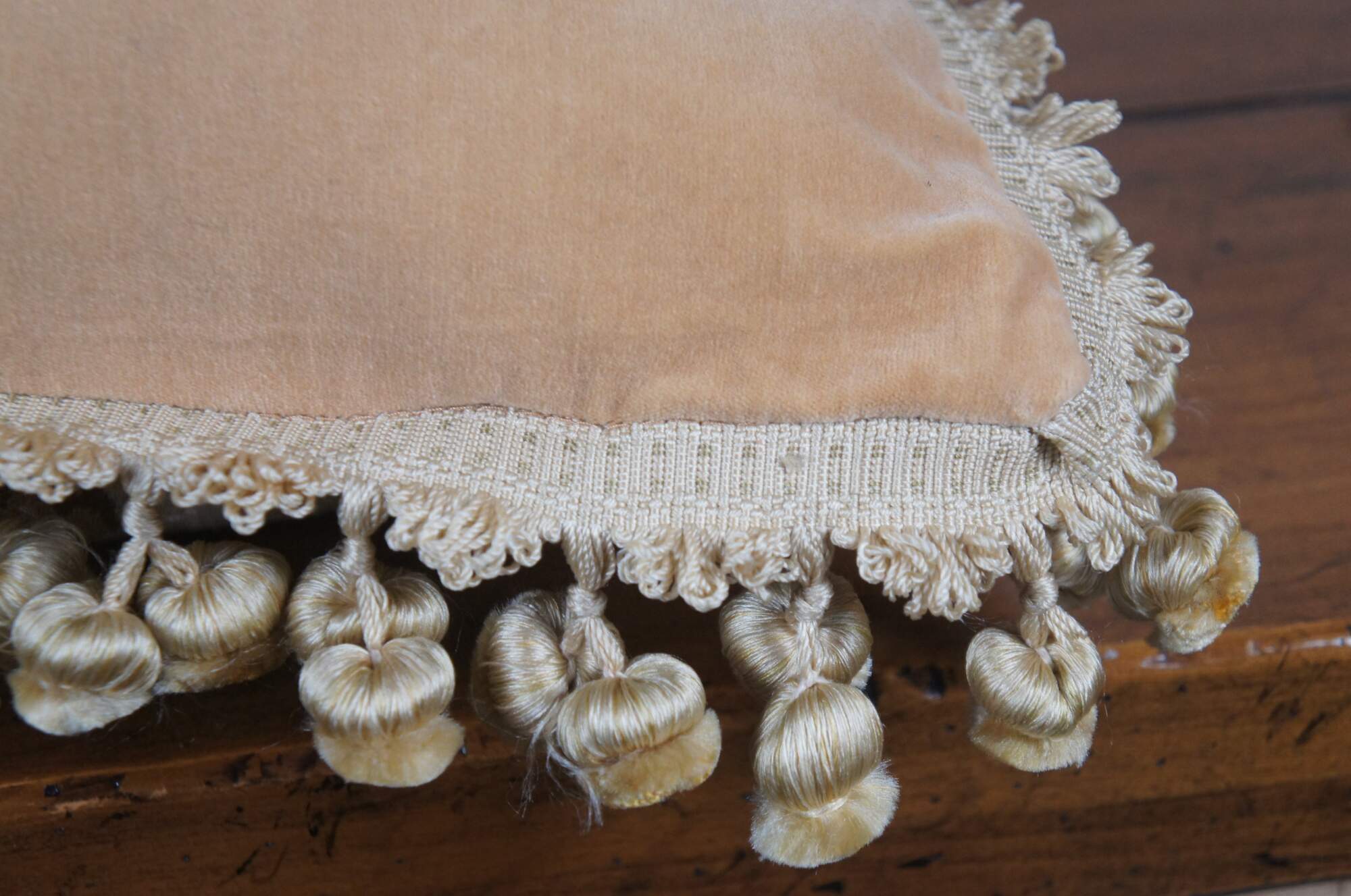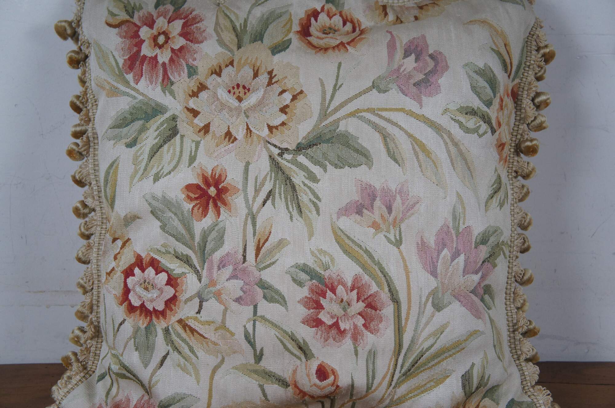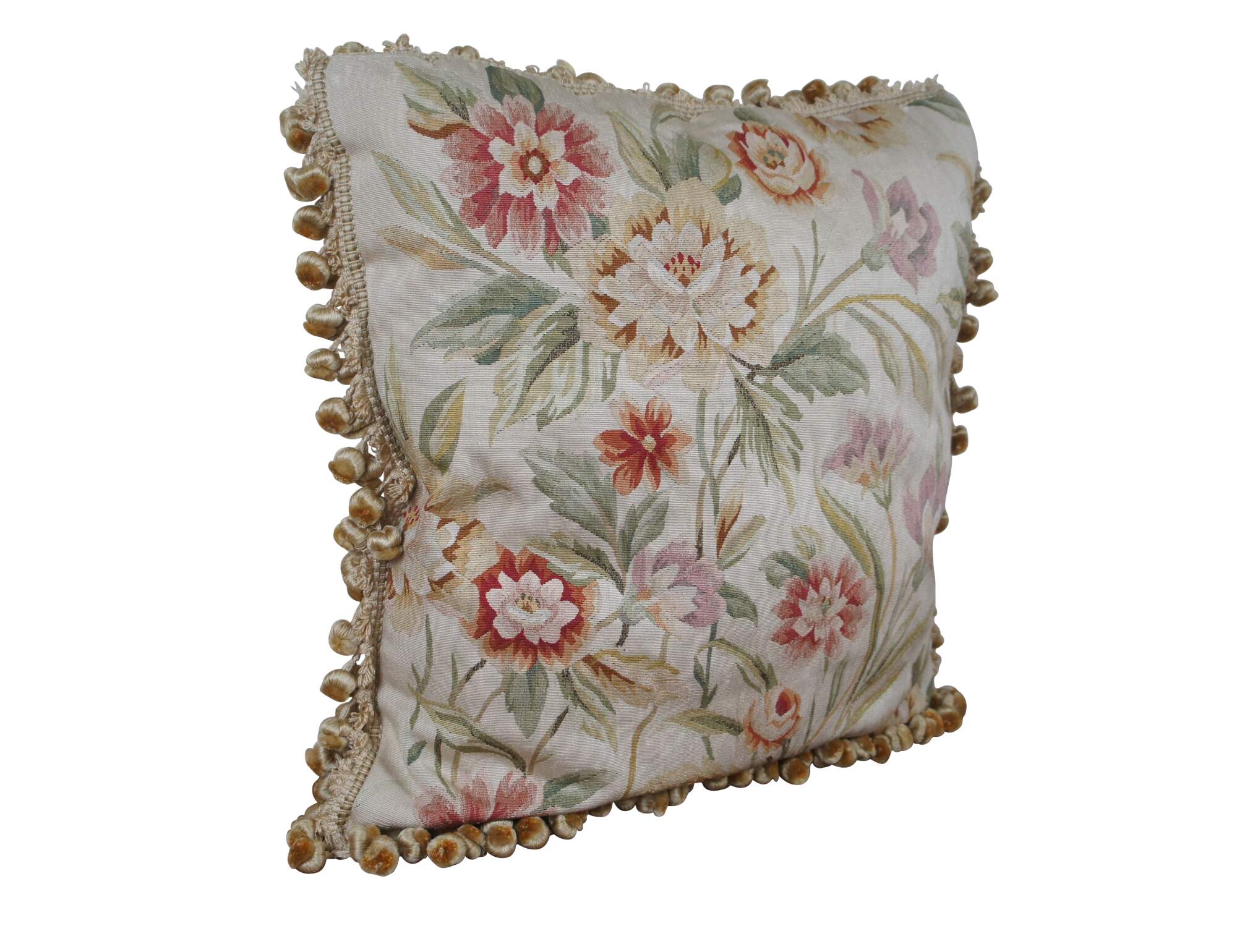 20th century French Aubusson style square throw pillow, embroidered in silk with and array of rust, cream, pink and purple flowers on leafy stems. Light beige ball tassel trim. Light brown velour back with zipper closure. Fiber filled.