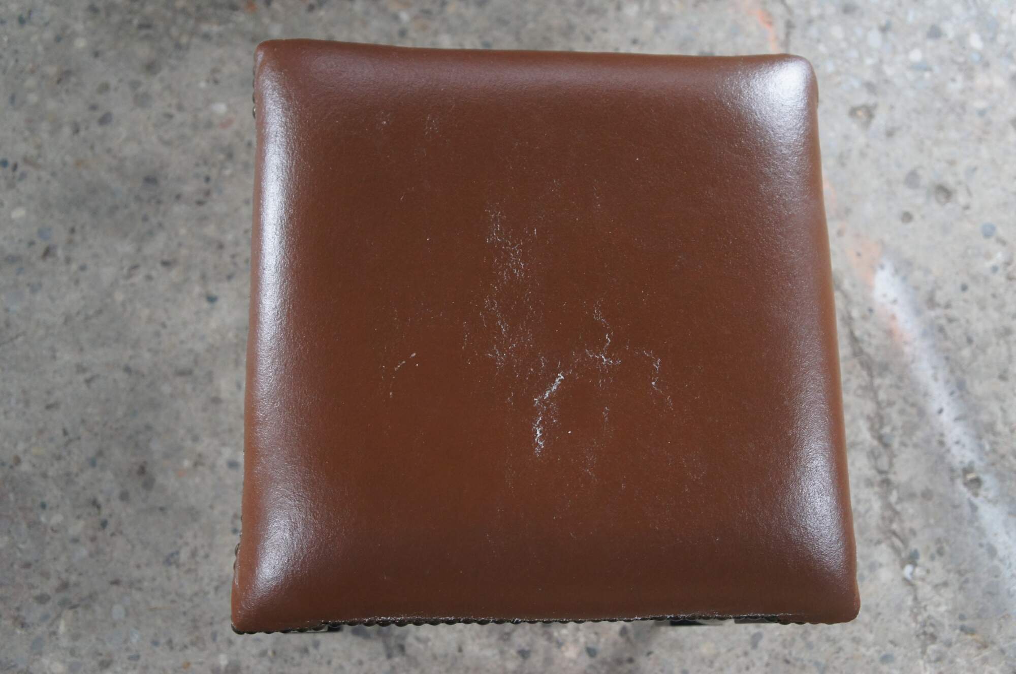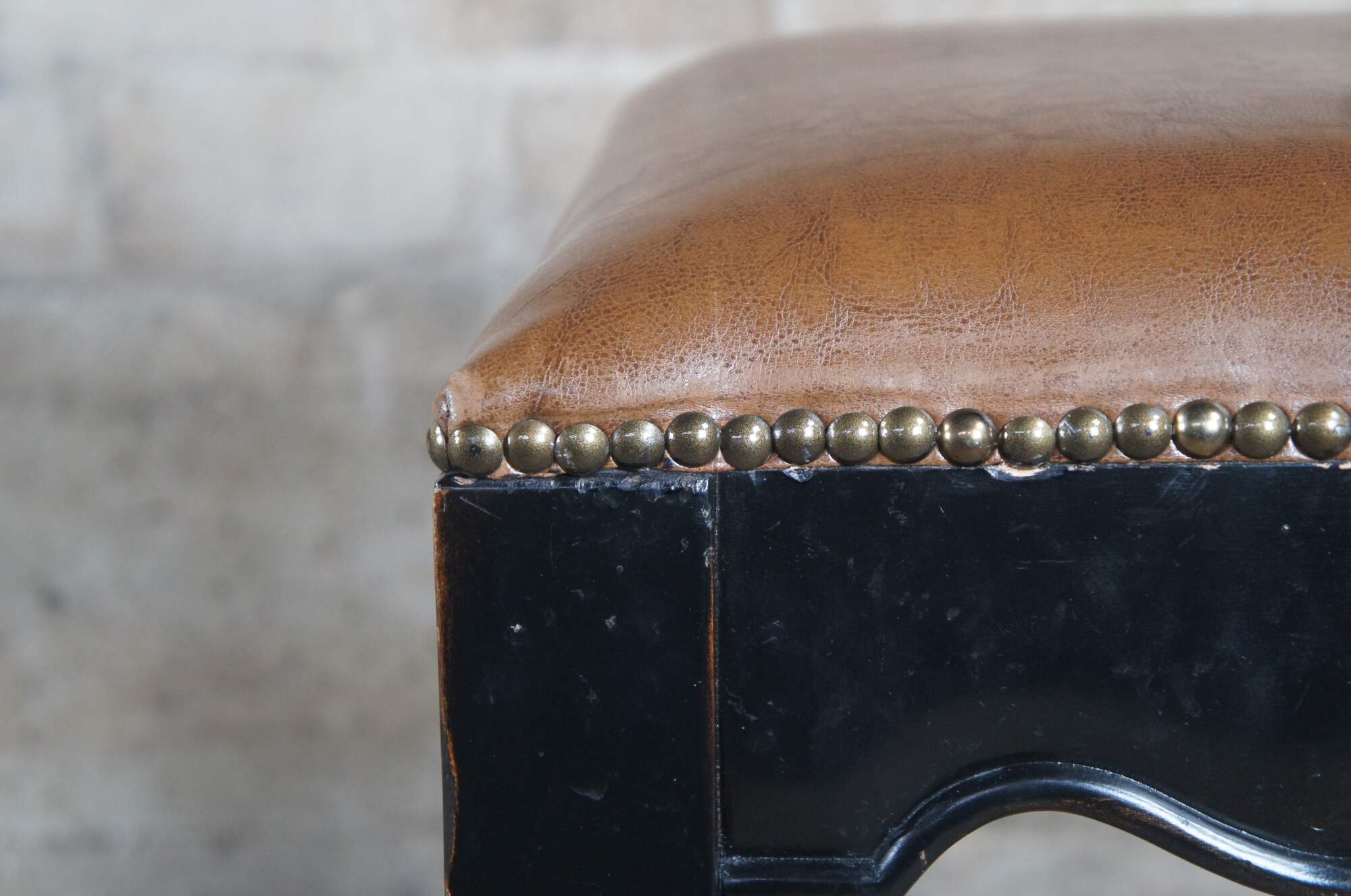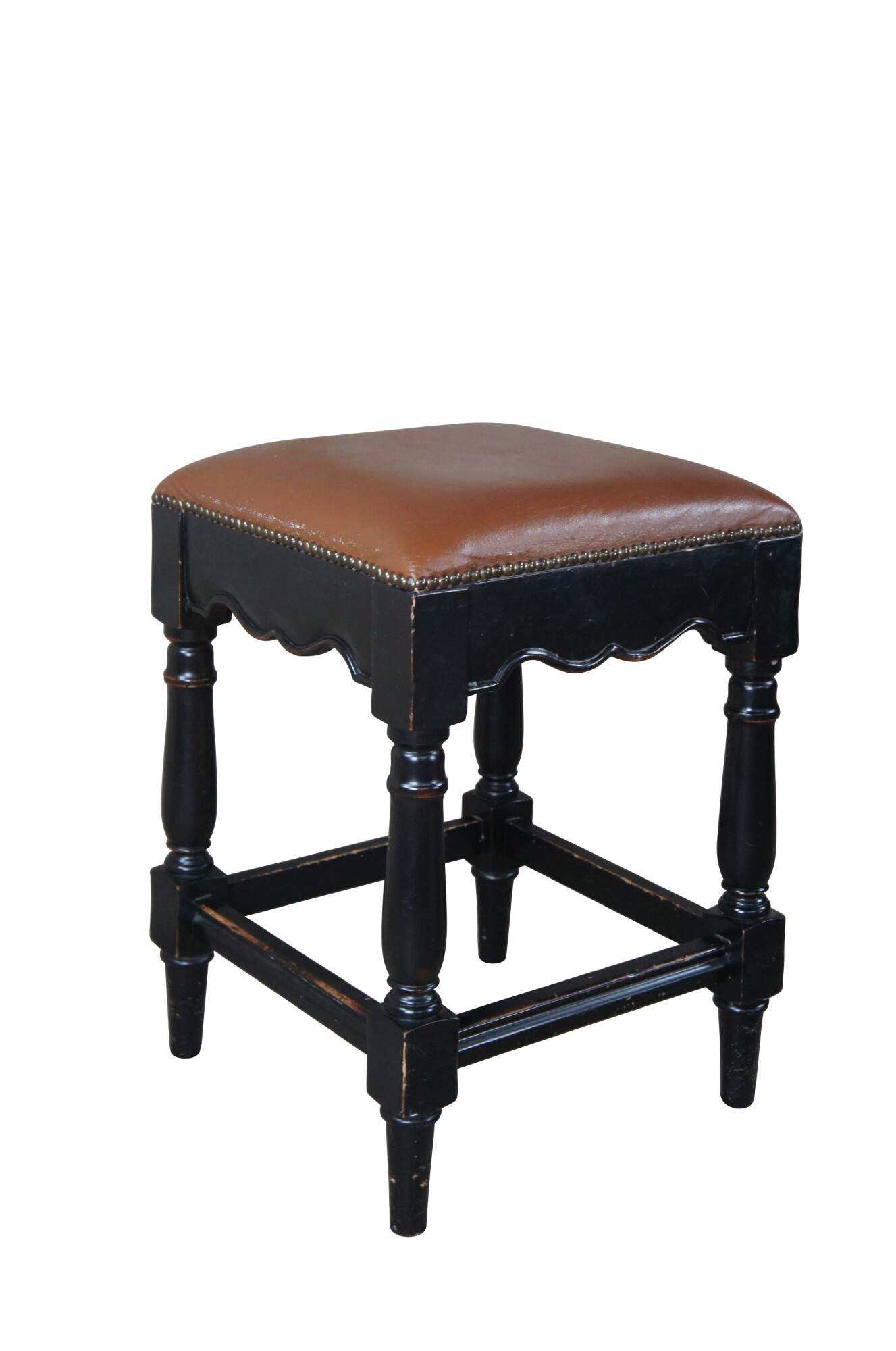 Four vintage Ballard Designs Marlow low bar or counter height stools featuring French Country styling with ebonized frame, leather seats and brass nailhead trim. Distributed by Hillsdale Furniture inc.