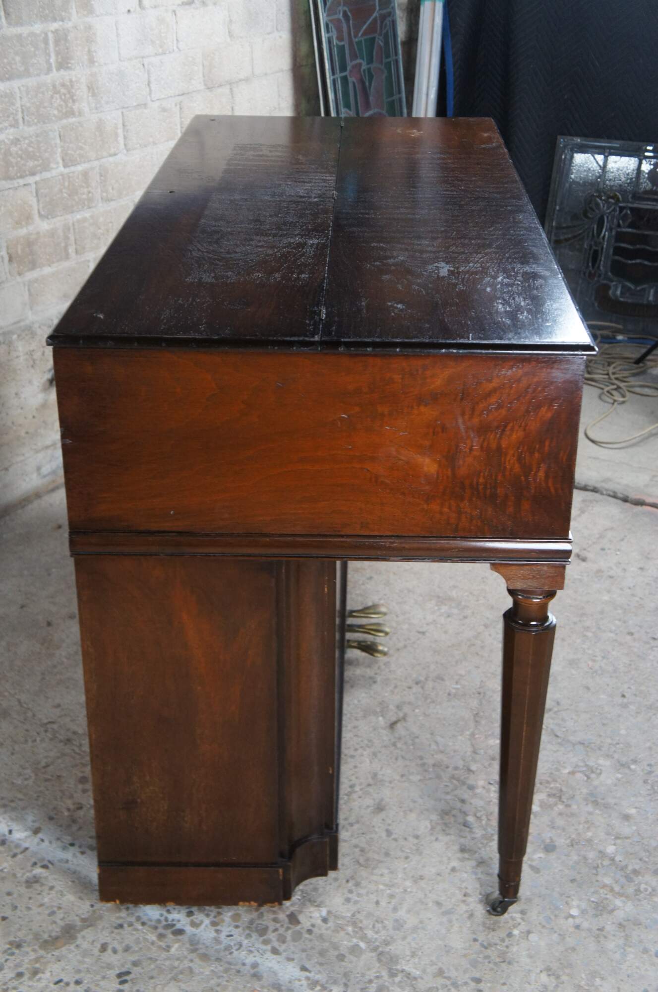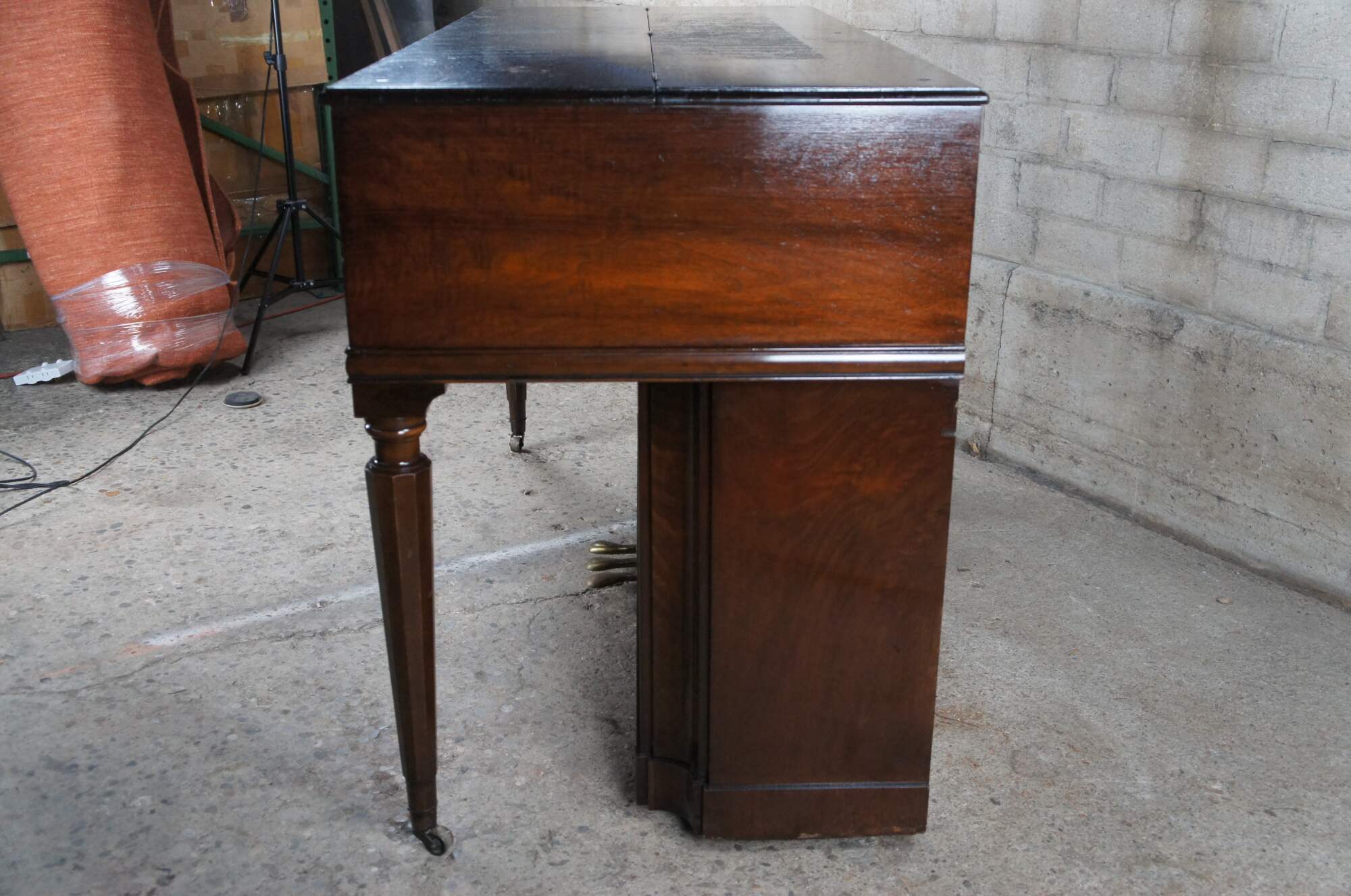 1947 Baldwin Upright Spinet Piano. Made from walnut with a matchbook veneered case. The upright has 88 keys. Serial number 37520