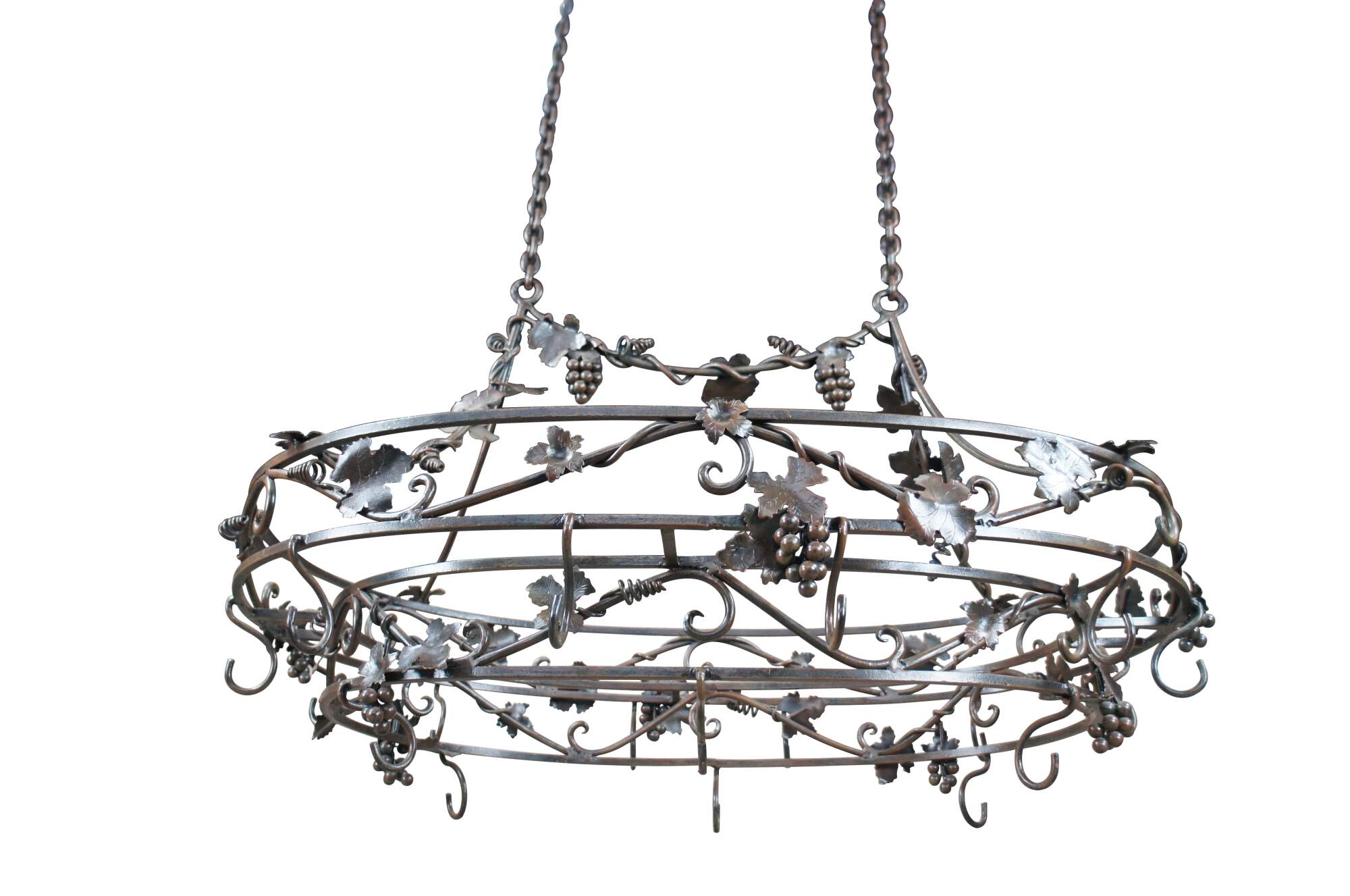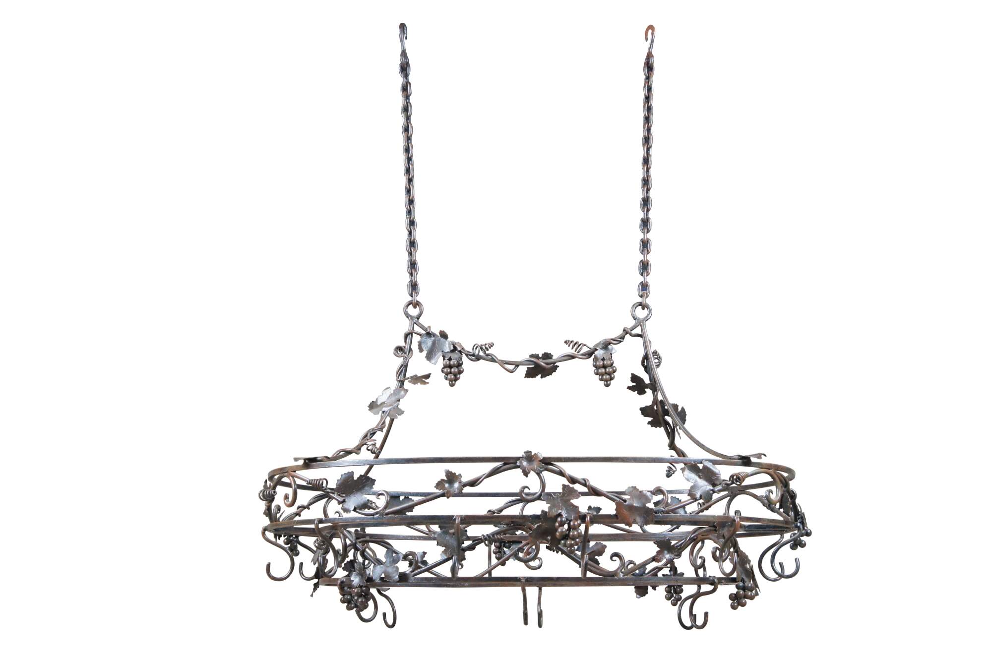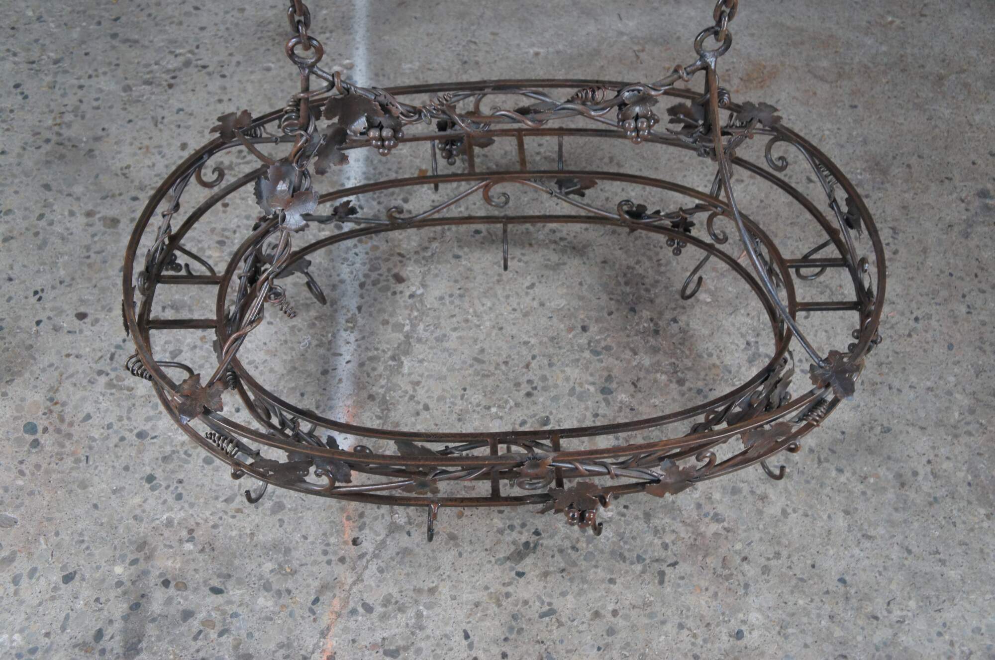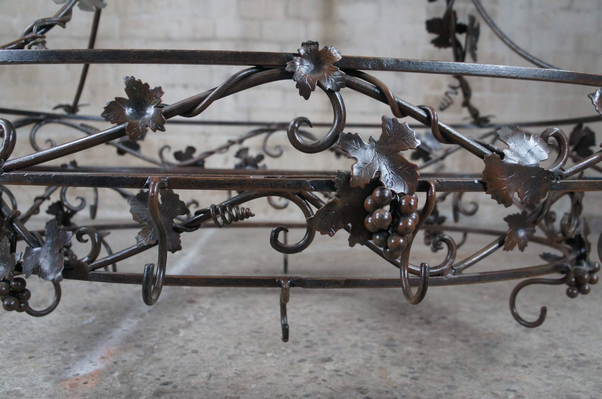 Late 20th century wrought iron pot rack featuring Tuscan grapevine and leaf / wine / Vineyard theme with stunning detail. Made in the Philippines.