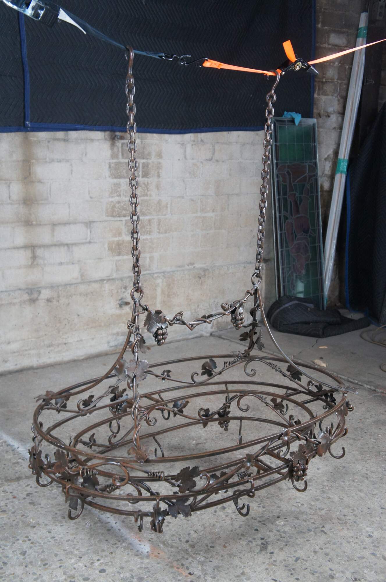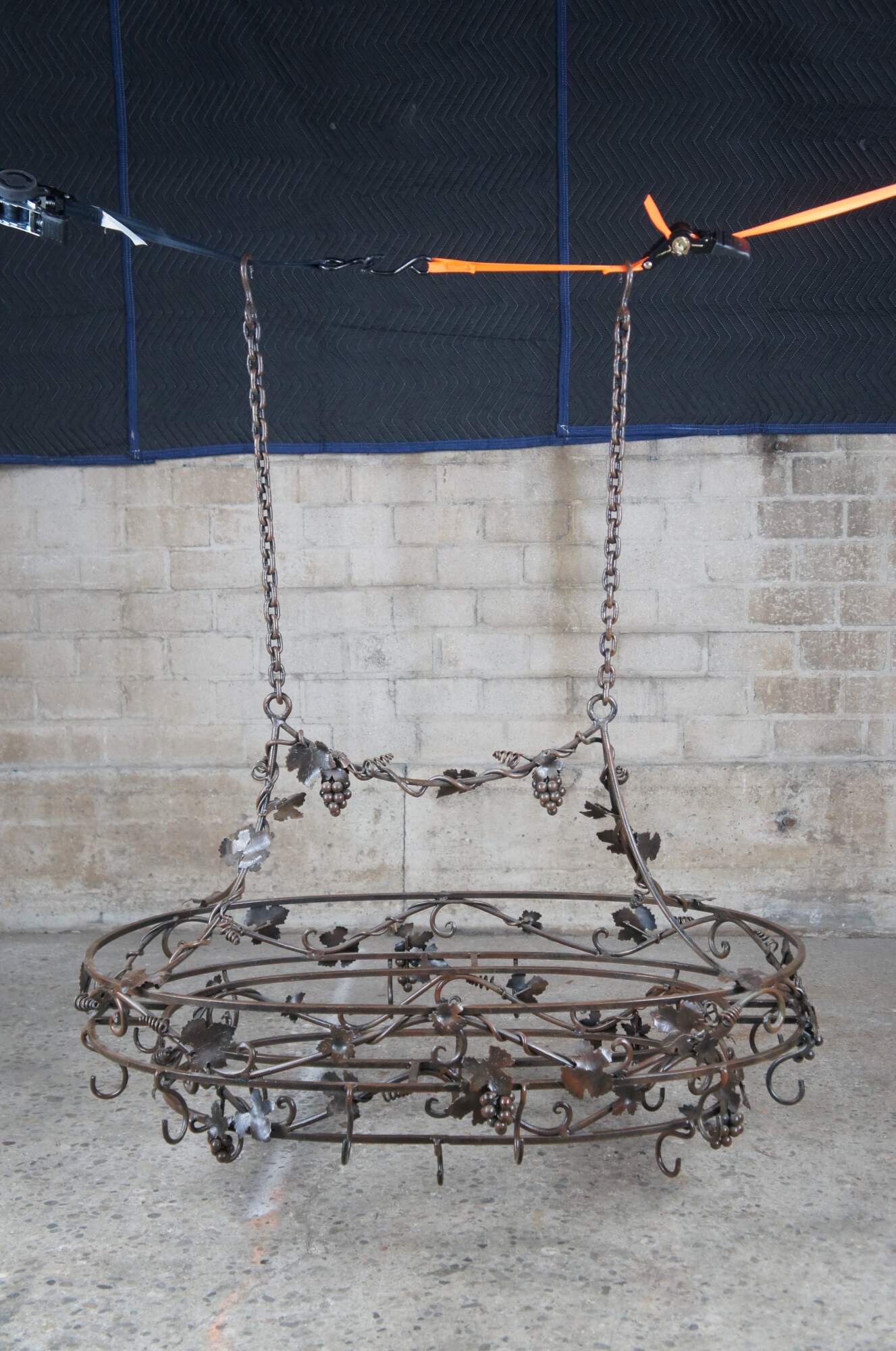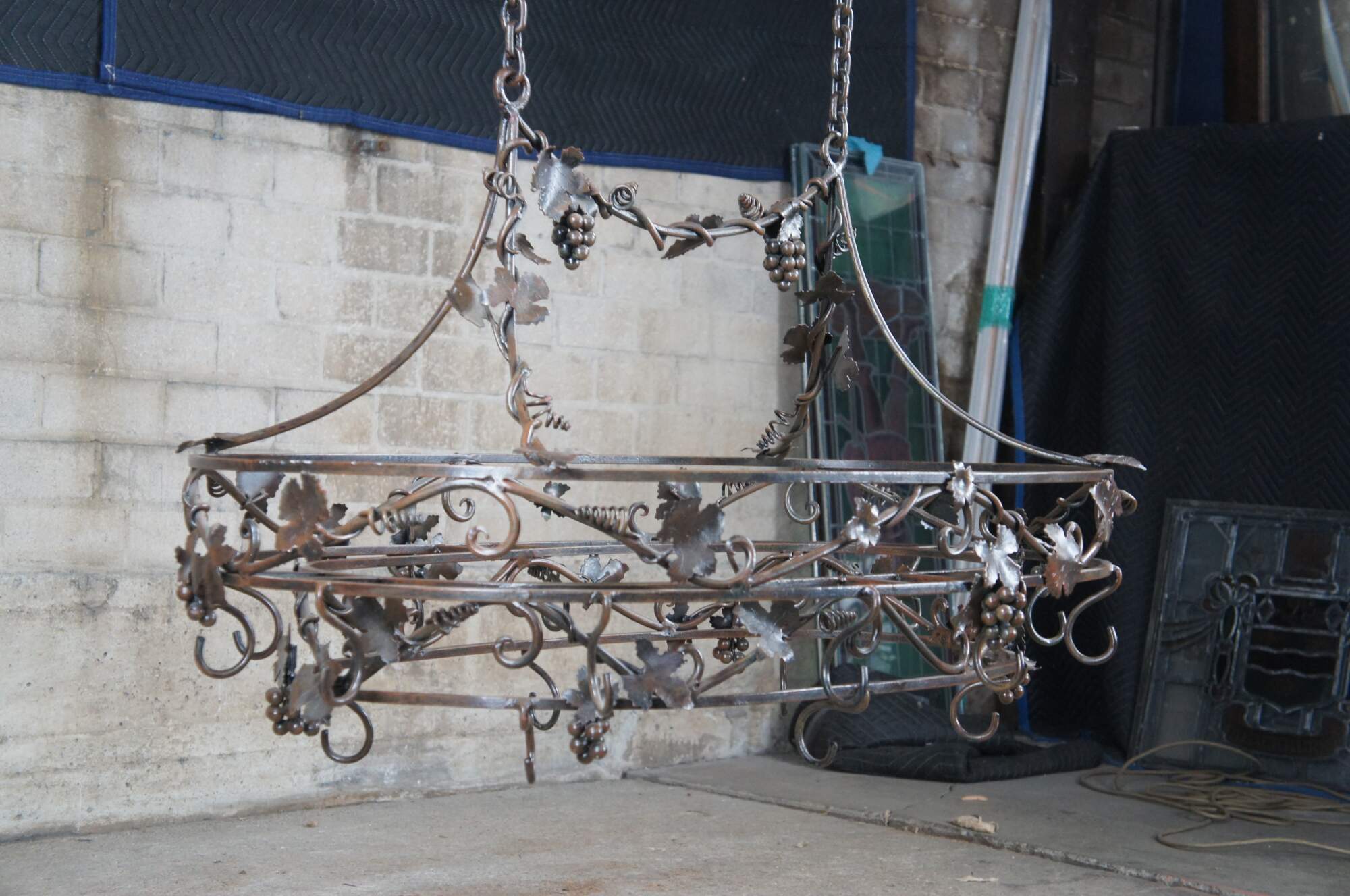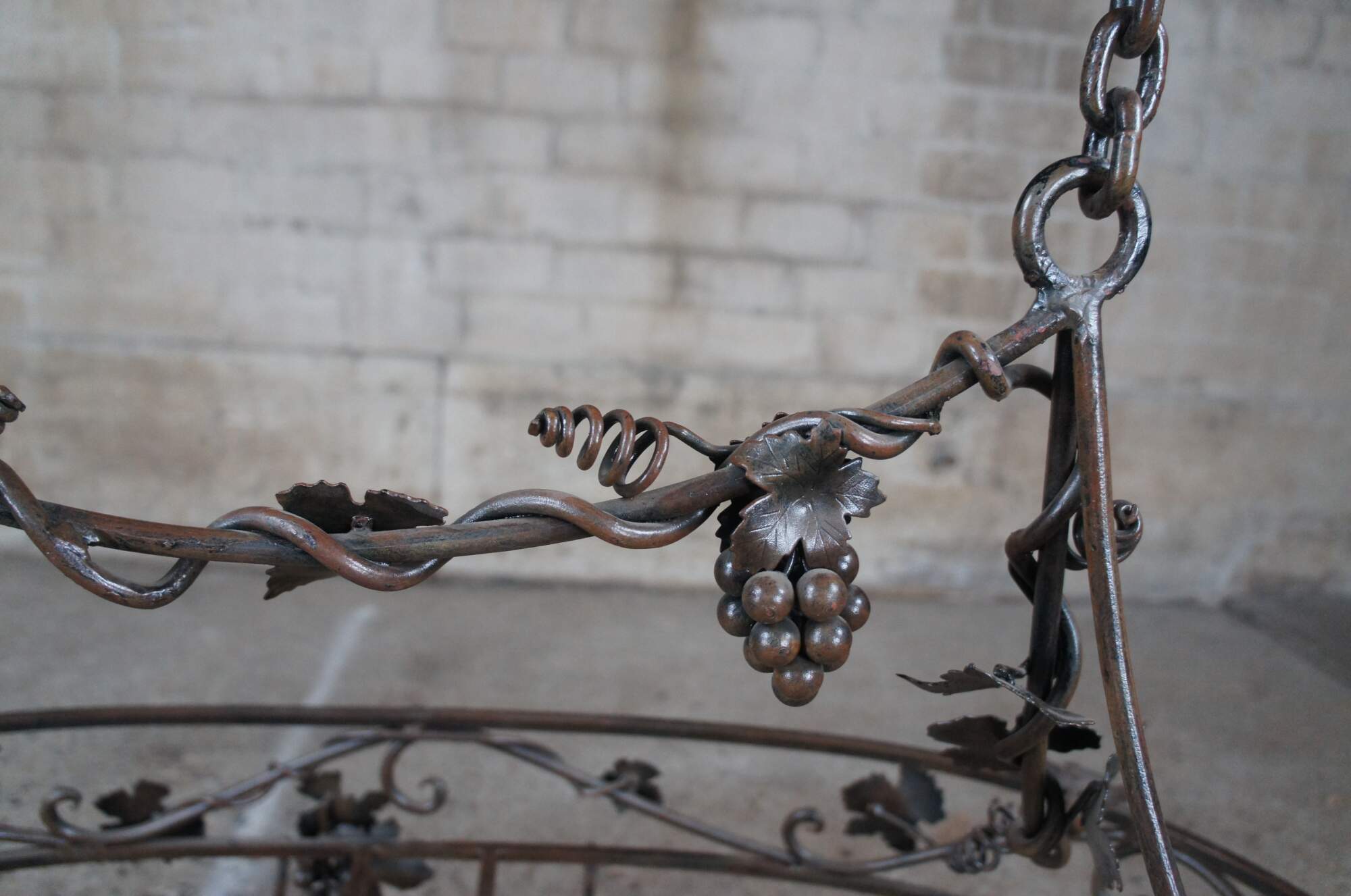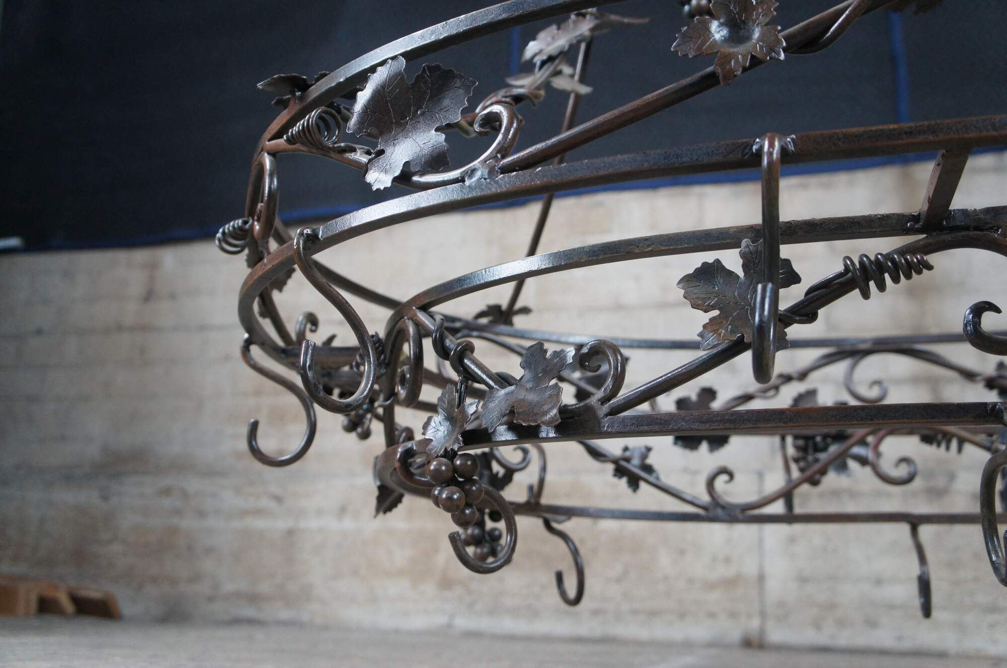 Late 20th century wrought iron pot rack featuring Tuscan grapevine and leaf / wine / Vineyard theme with stunning detail. Made in the Philippines.