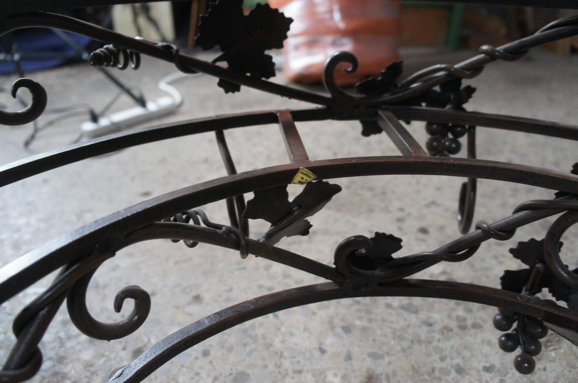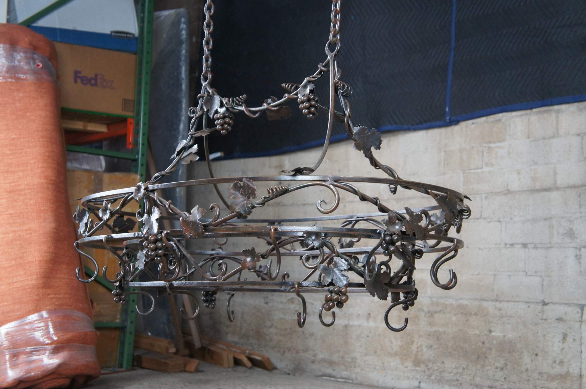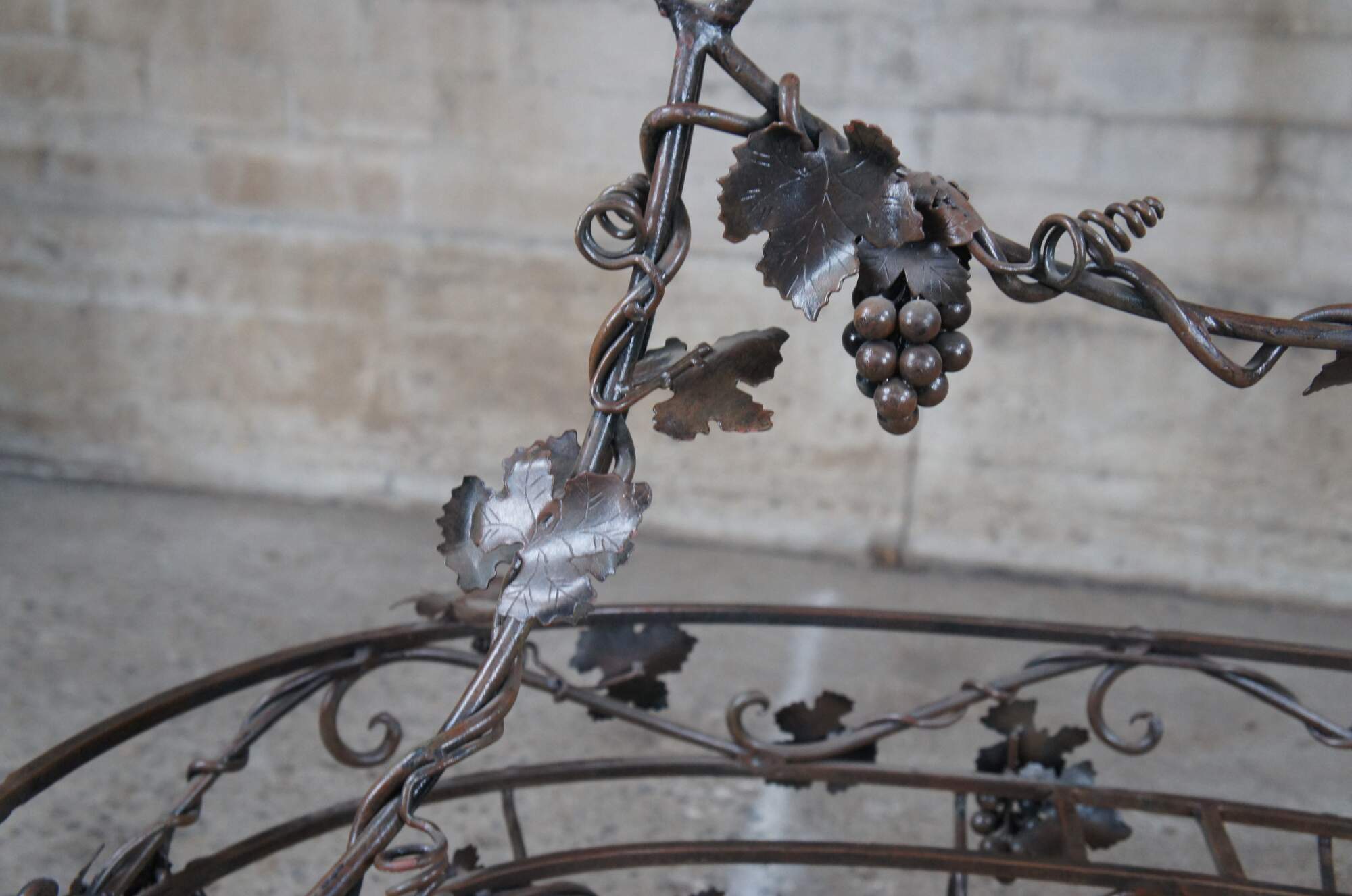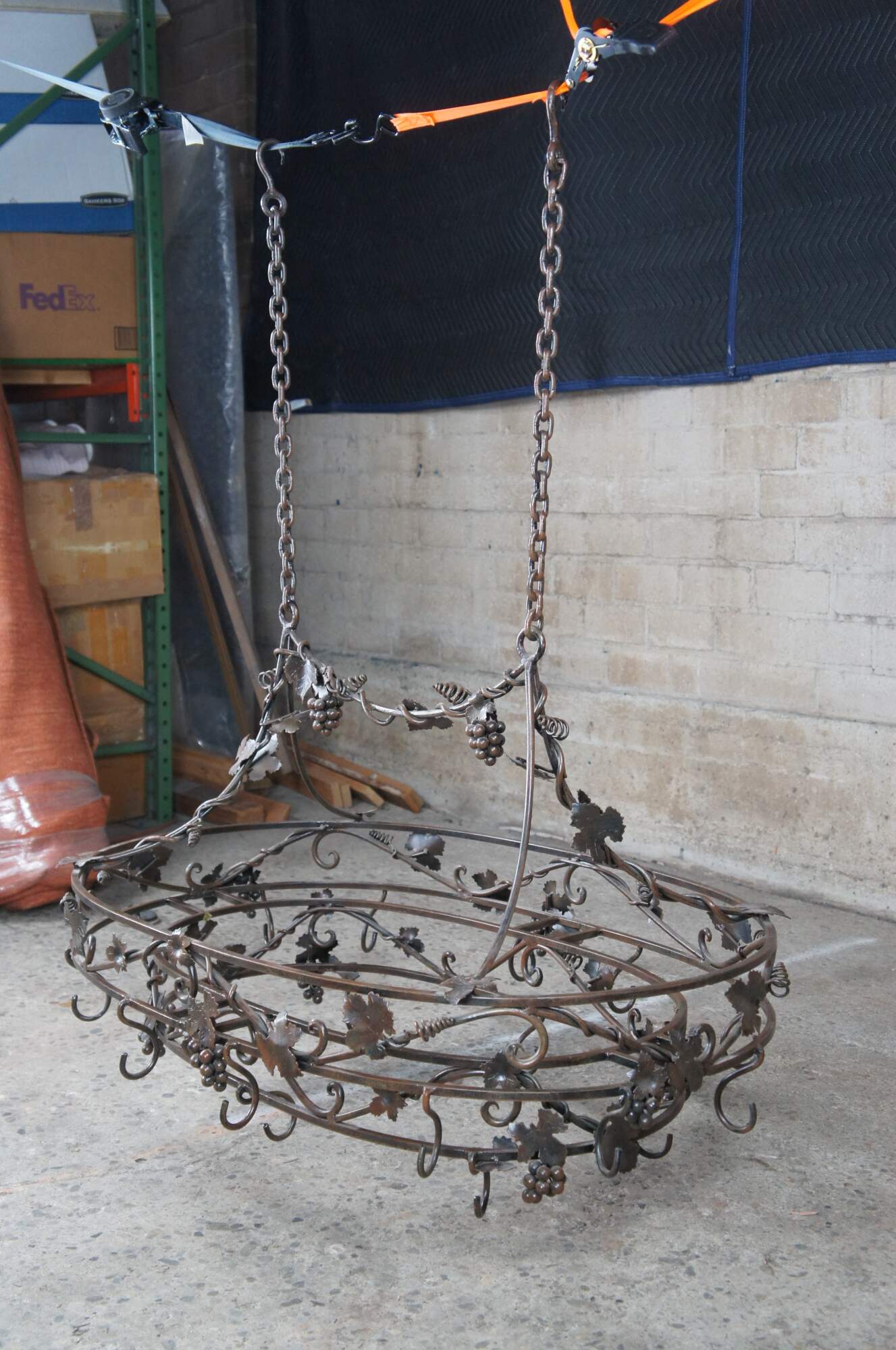Late 20th century wrought iron pot rack featuring Tuscan grapevine and leaf / wine / Vineyard theme with stunning detail. Made in the Philippines.