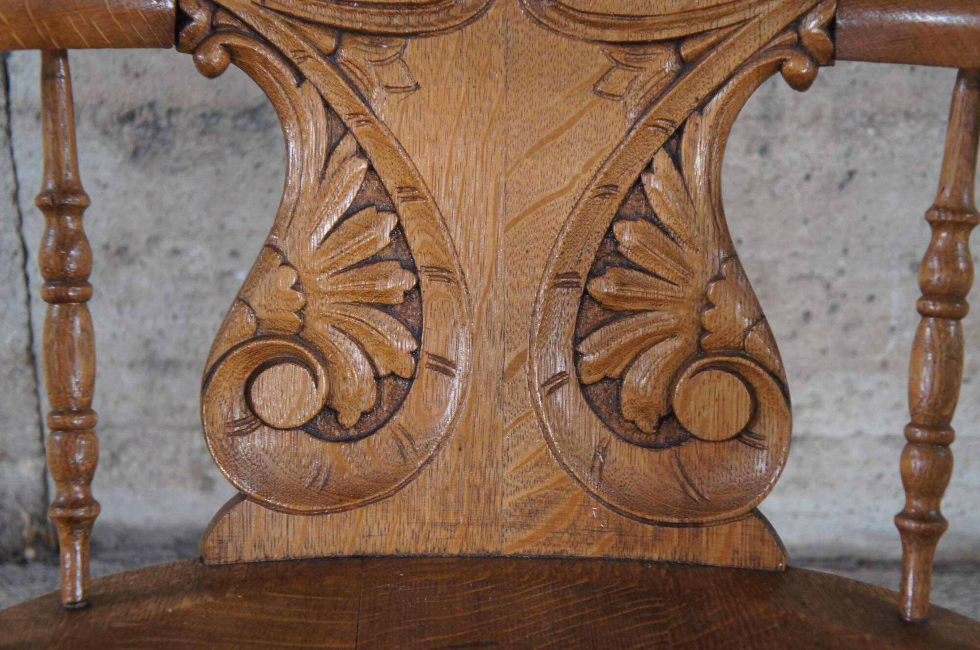 Late Victorian Rocking Chair. Attributed to Stomps Burkhardt of Dayton, Ohio. Made from quartersawn oak with a heart shaped back, carved and pierced with acanthus foliate and "C" scrolled splat. The chair has a barrel back form with turned spindle supports. Features a contoured seat and turned stretchers.