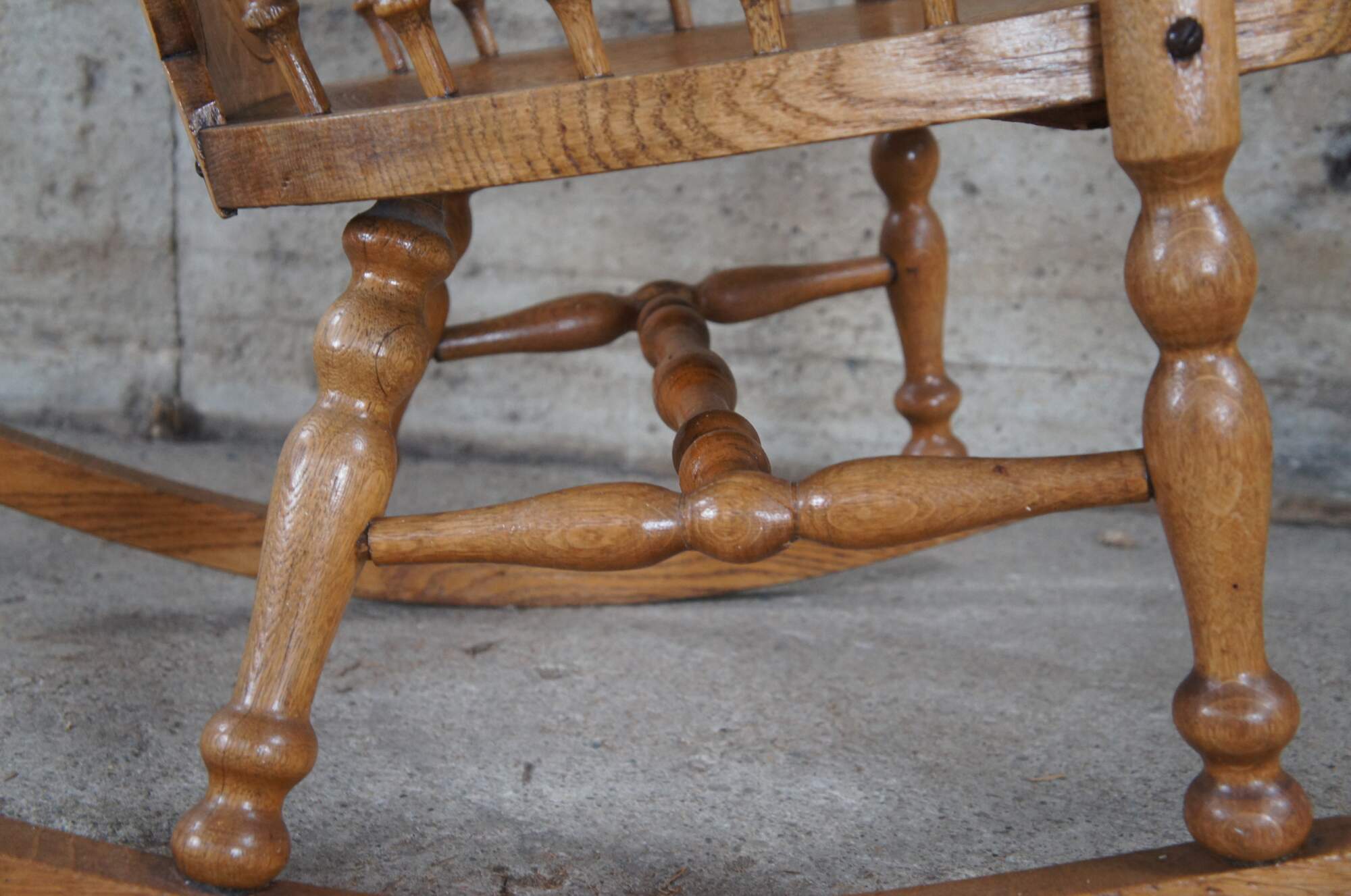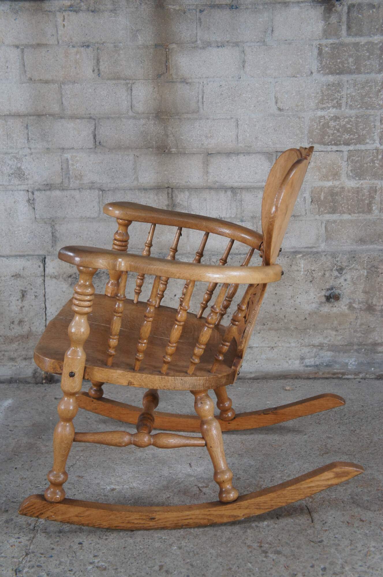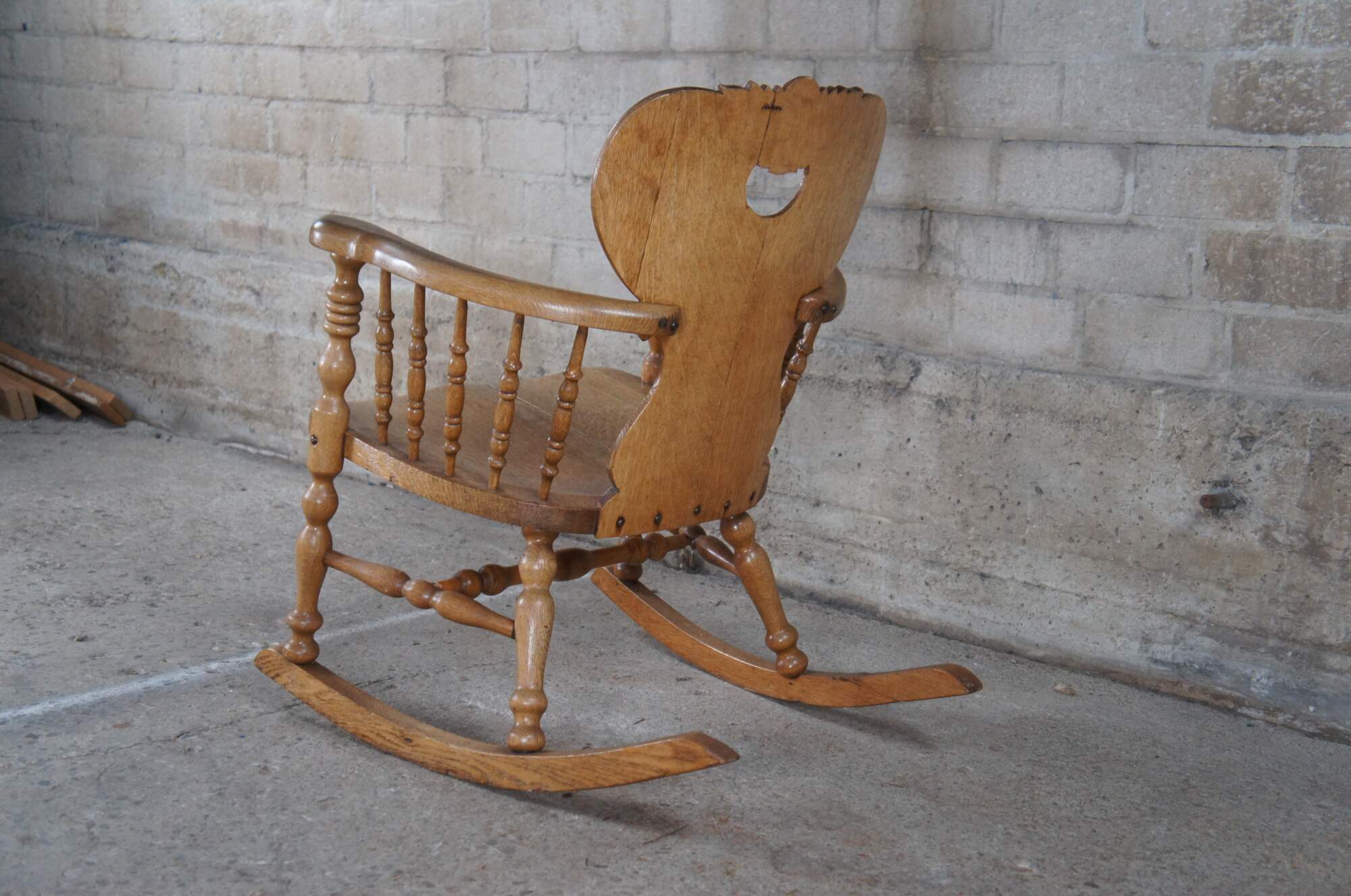 Good Condition with age and use related wear. Separation in seat board, glue residue along underside and past repair / split to rocker glider