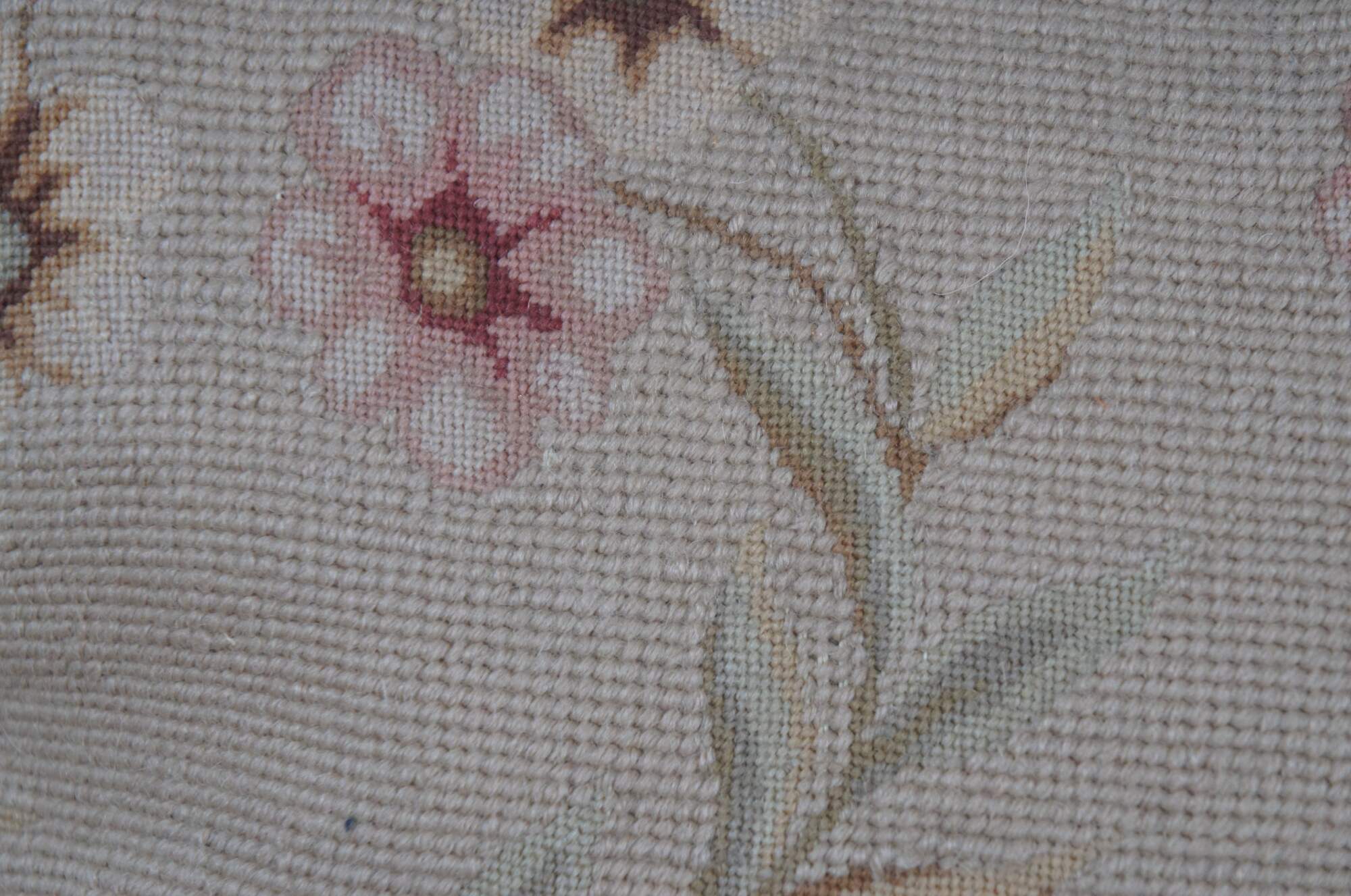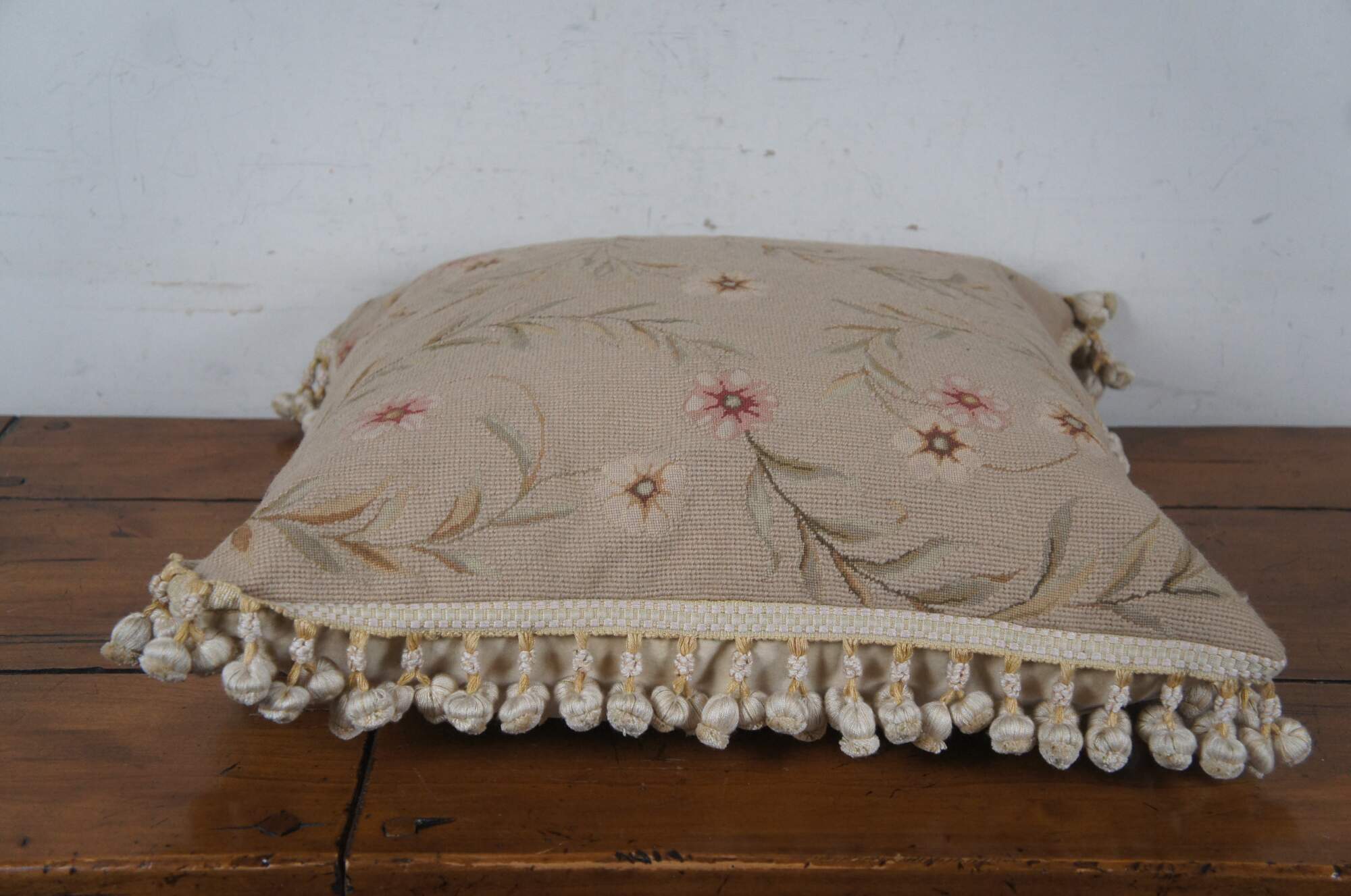 20th century square throw pillow, hand embroidered with pink and cream flowers on spiraling leafy stems, over a beige background. Cream and gold ball tassel trim. Cream velour back with zipper closure. Down filled.