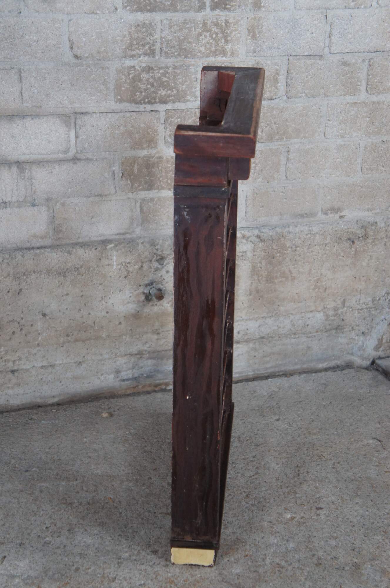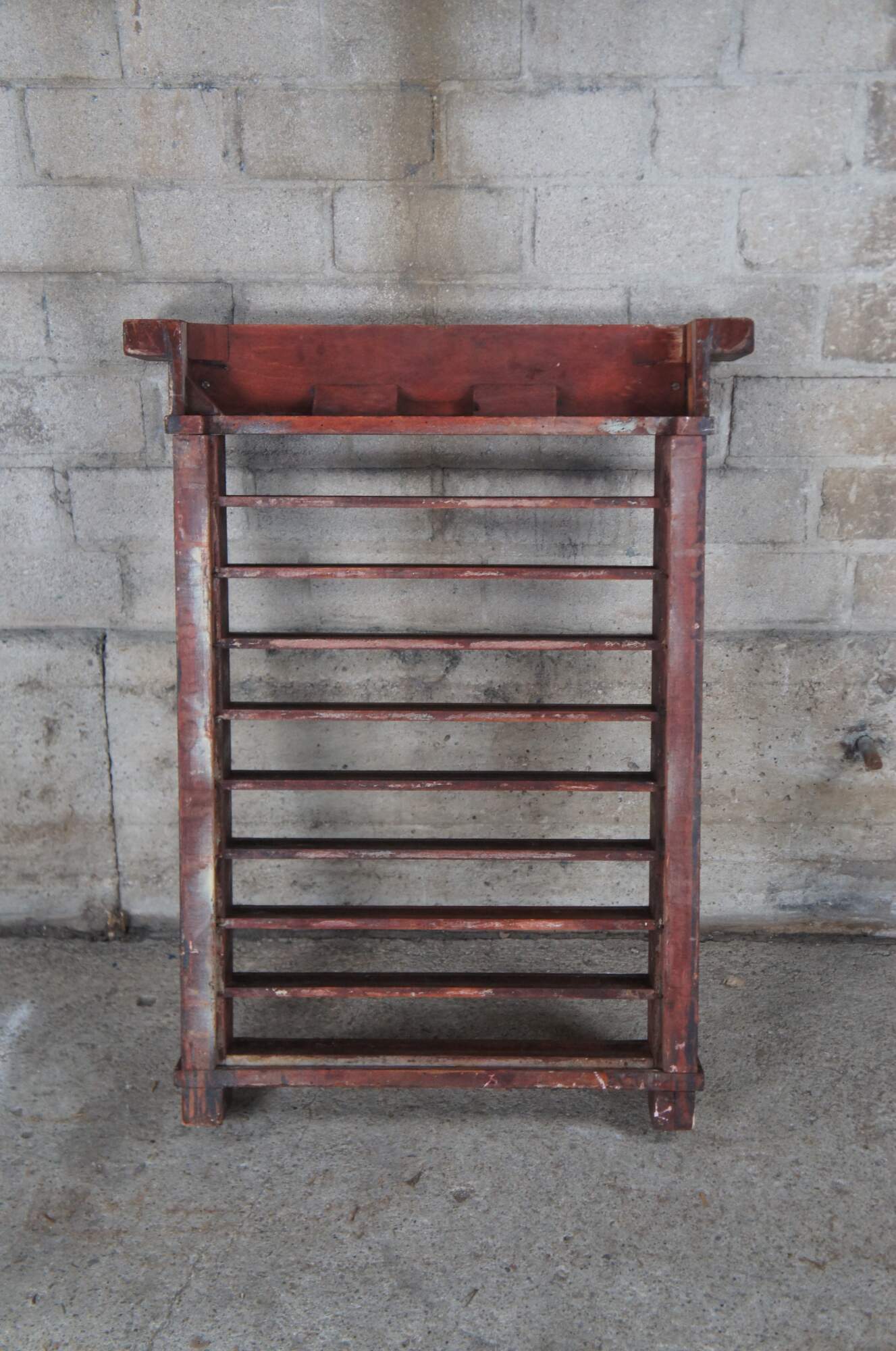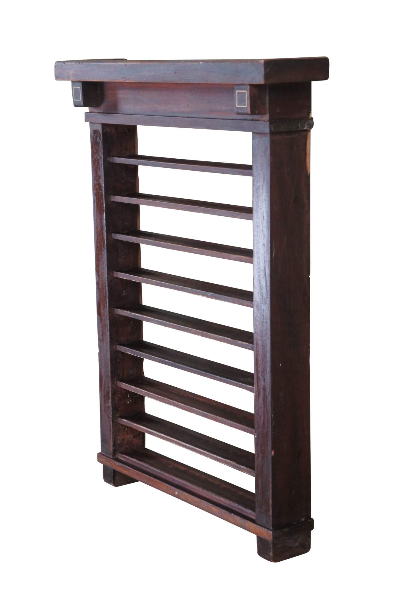 An antique wall mount pool ball rack. Made from mahogany with 9 shelves and a unique square inlay towards the top.