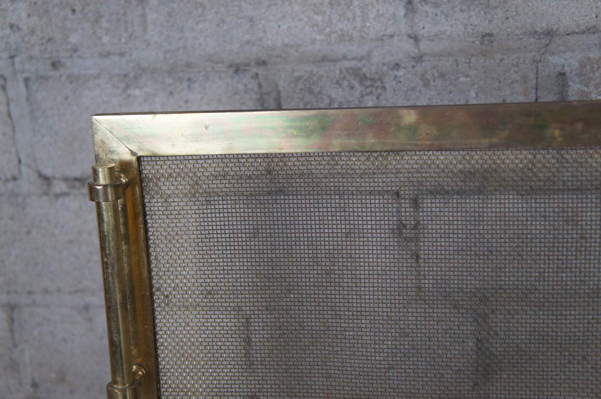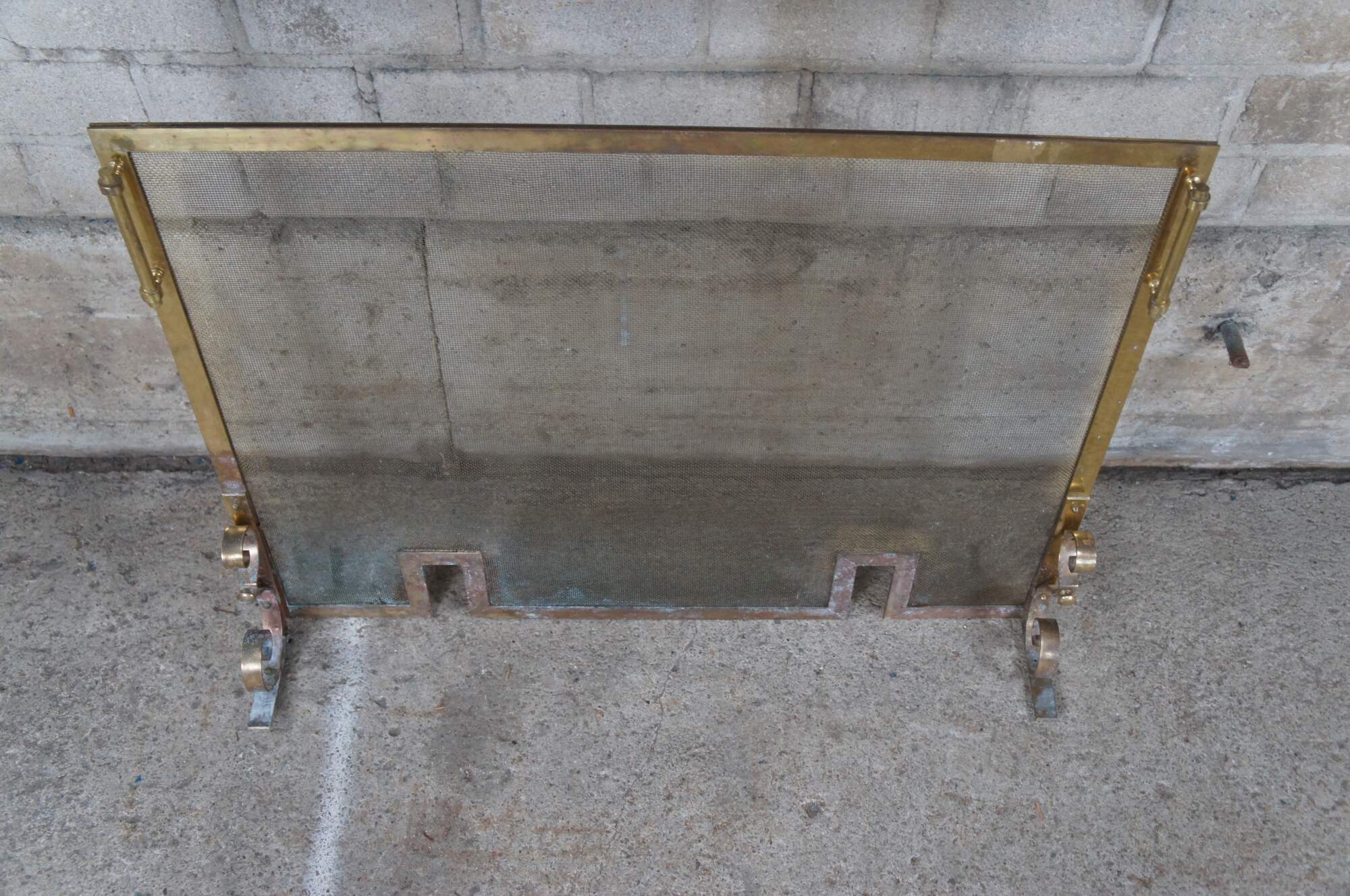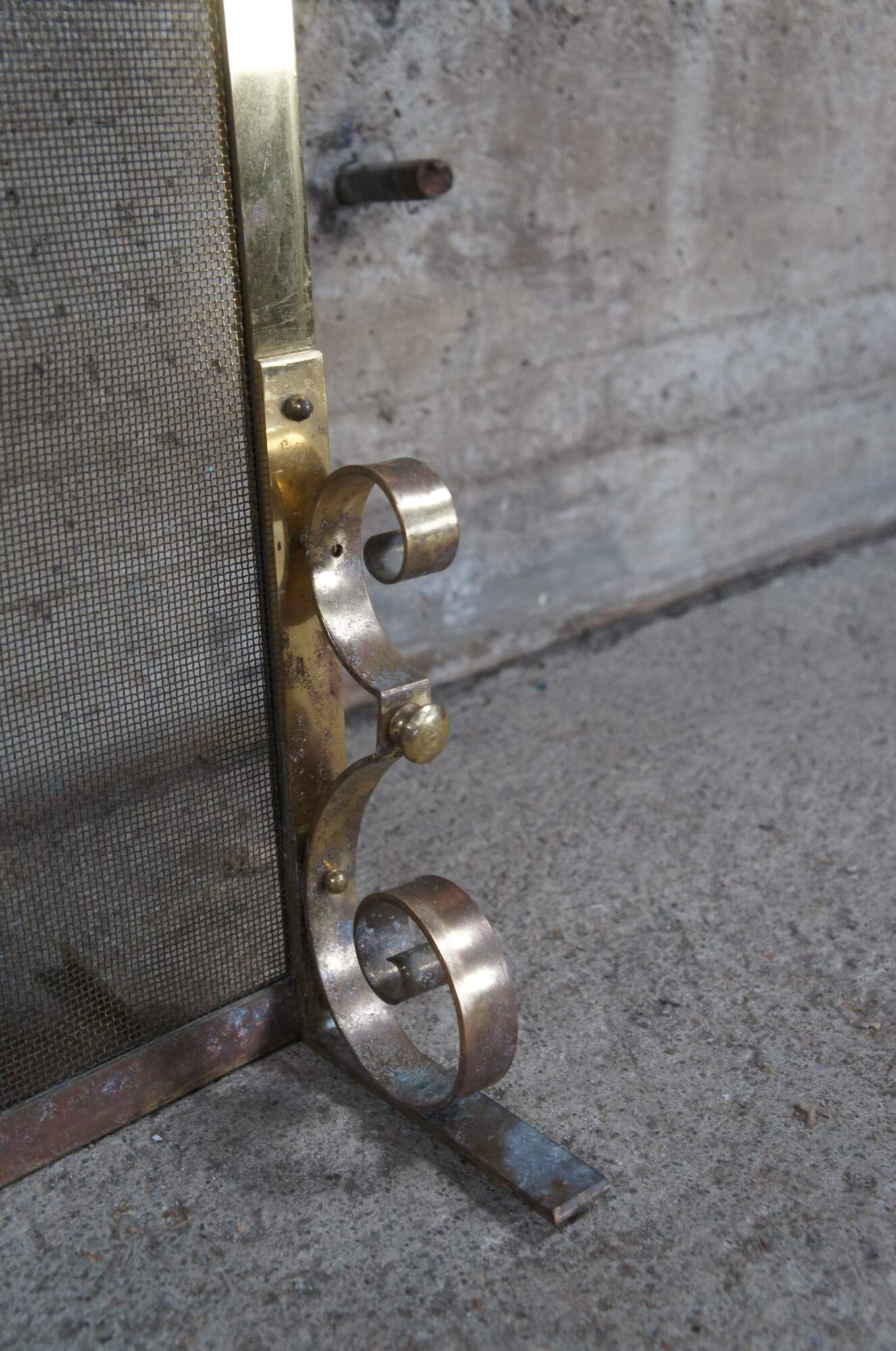 Vintage brass and mesh fire screen featuring Hollywood Regency styling with scrolled brass accents and slots for firedog andirons.