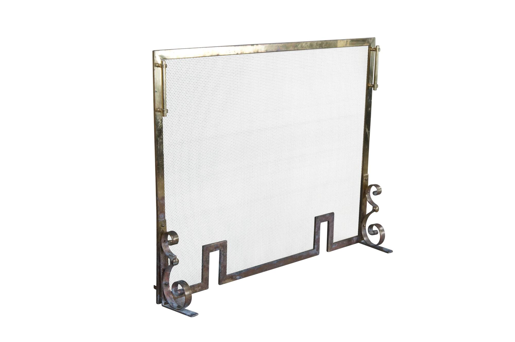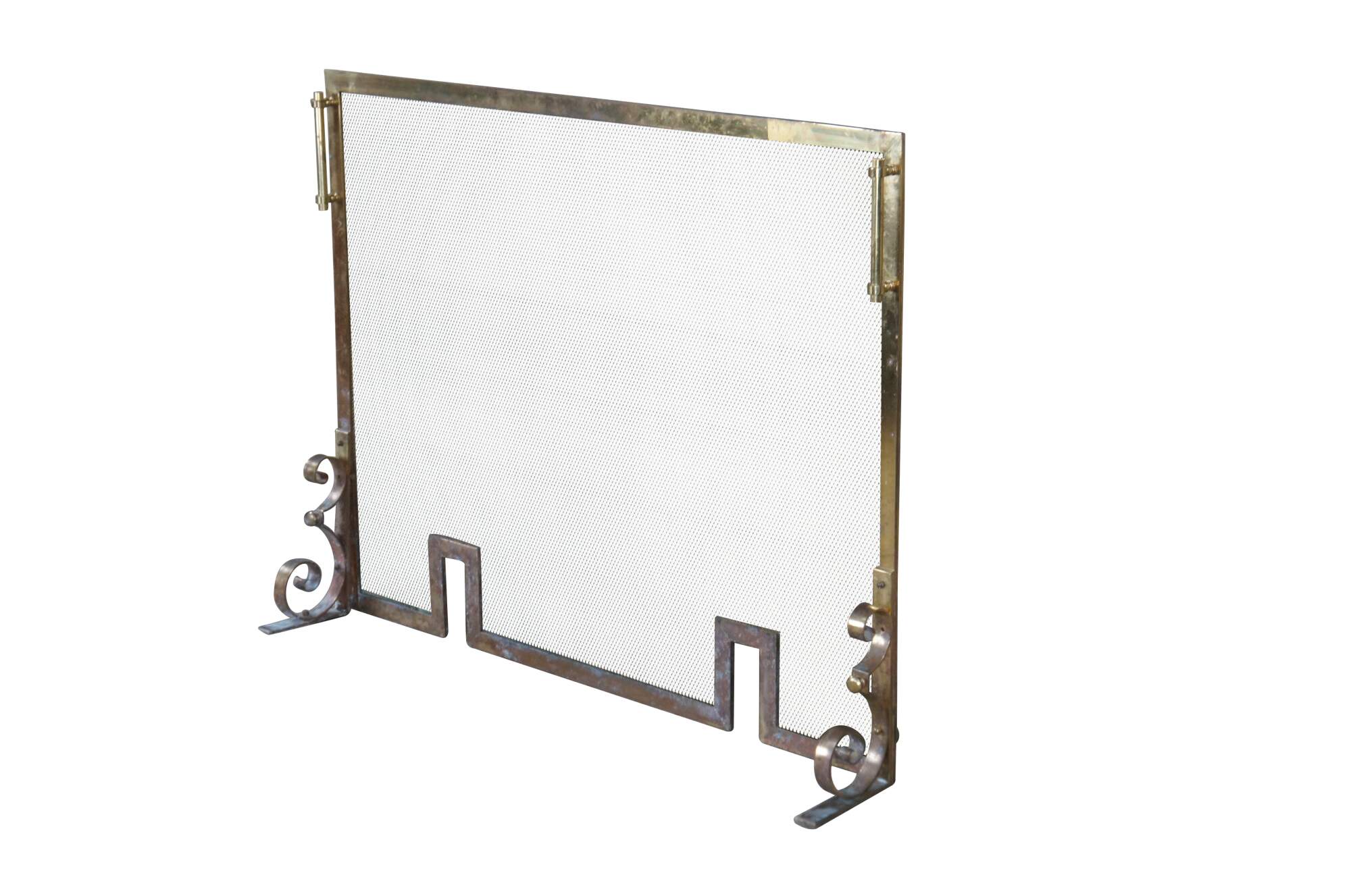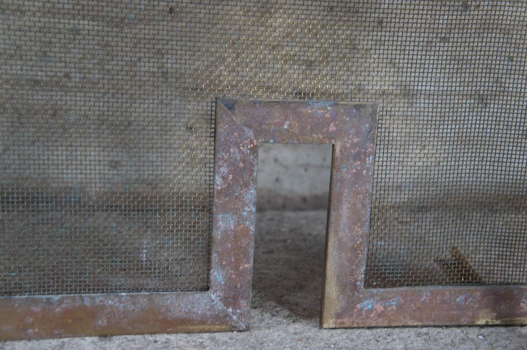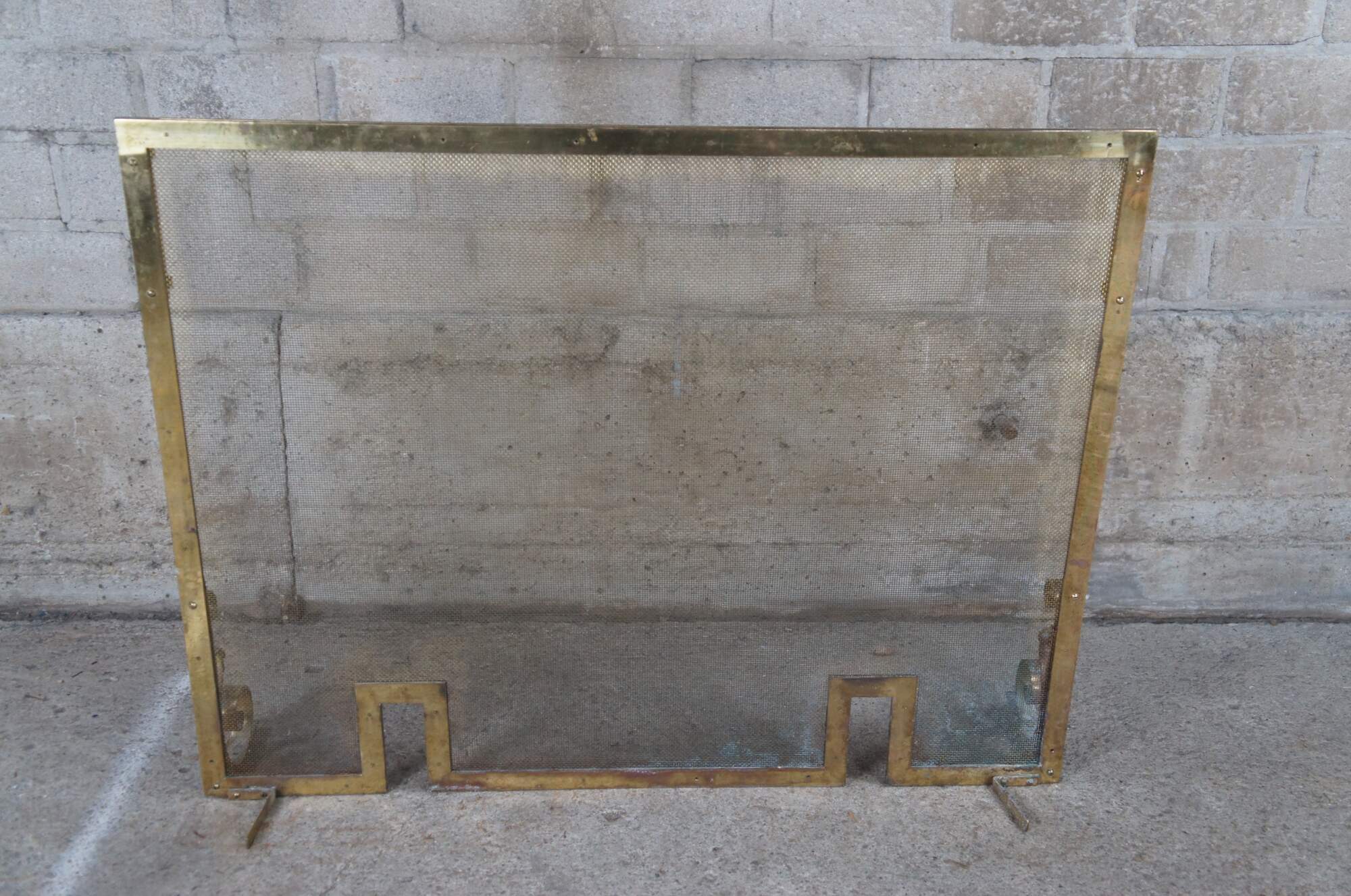 Vintage brass and mesh fire screen featuring Hollywood Regency styling with scrolled brass accents and slots for firedog andirons.