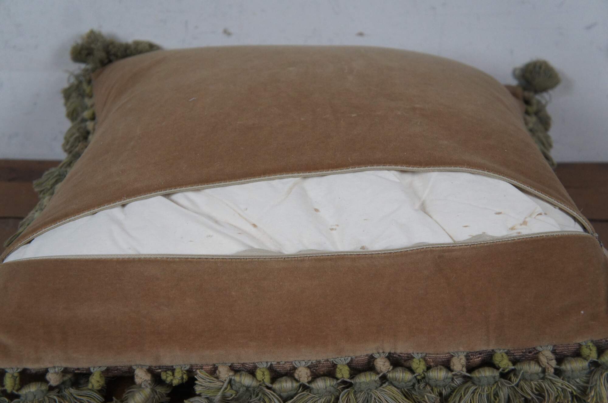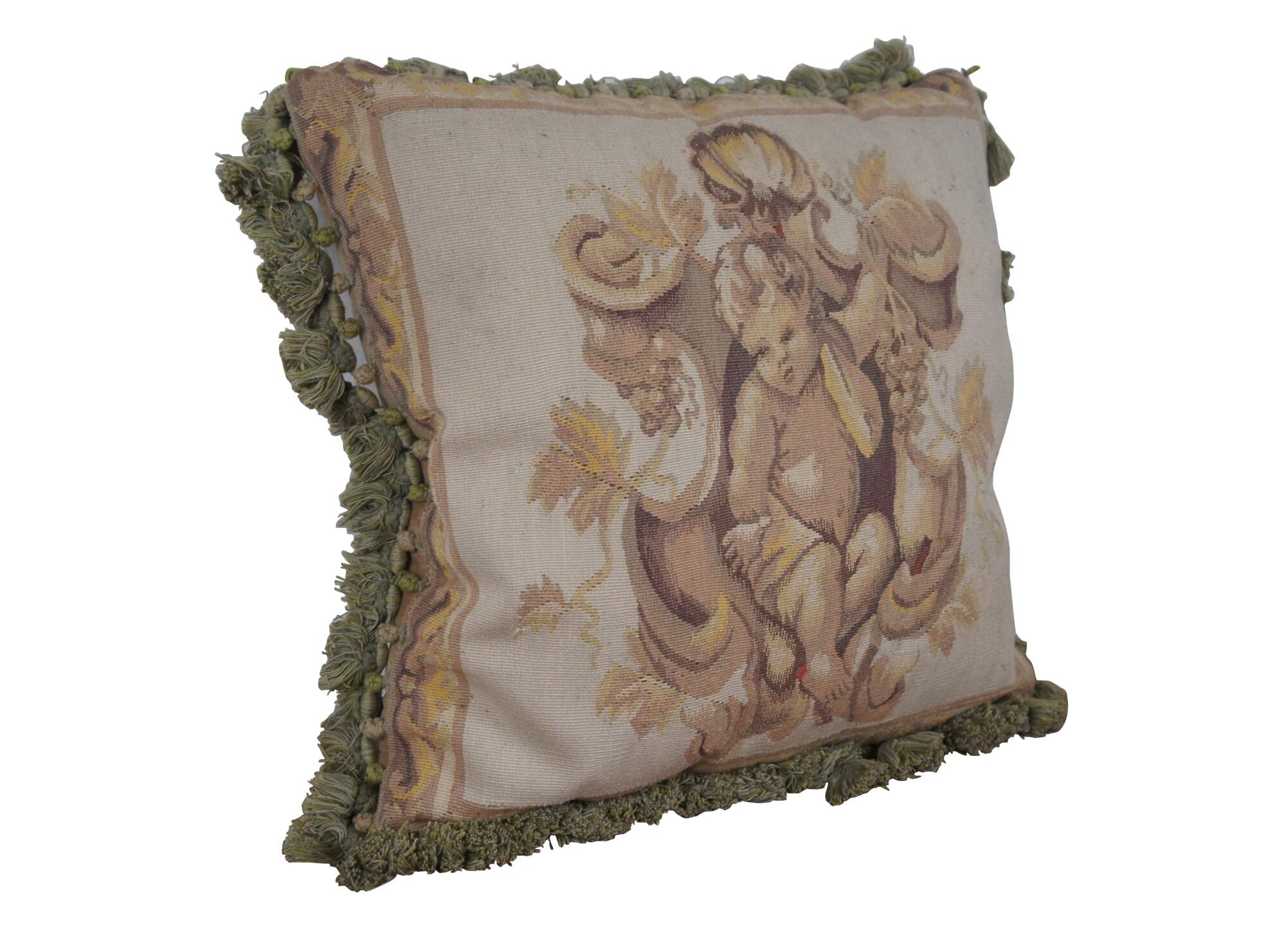 20th century square throw pillow, embroidered with a Renaissance style cherub perched in a scrolled edge frame, surrounded by a brown and gold foliate border. Blue and green tassel trim. Light brown velour back with zipper closure.