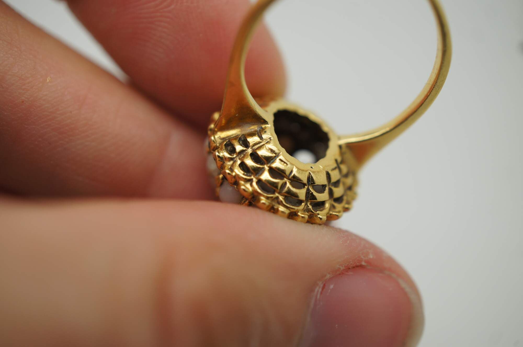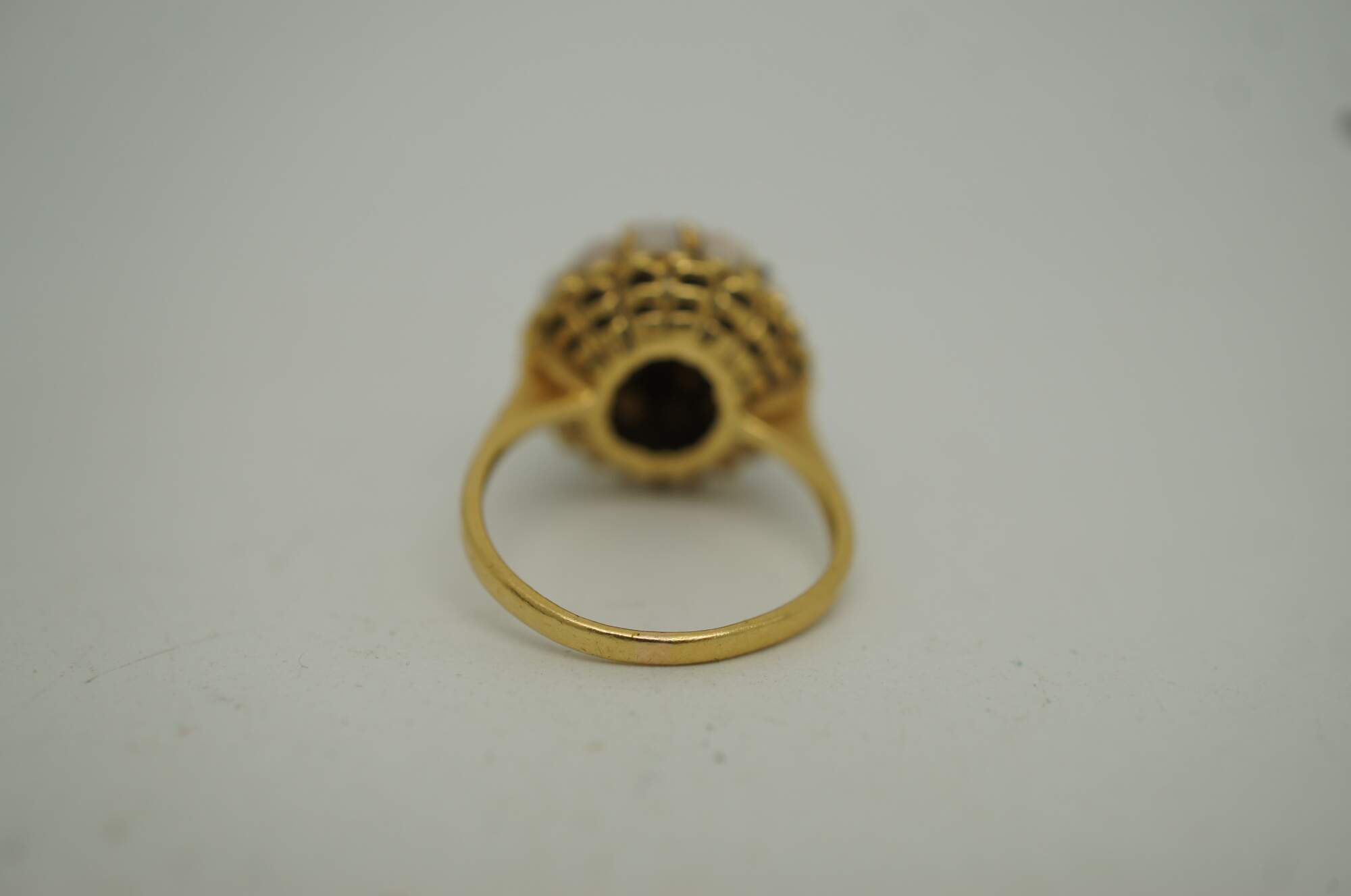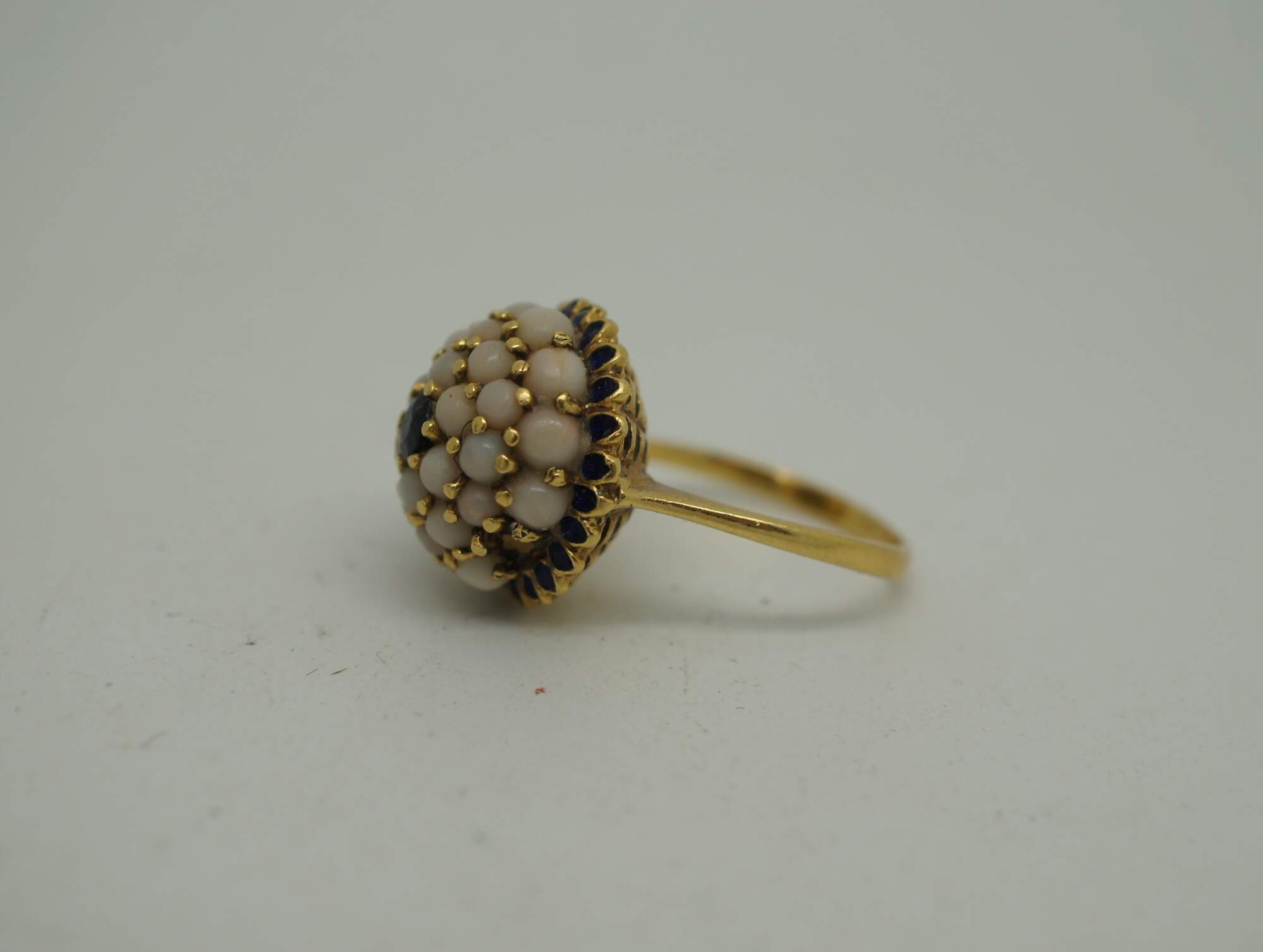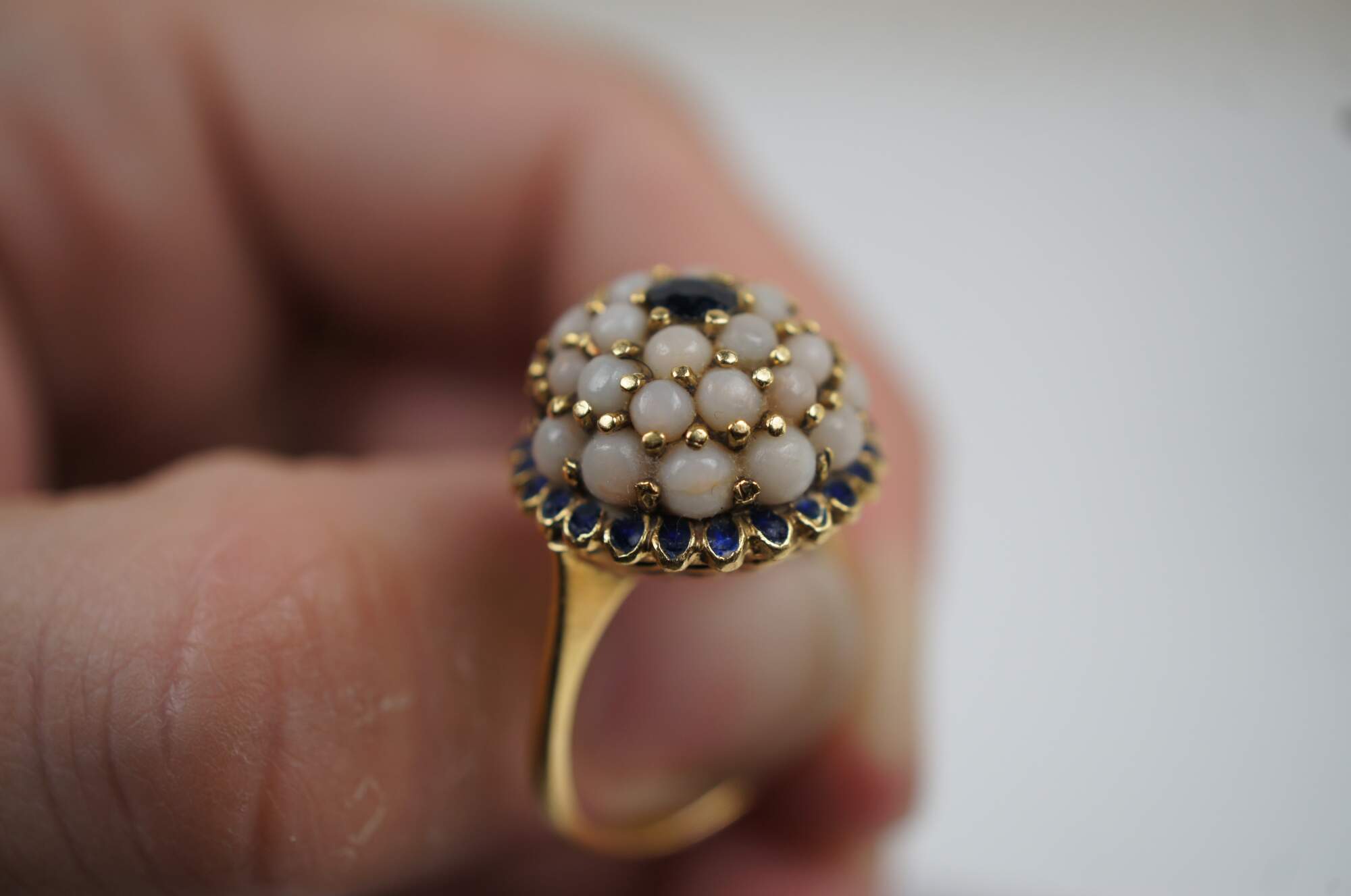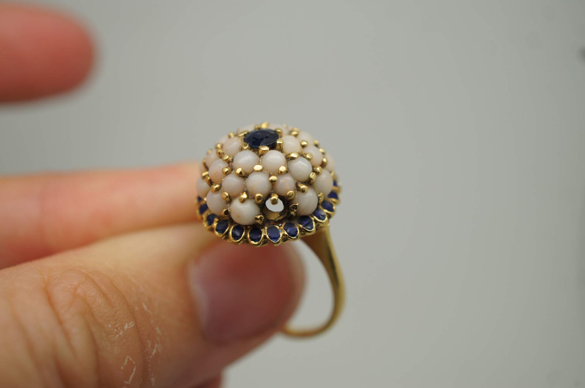 Vintage 18K yellow gold cocktail ring featuring a dome cluster of pearls with sapphire at the center and surrounding the base.