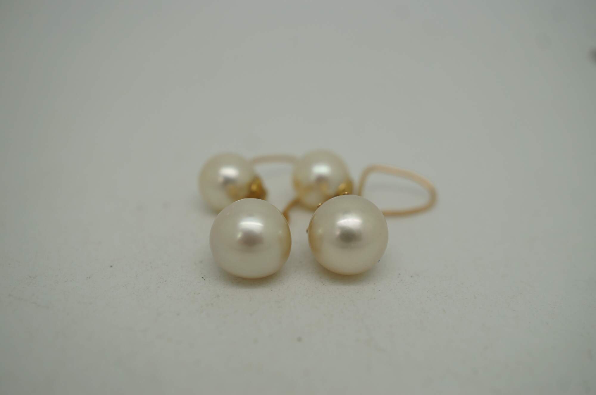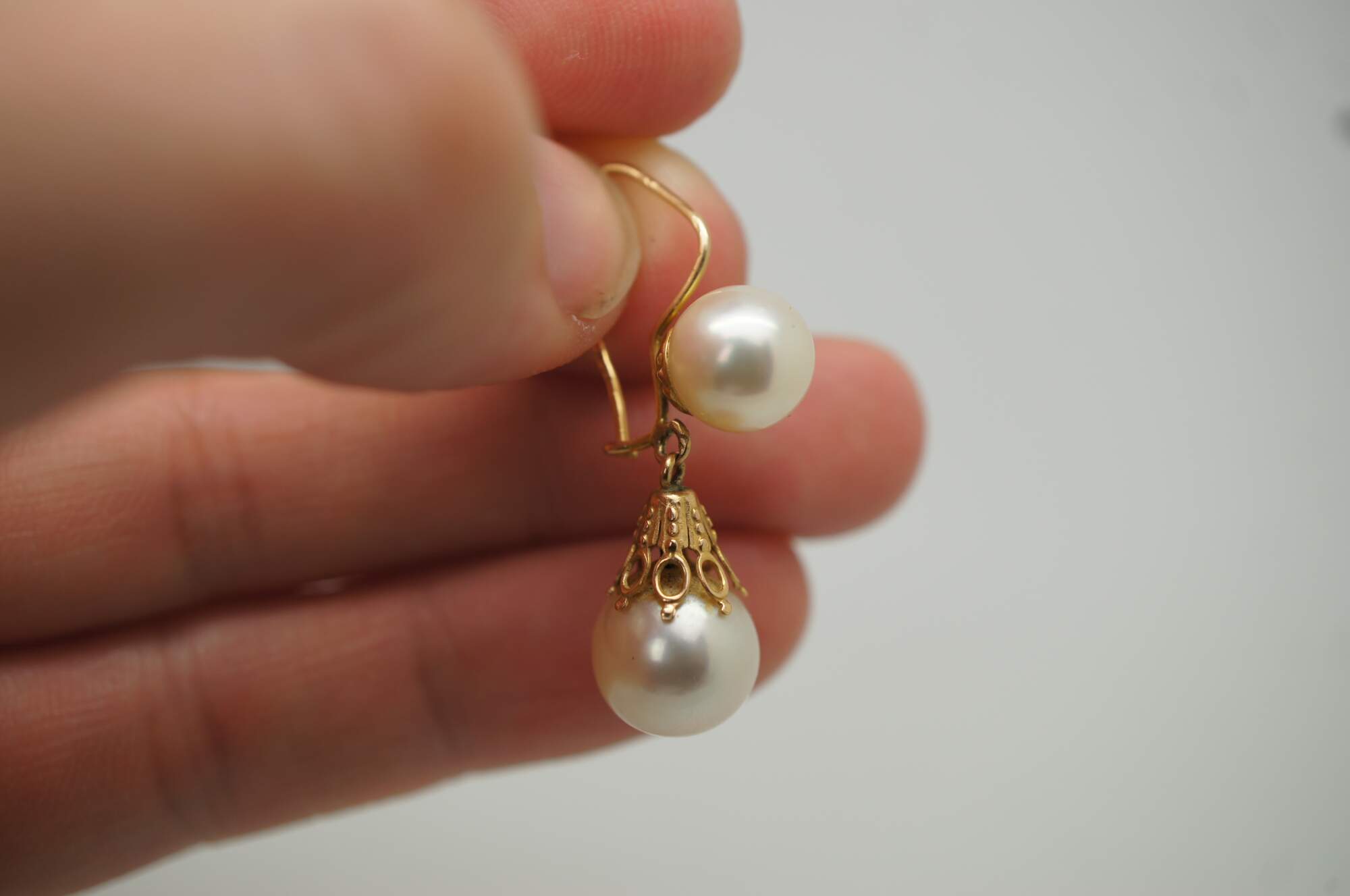 Circa mid 20th century 14K yellow gold two pearl dangle / drop earrings with locking fish hook style back.