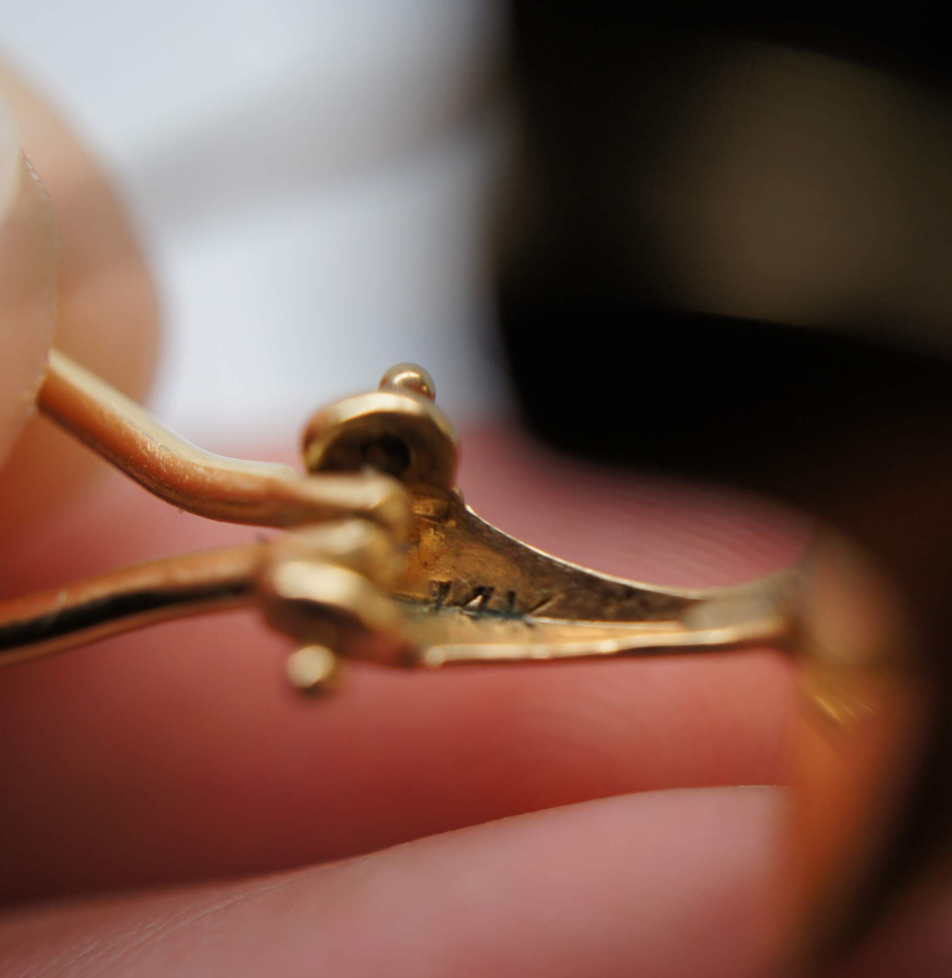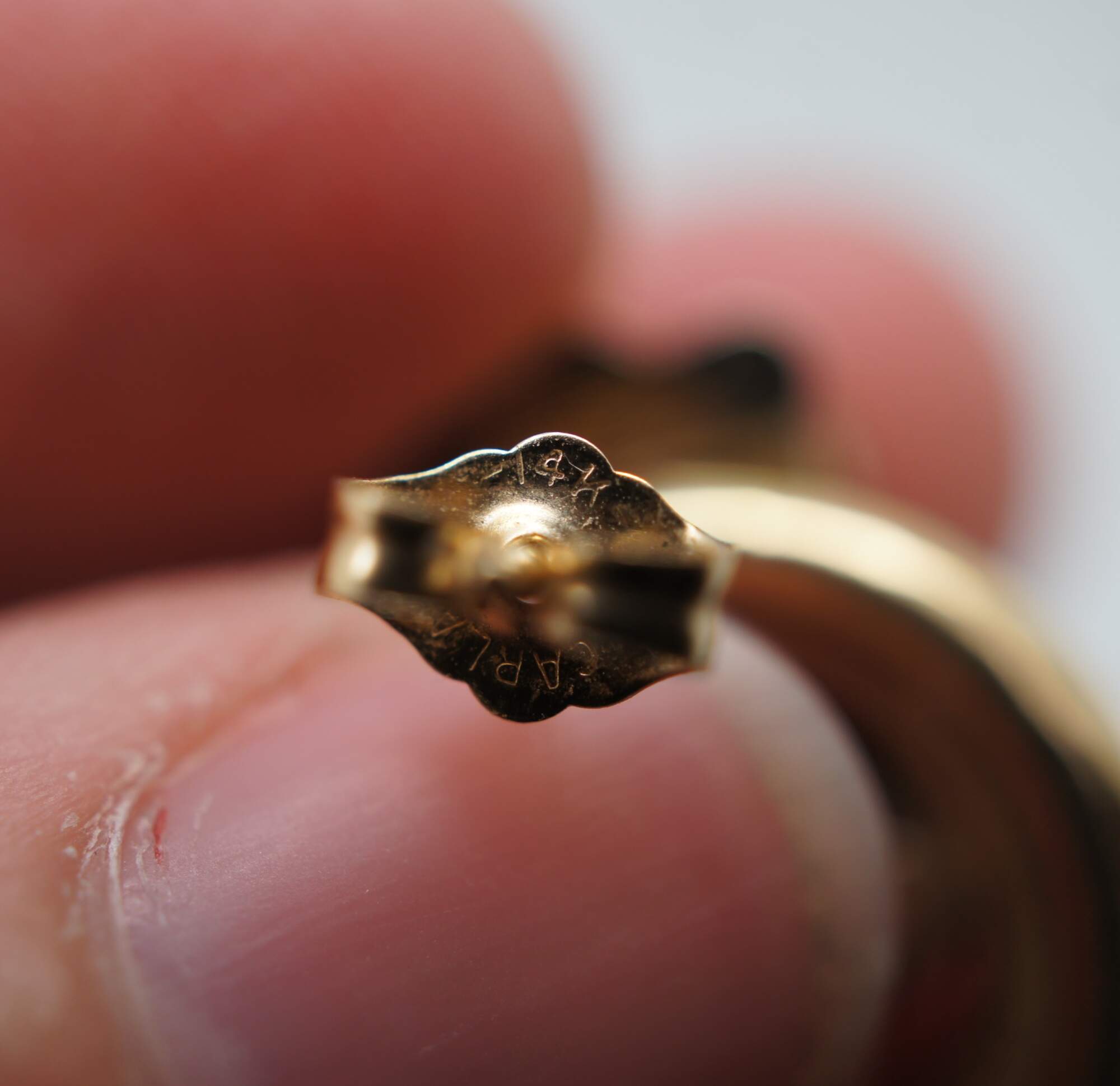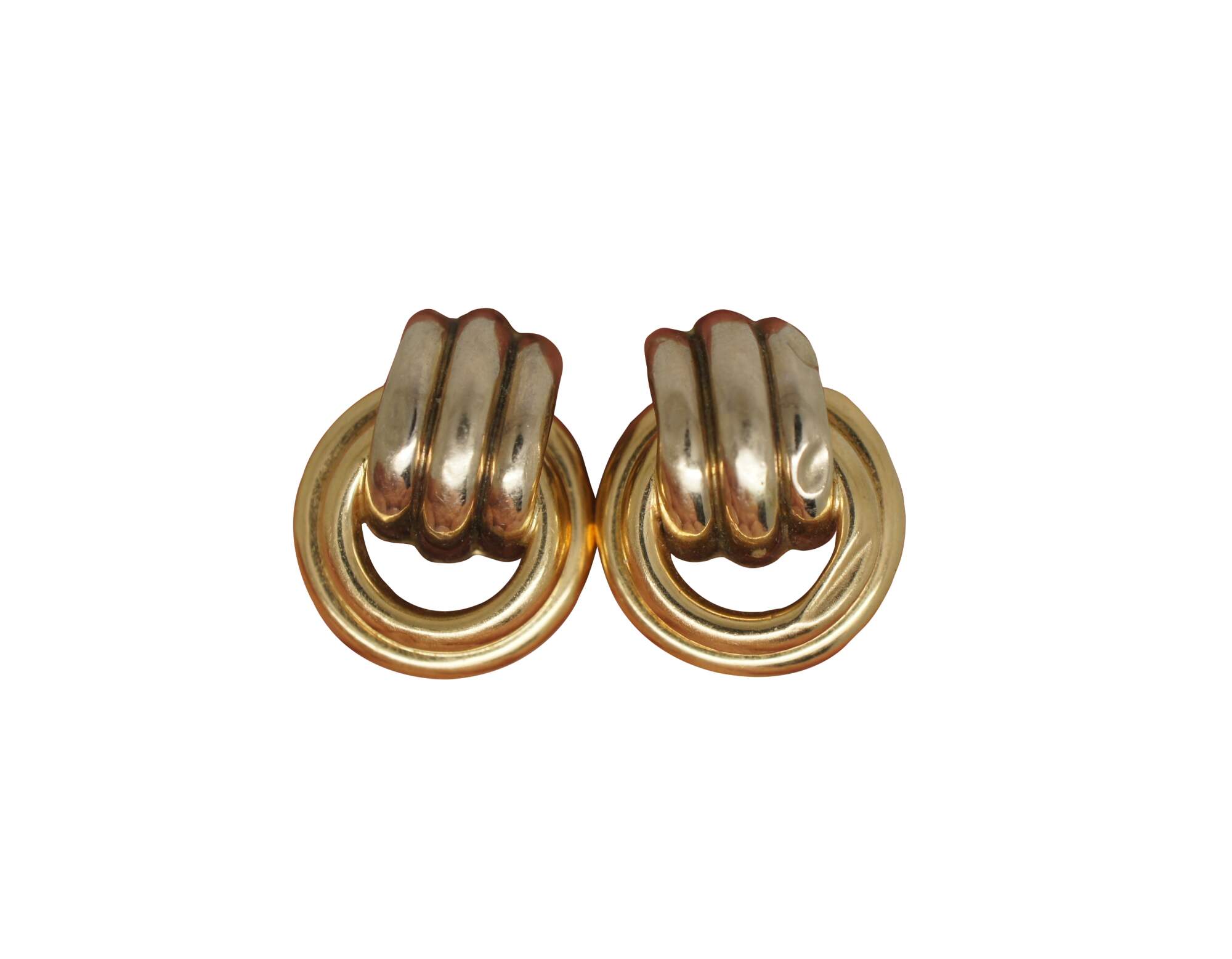 Three pairs of vintage hollow 14K yellow gold post back and clip on earrings - knot hoops, knot dome studs, and art deco style fleur de lis.