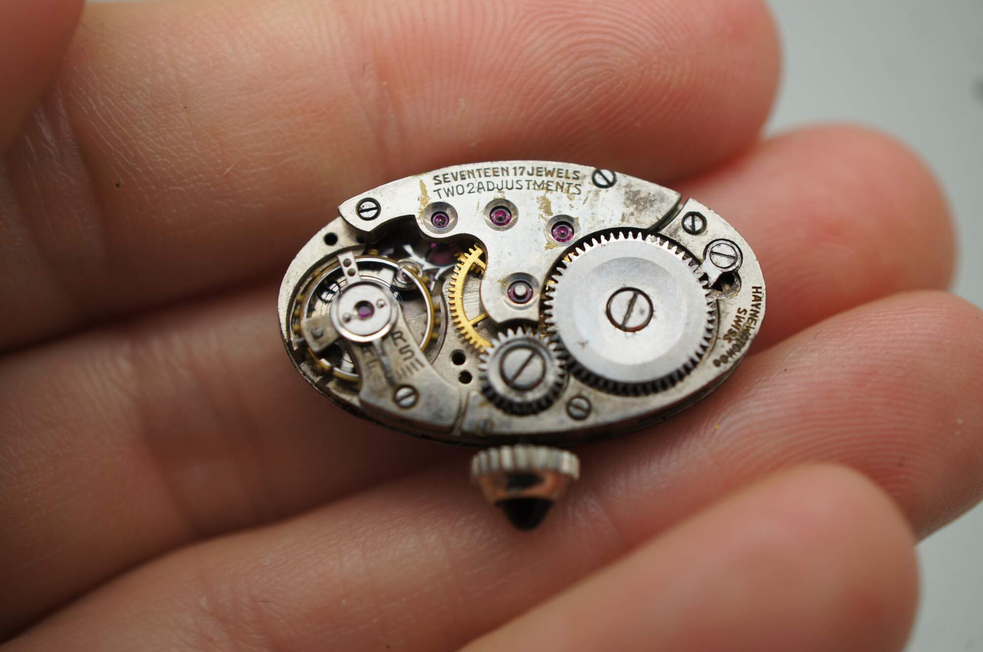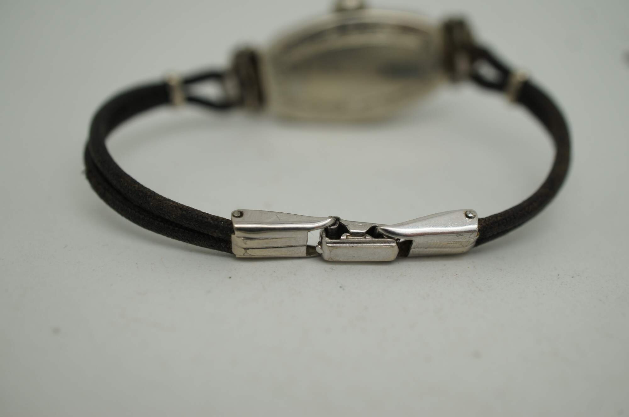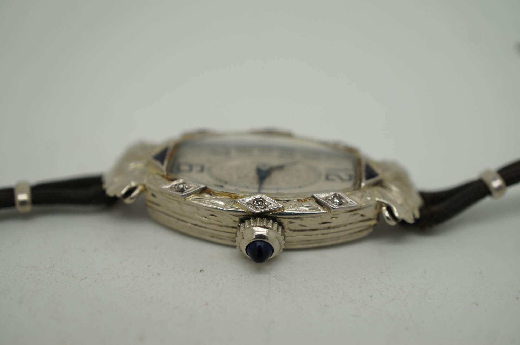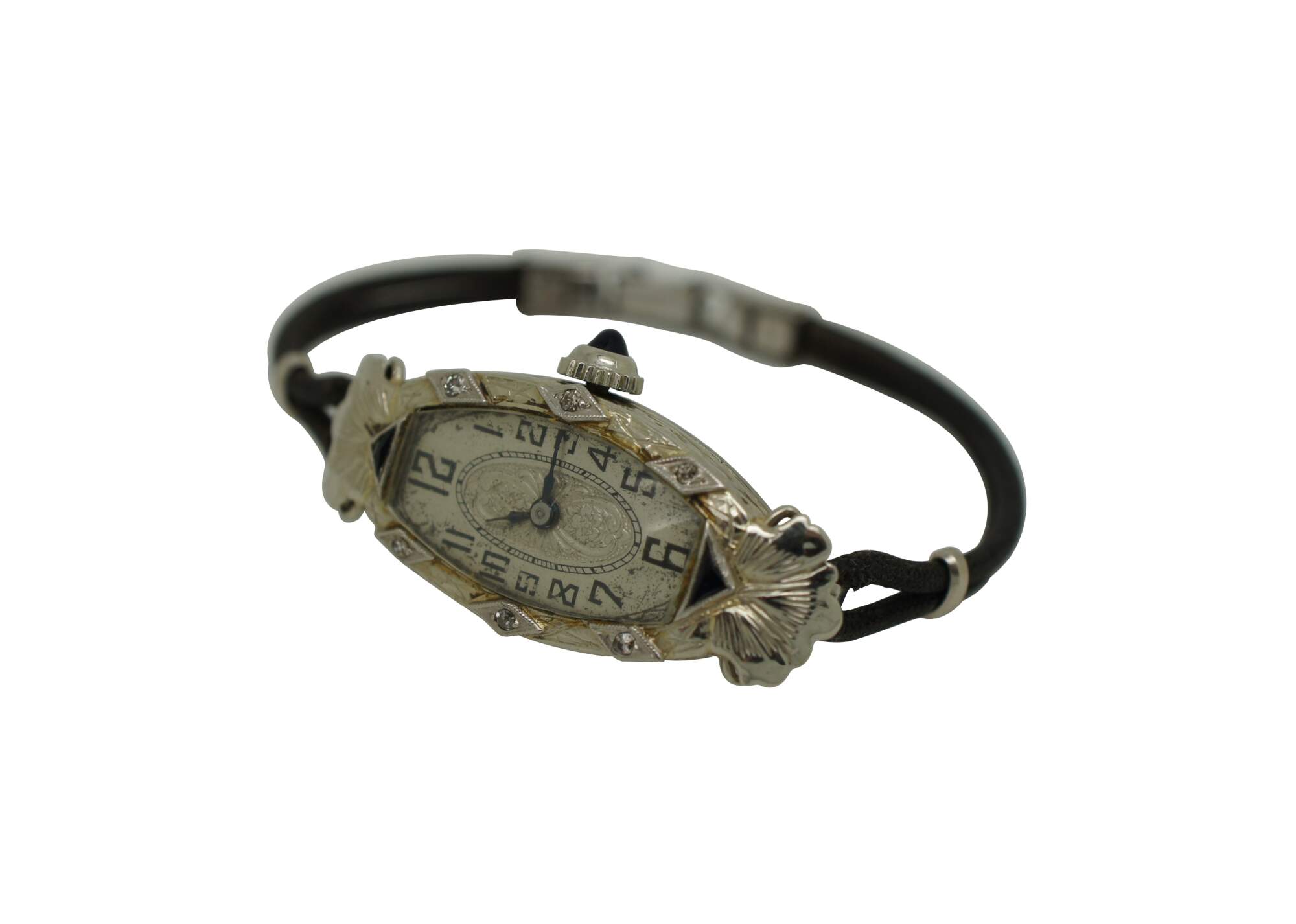 Circa 1920's ladie's art deco wrist watch by Hayne Watch Company, 17 jewels, Swiss works. Platinum Trim / 18K white gold case. Squared oval shape with intricate art deco styling - etched frame accented with diamond shapes and set with 6 white diamonds, ends capped with scallops and triangular cut cobalt blue sapphires. Silver tone face with etched border and floral center with black Arabic numerals and iridescent blue hands. Cobalt blue stone on knob. Black cord band. Jewelry clasp marked Kreisler 025.