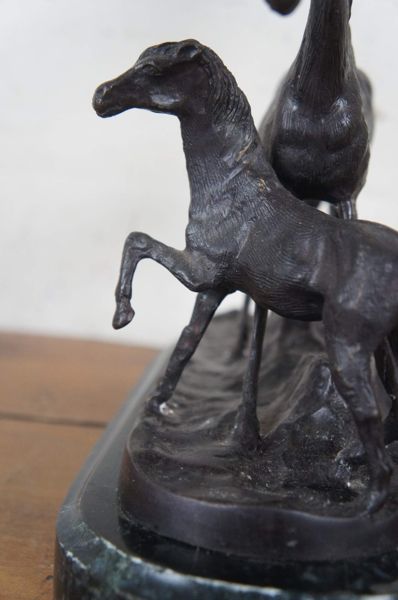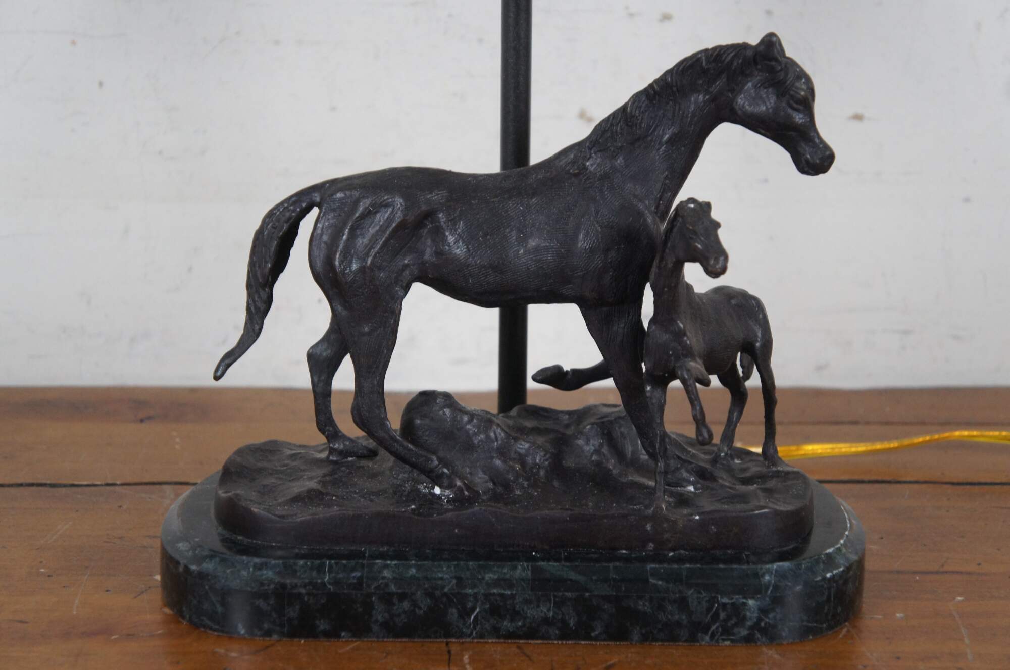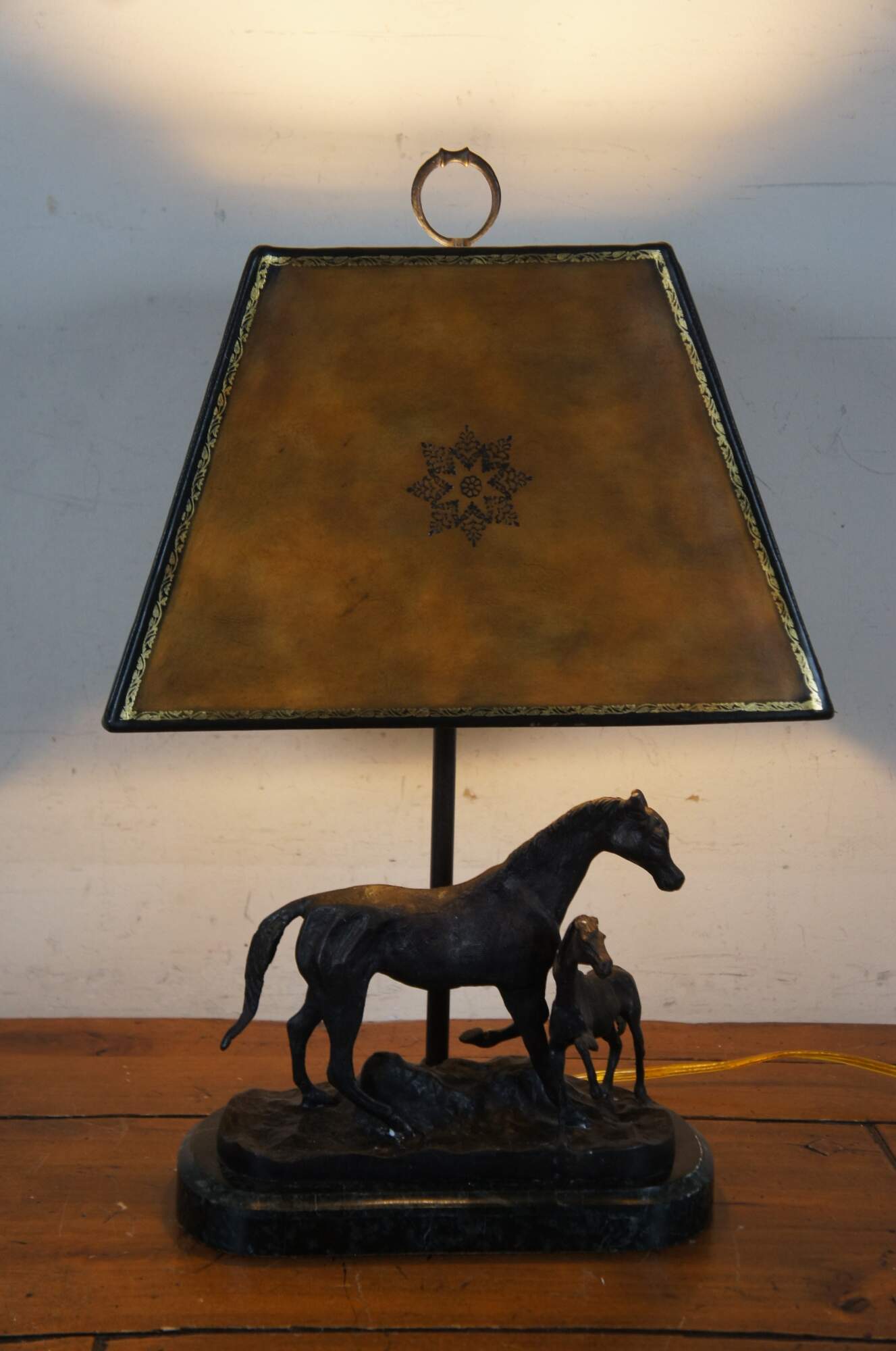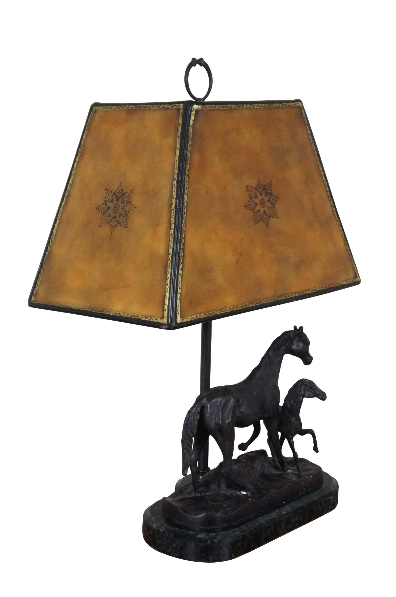 Late 20th century figural horse bronze table lamp by Maitland Smith featuring a mare and foal in tableau on a charcoal black marble clad base. Includes hard and rectangular tooled / gilded leather shade with foiled interior. Horse bit shaped finial. Hand made in Philippines.