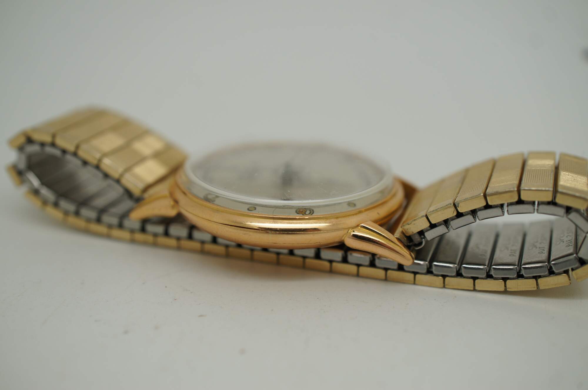 Rare early to mid 20th century Hafis art deco mechanical wrist watch with Incabloc shock protection system. 18K yellow gold case, 0,0750 fineness, serial number 202743. Hammer head shaped Swiss Poinçons de Maître mark, registration number 102 - indicates the case was made by Amez-Droz & Cie / Boîtes de montres Zéma (Zema Watch Boxes) / Jean Born. Silver tone face with gilt painted Arabic numerals and enumerated seconds. Spear shaped hands accented with glow-in-the-dark paint. Currently on a Speidel stretch link band with 10K gold filled top caps. Silver tone face with gilt panted Arabic numerals and enumerated seconds. Spear shaped hands accented with glow-in-the-dark paint.