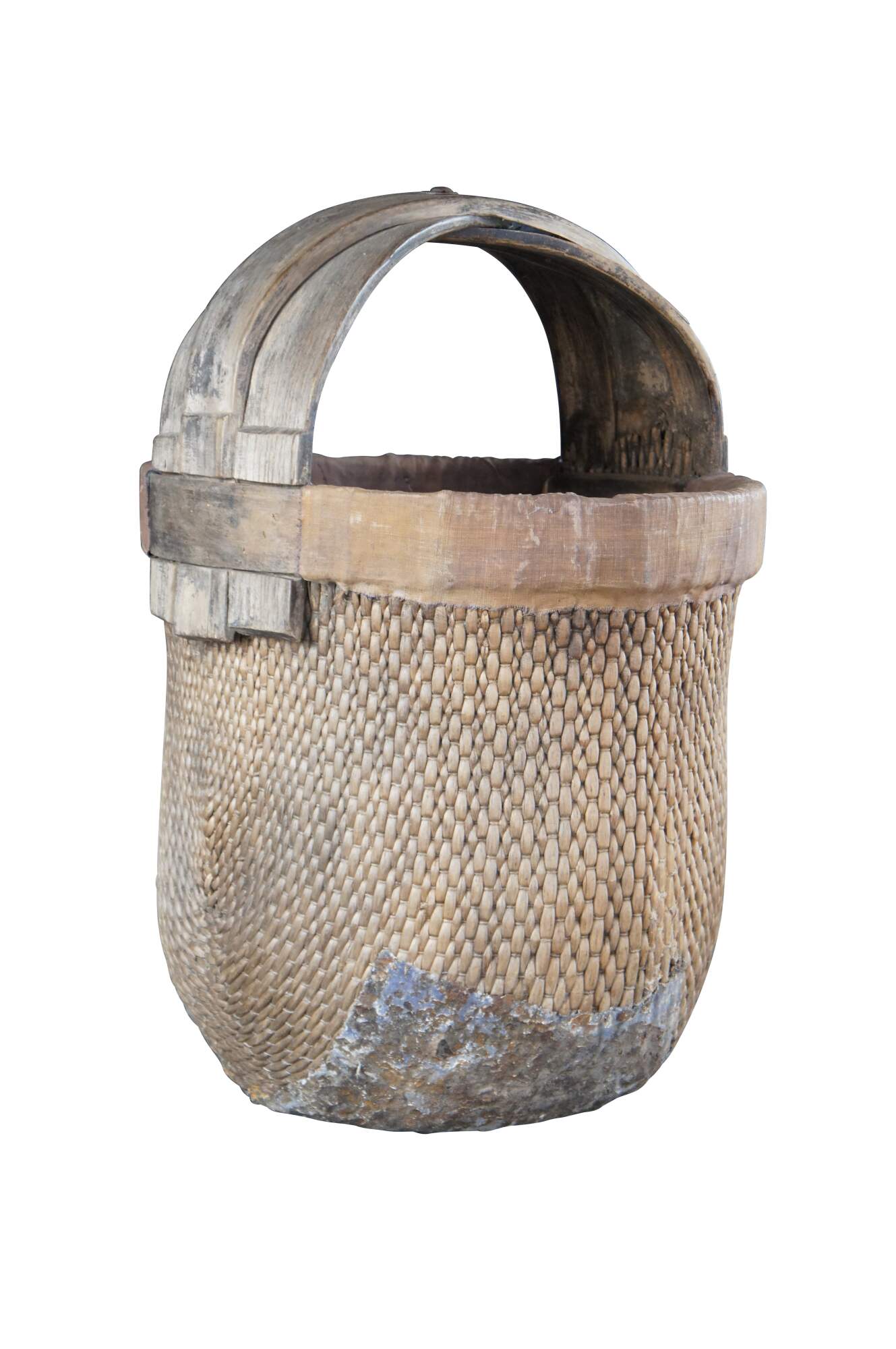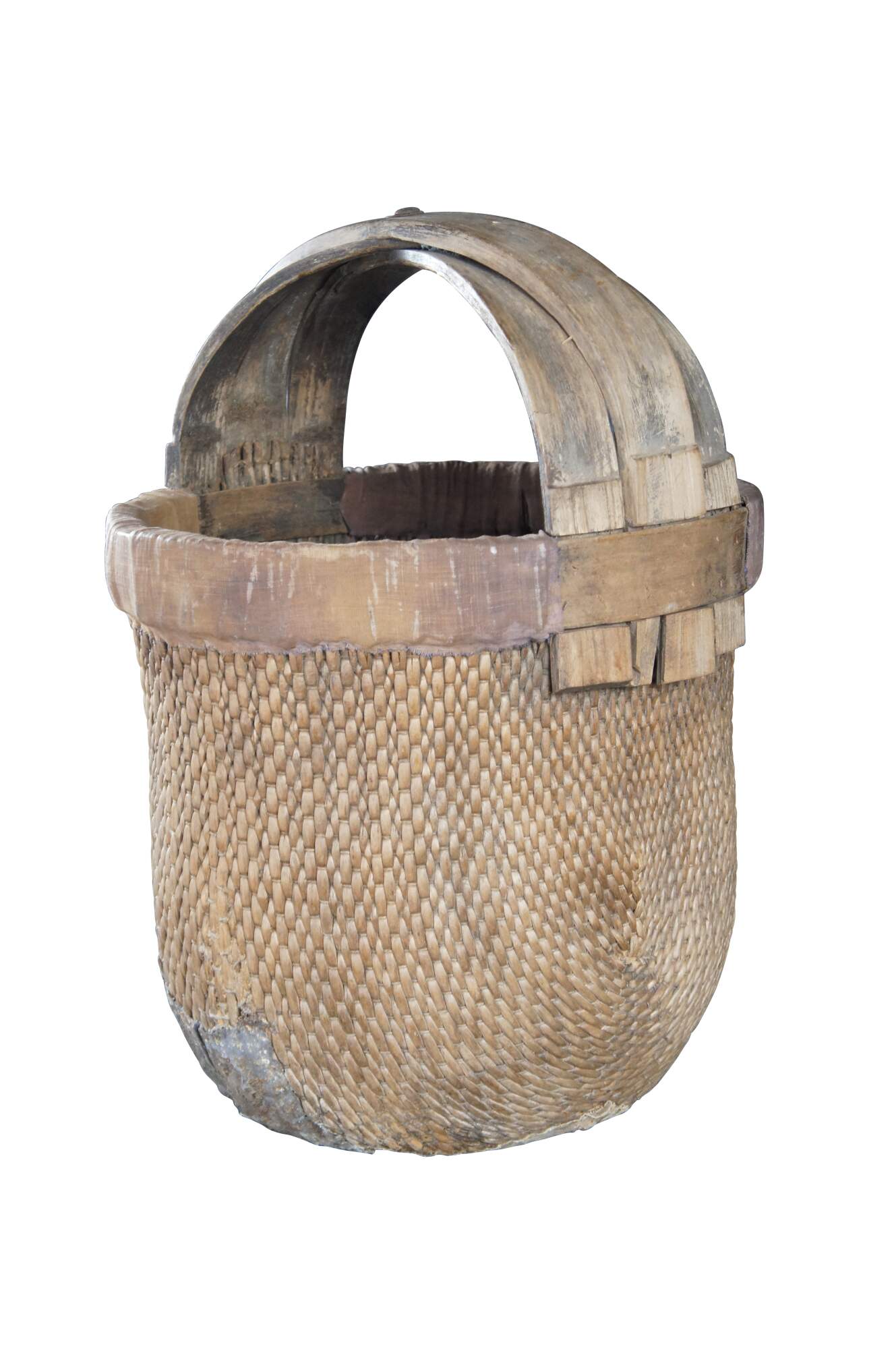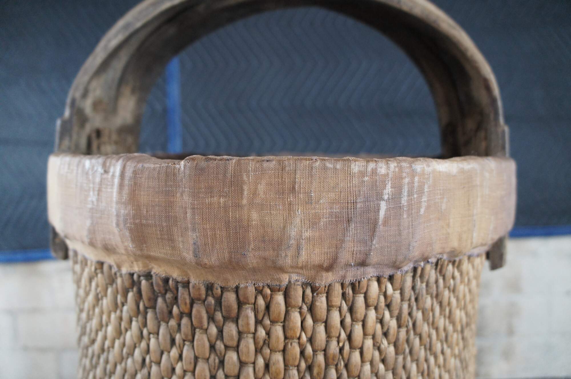 Early 20th Century Chinese Rice Basket. Made from woven reed with a bentwood handle.