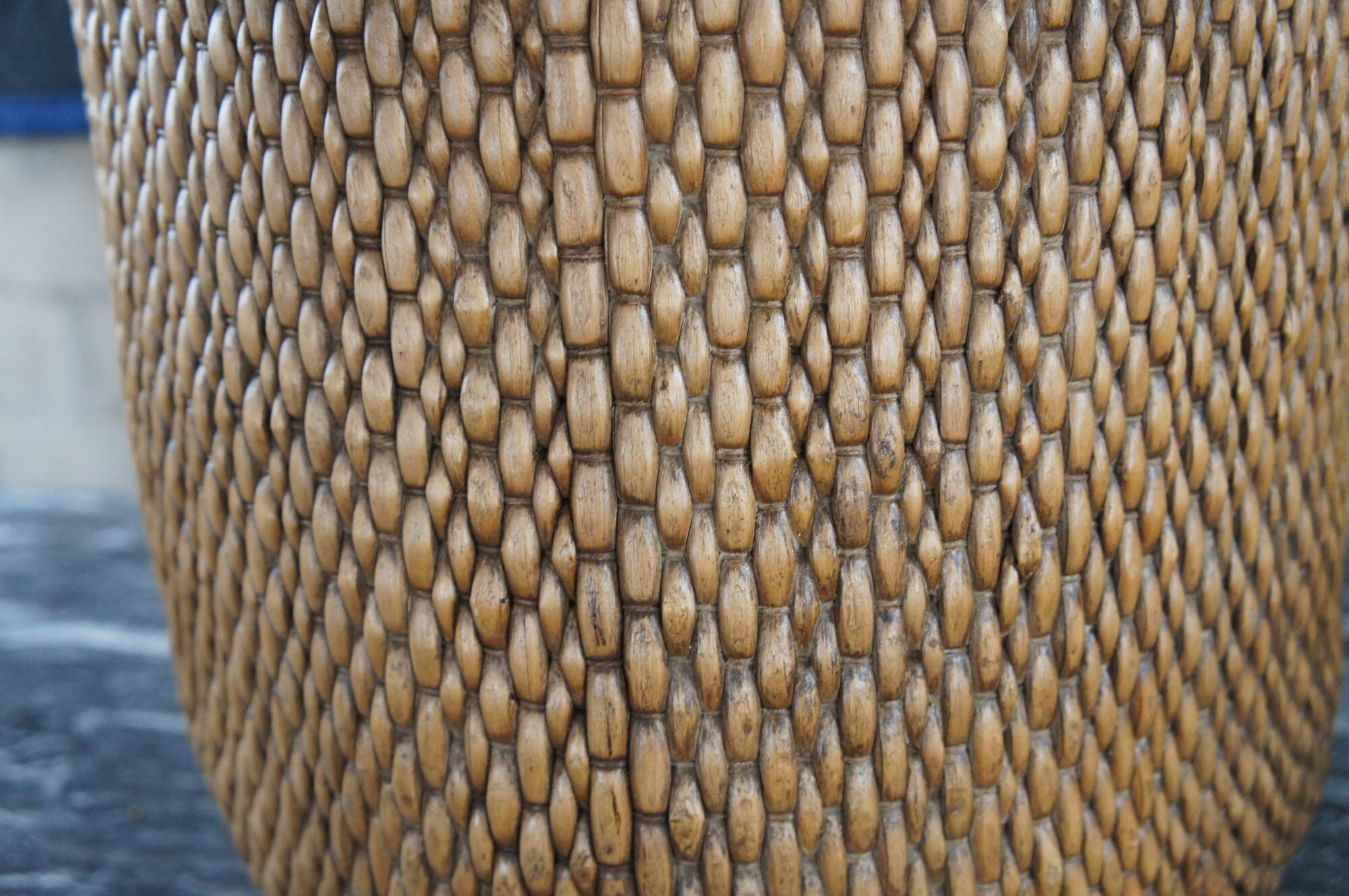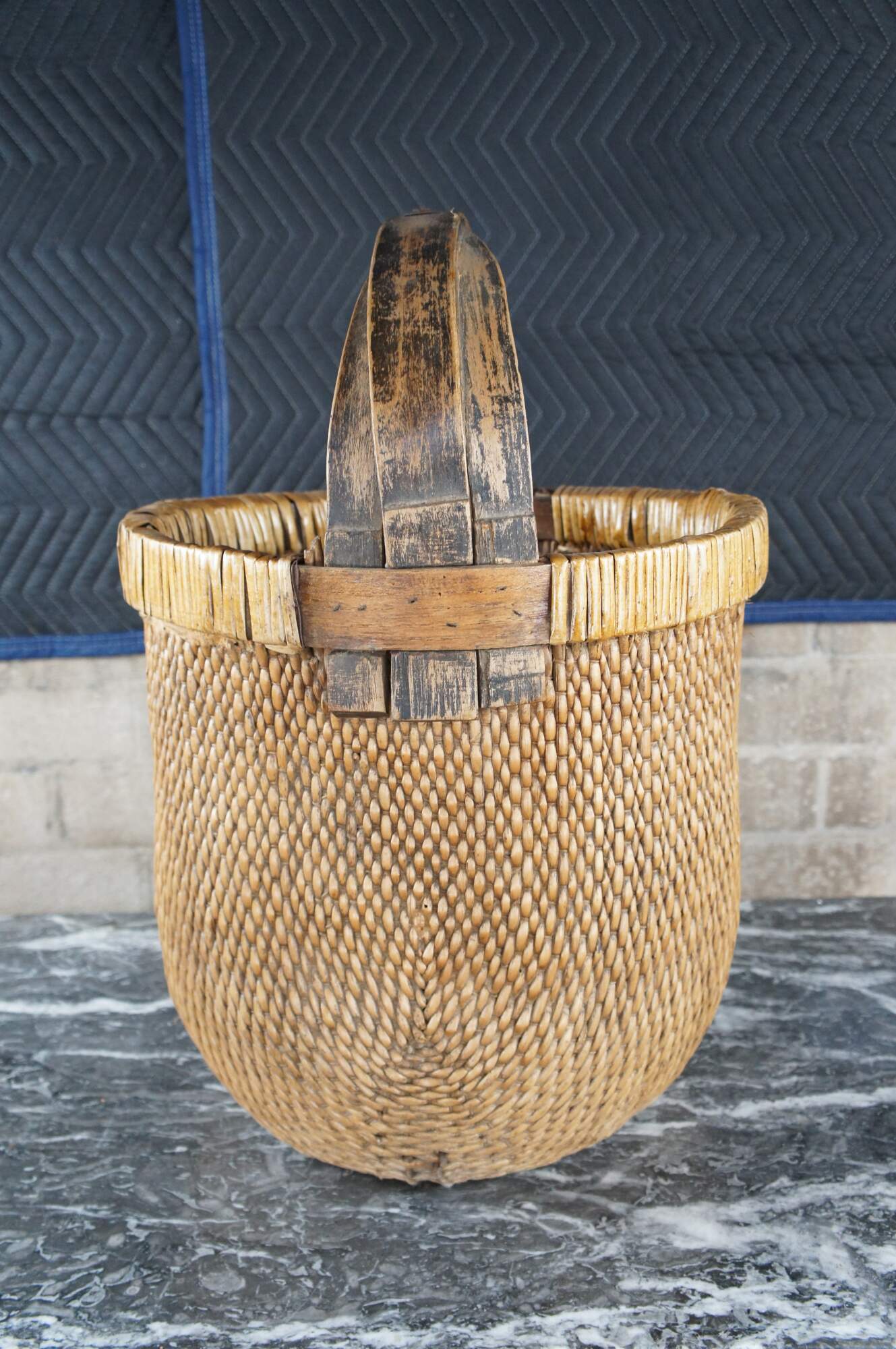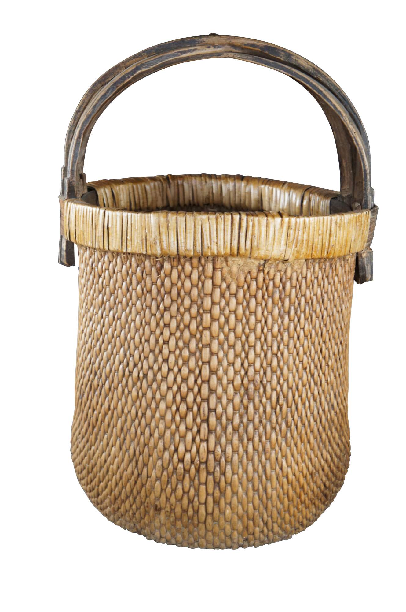 Early 20th Century Chinese Rice Basket. Made from woven reed with a bentwood handle and caligraphy.