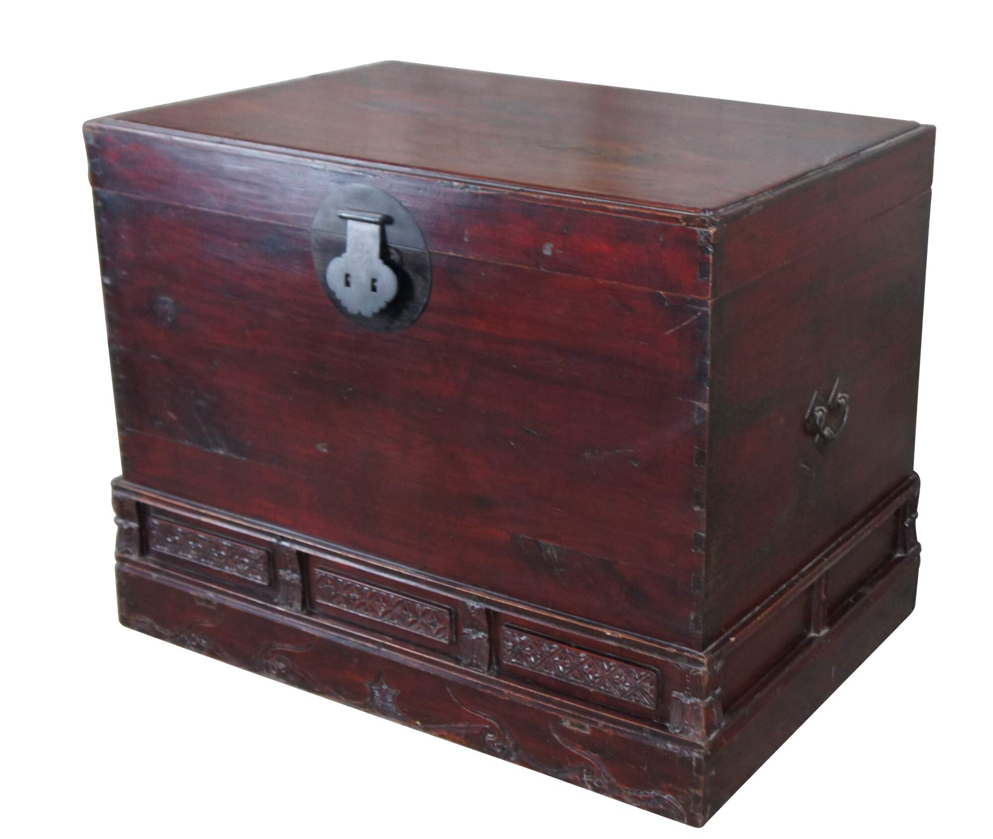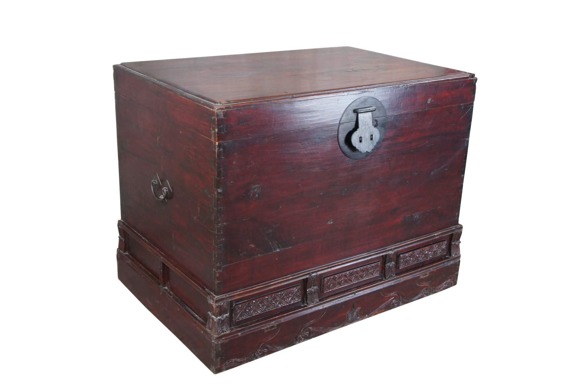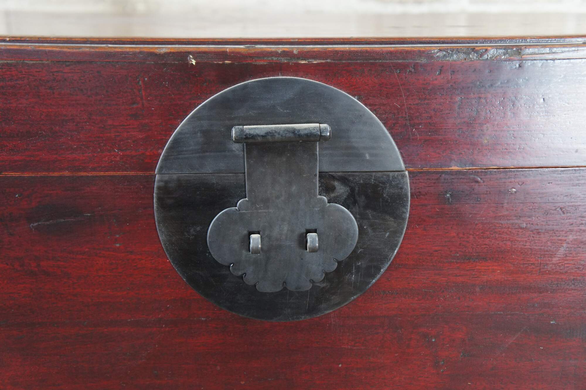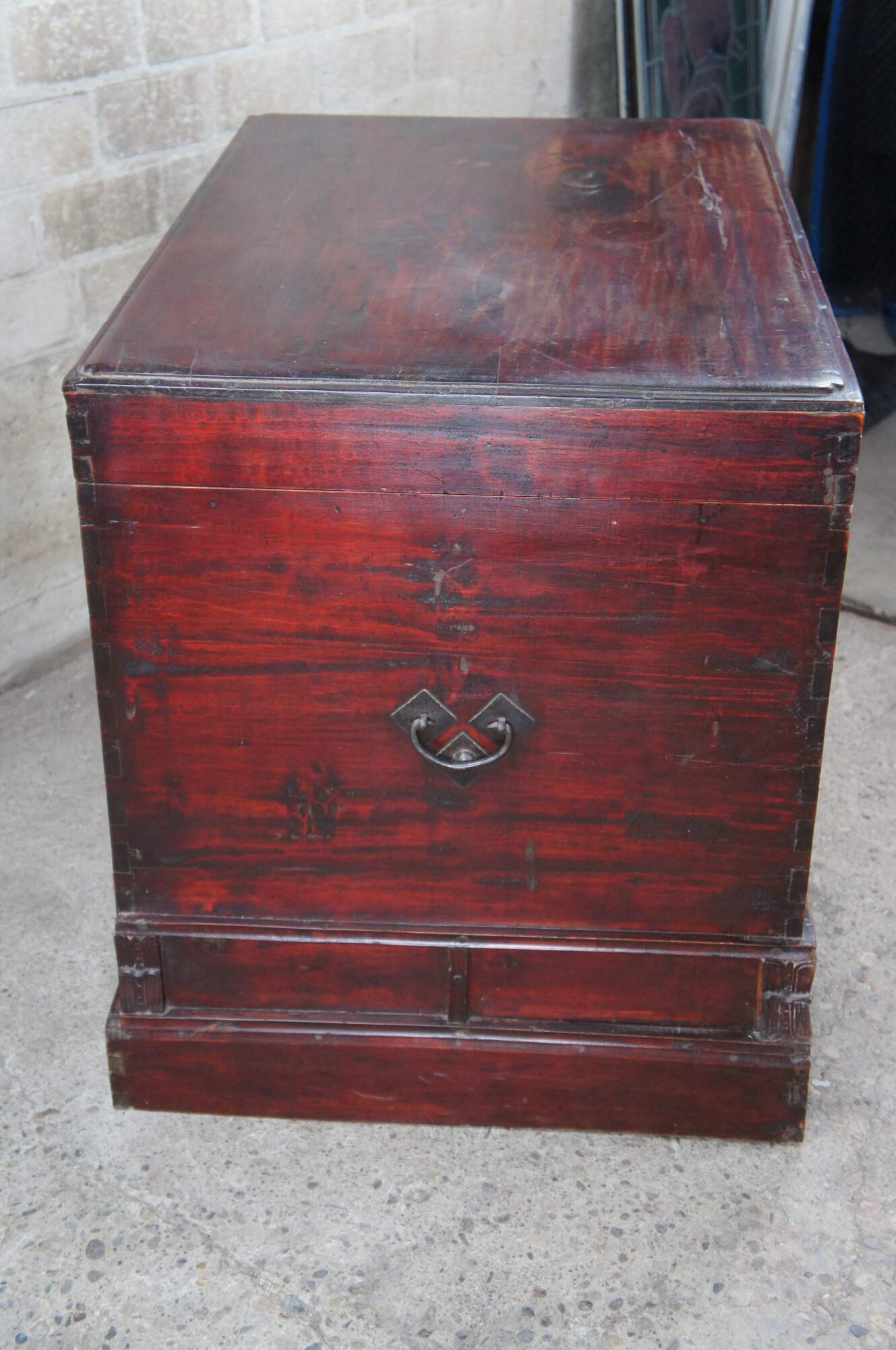 Late Qing Dynasty Red Lacquered Elm Trunk. Made in Shandong East China, late 19th century. Feature a rectangular body with dovetail construction at the corners and lower carved relief. The trunk has traditional moon hardware at the center, handles along each side and opens to a natural pine interior.
