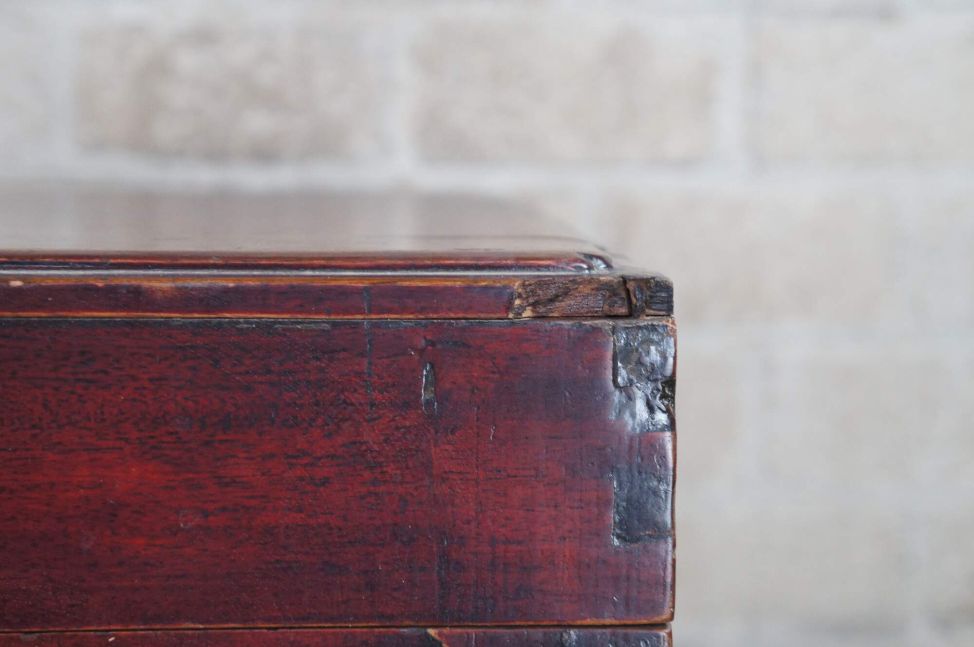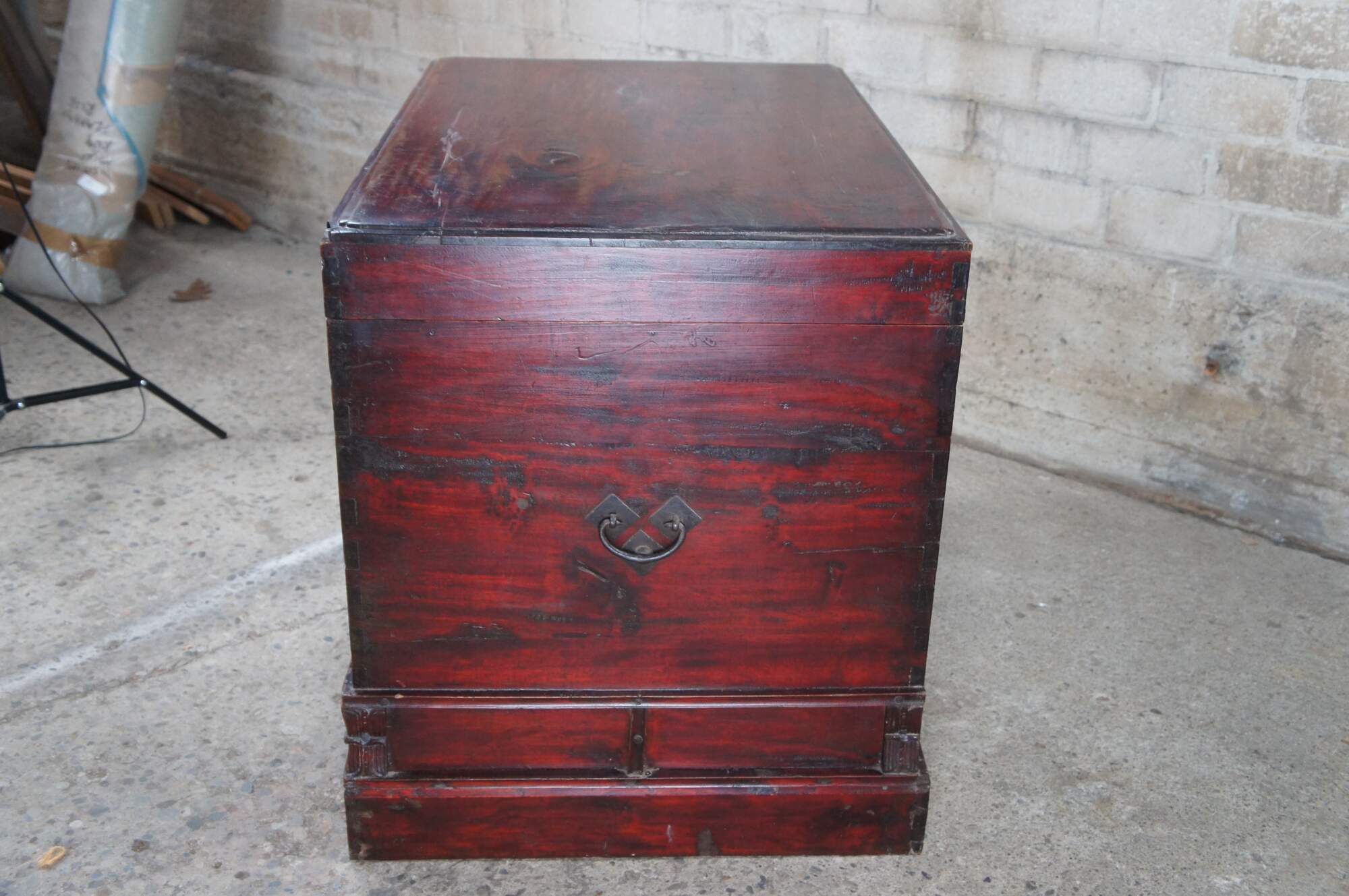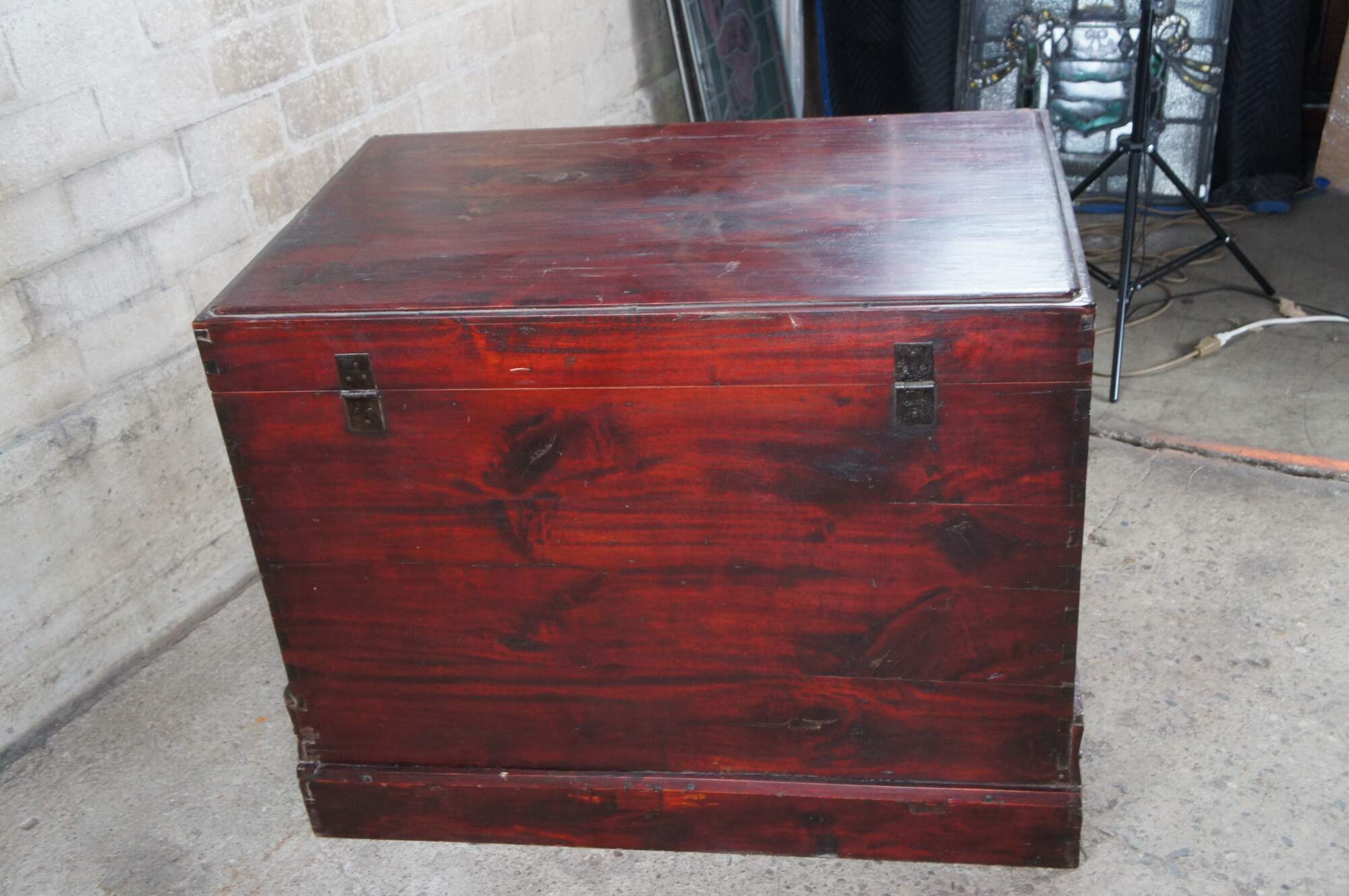 Late Qing Dynasty Red Lacquered Elm Trunk. Made in Shandong East China, late 19th century. Feature a rectangular body with dovetail construction at the corners and lower carved relief. The trunk has traditional moon hardware at the center, handles along each side and opens to a natural pine interior.