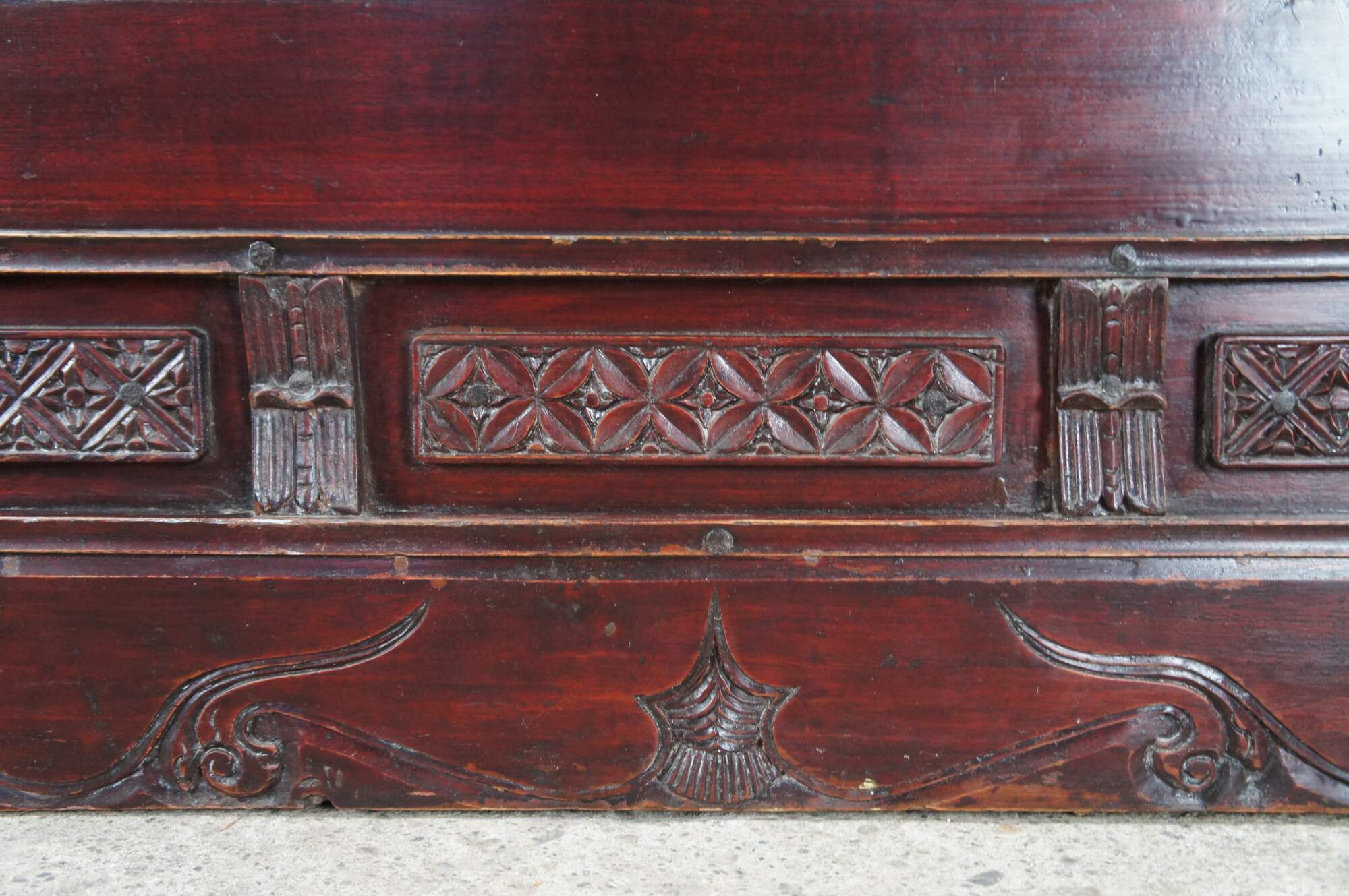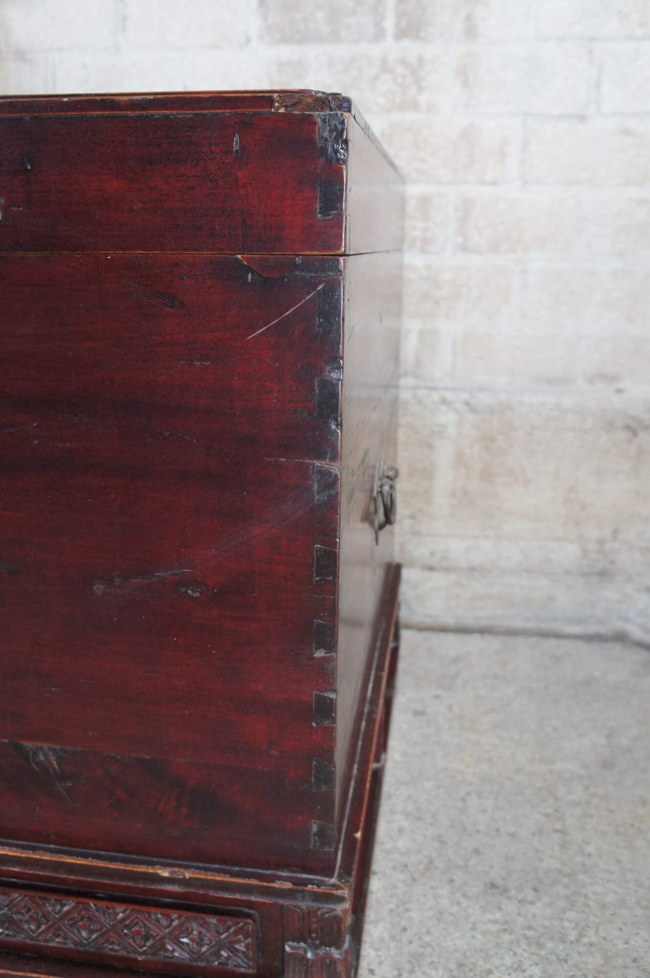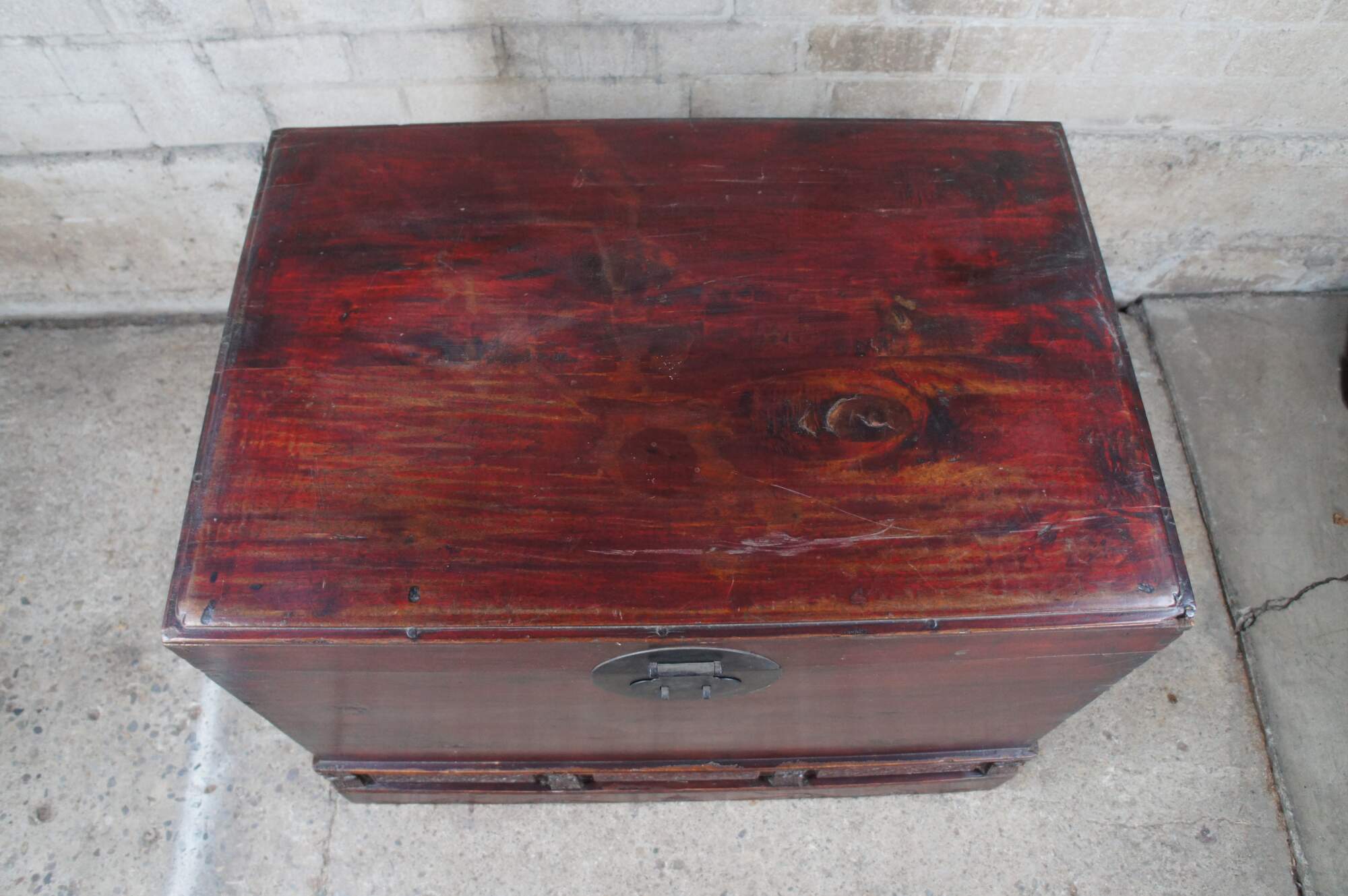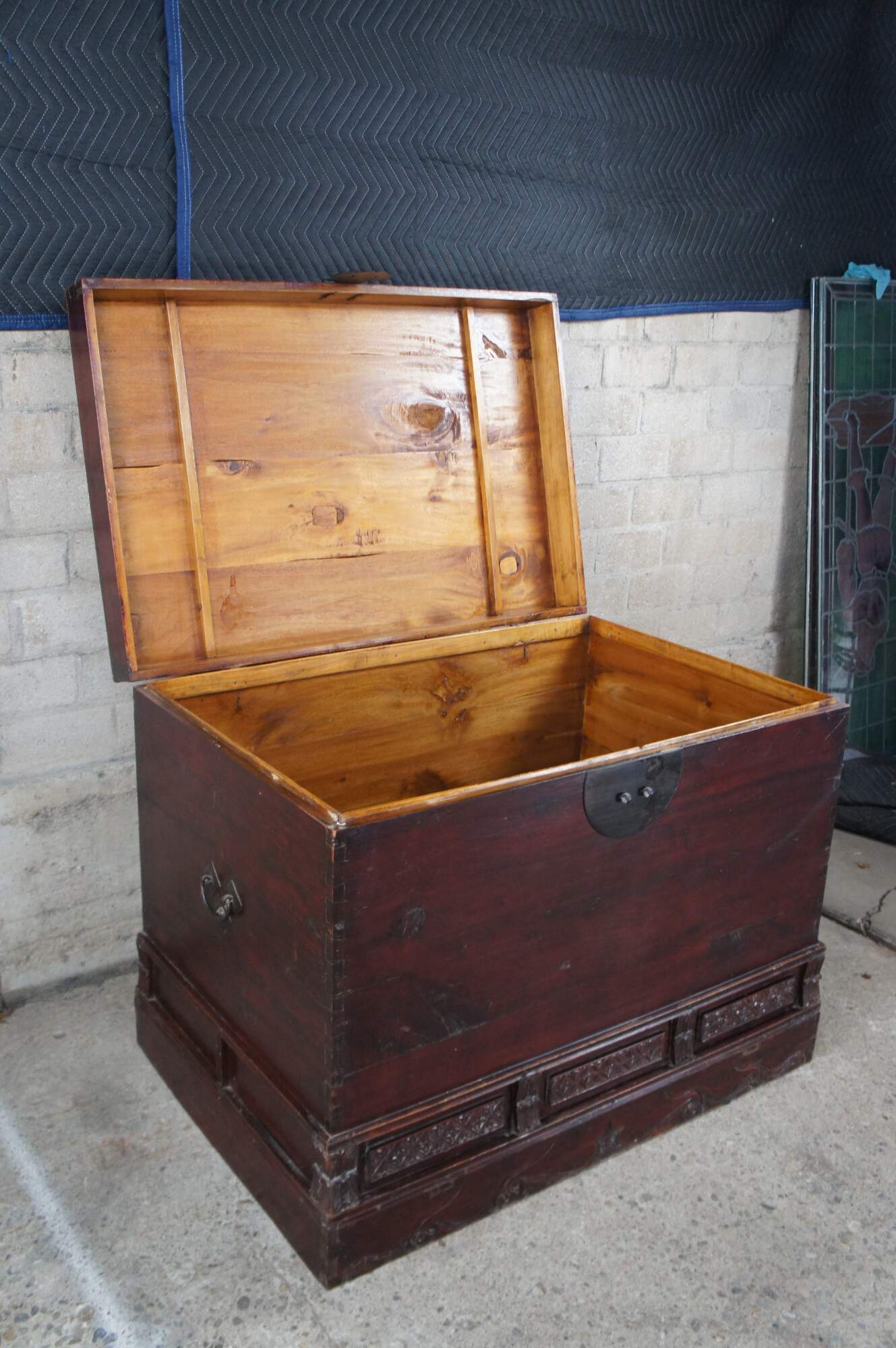Late Qing Dynasty Red Lacquered Elm Trunk. Made in Shandong East China, late 19th century. Feature a rectangular body with dovetail construction at the corners and lower carved relief. The trunk has traditional moon hardware at the center, handles along each side and opens to a natural pine interior.