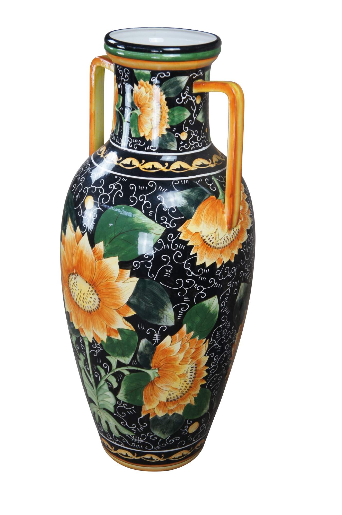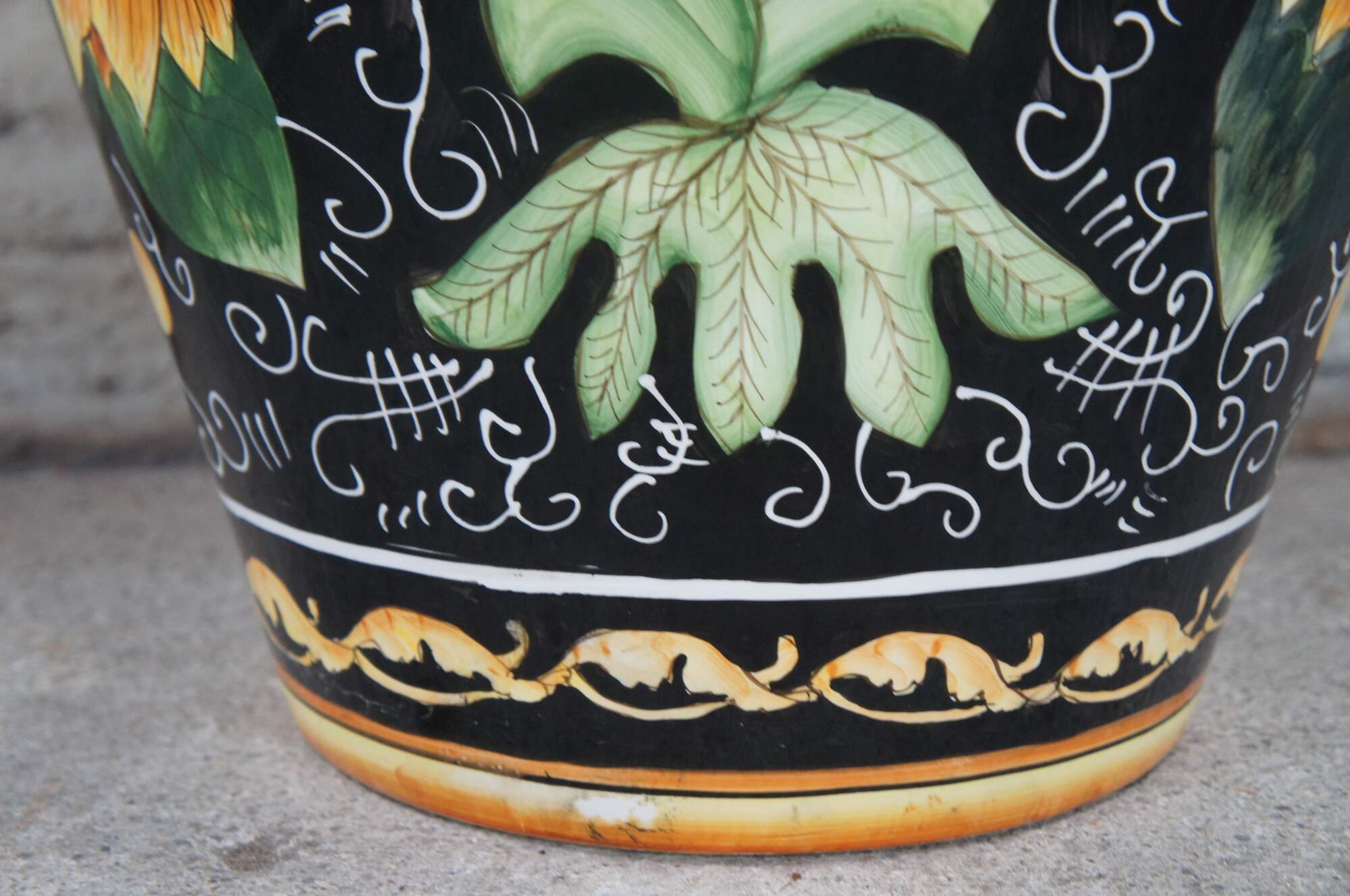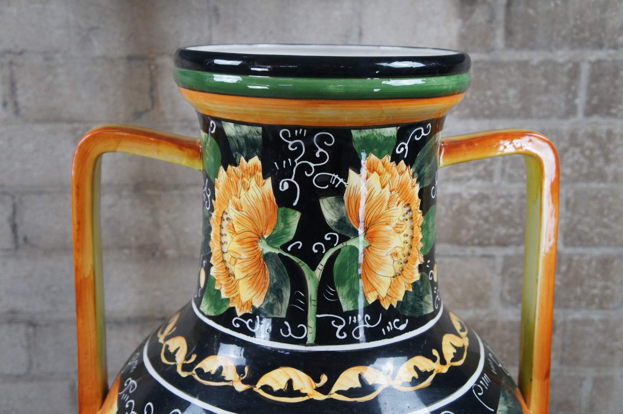 Large vintage Italian style floor vase or urn. Made of porcelain featuring sunflower design against a black field with large handles.