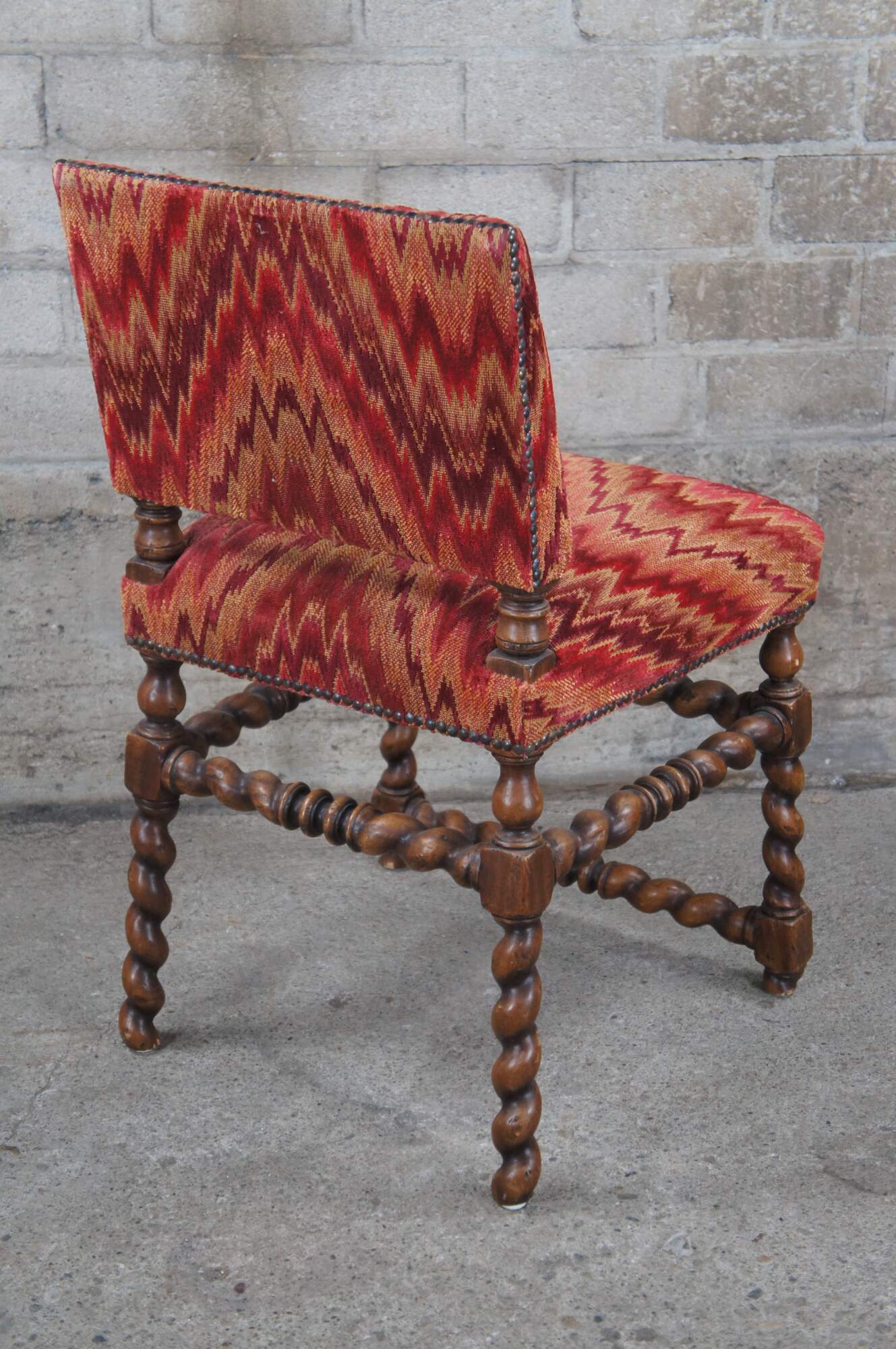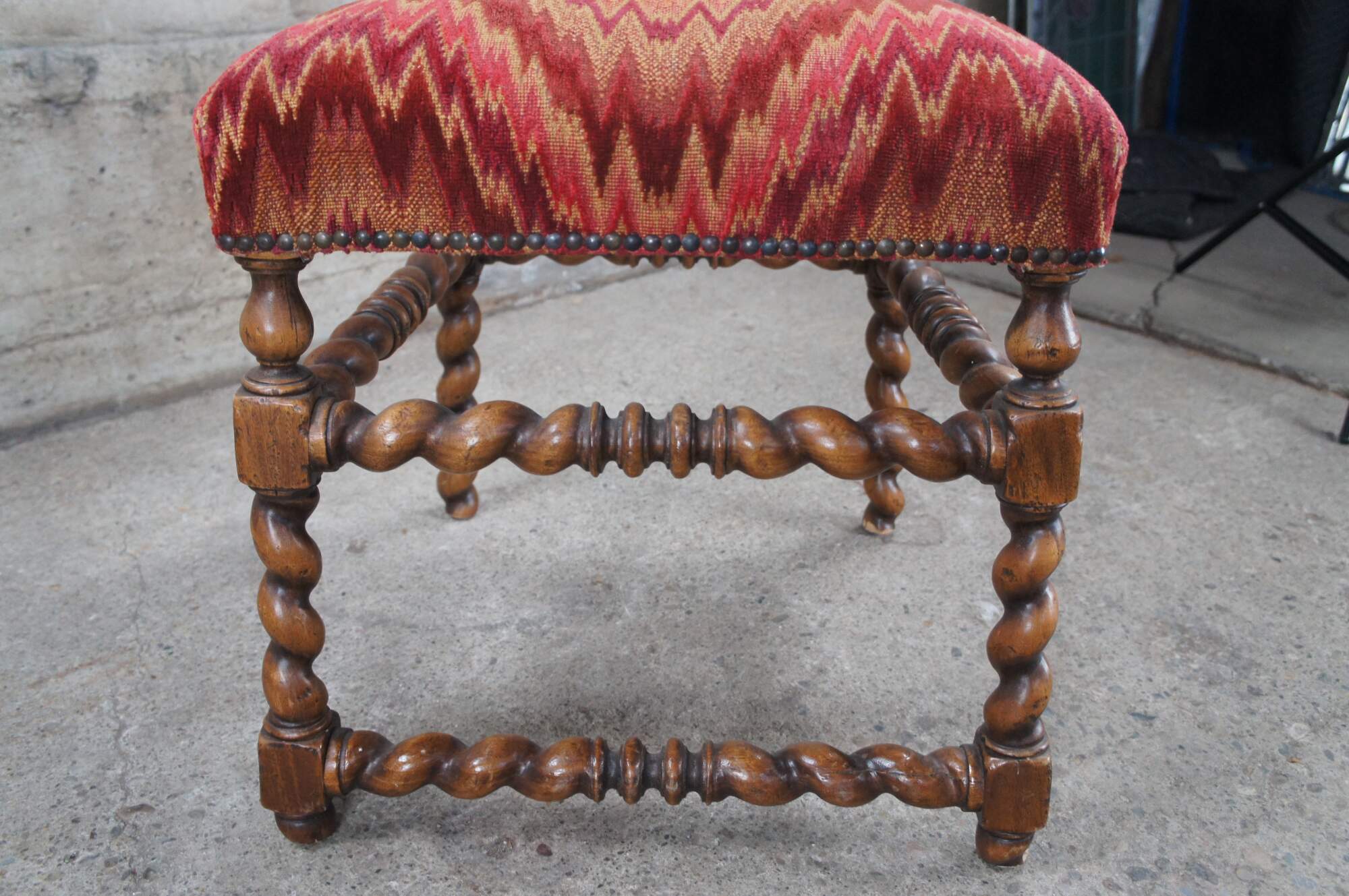Vintage Spanish oak barley twisted vanity chair featuring a neat red Southwestern upholstery with nailhead trim.