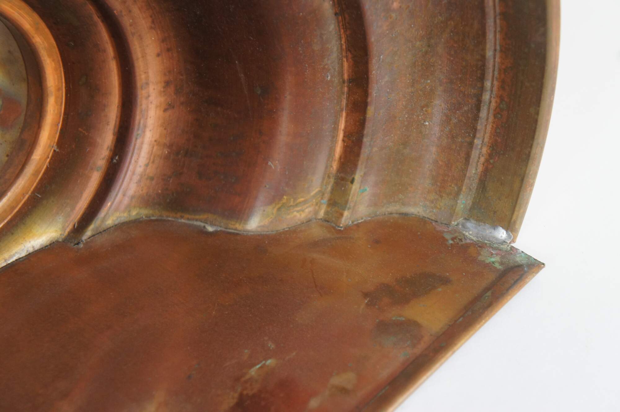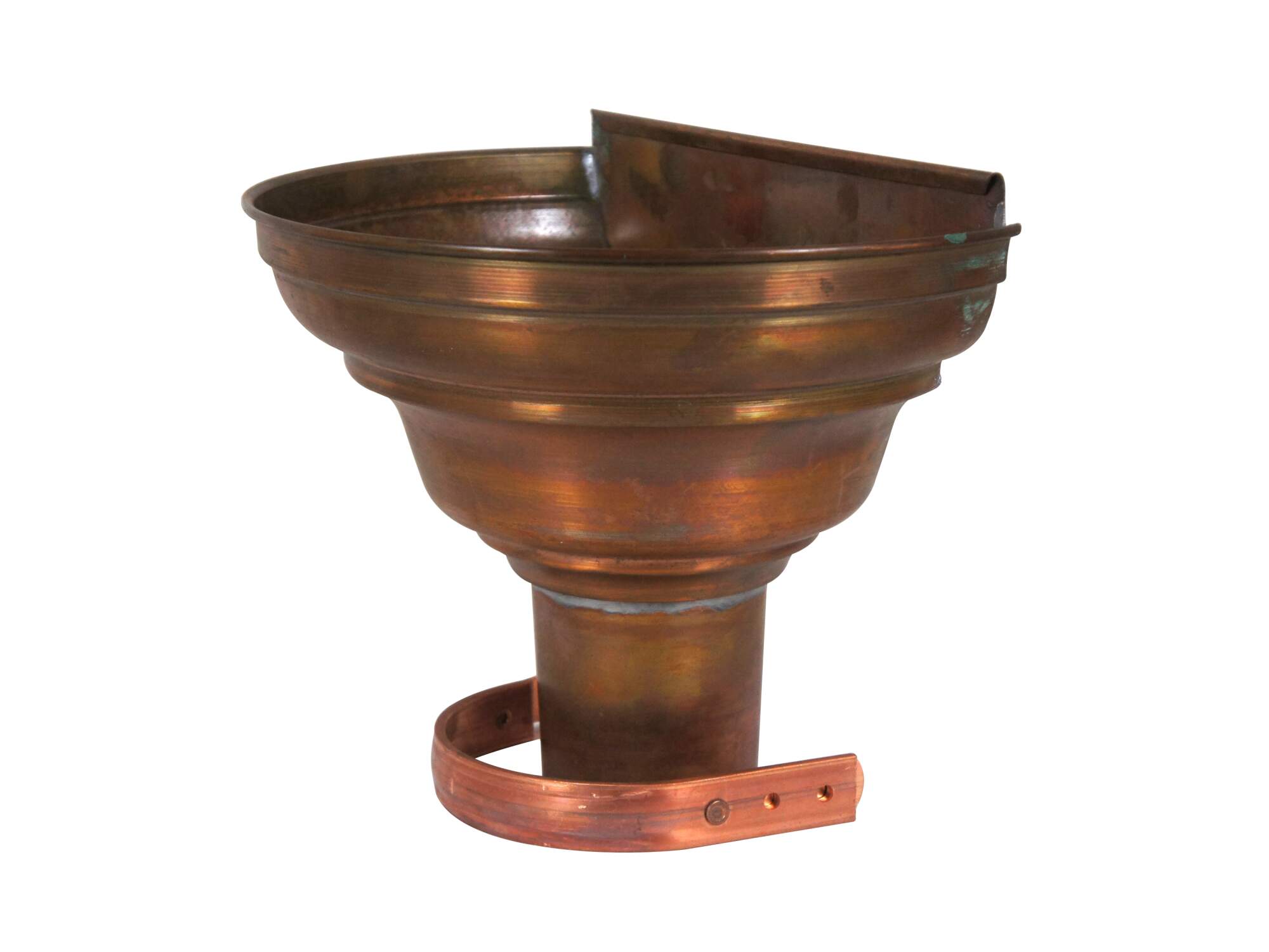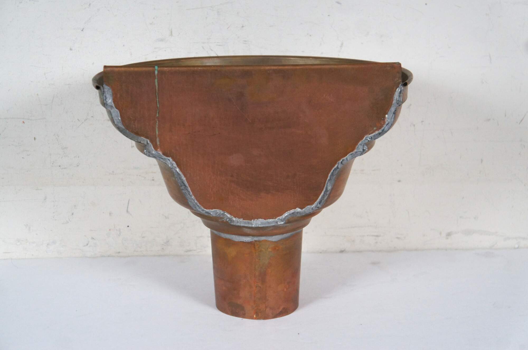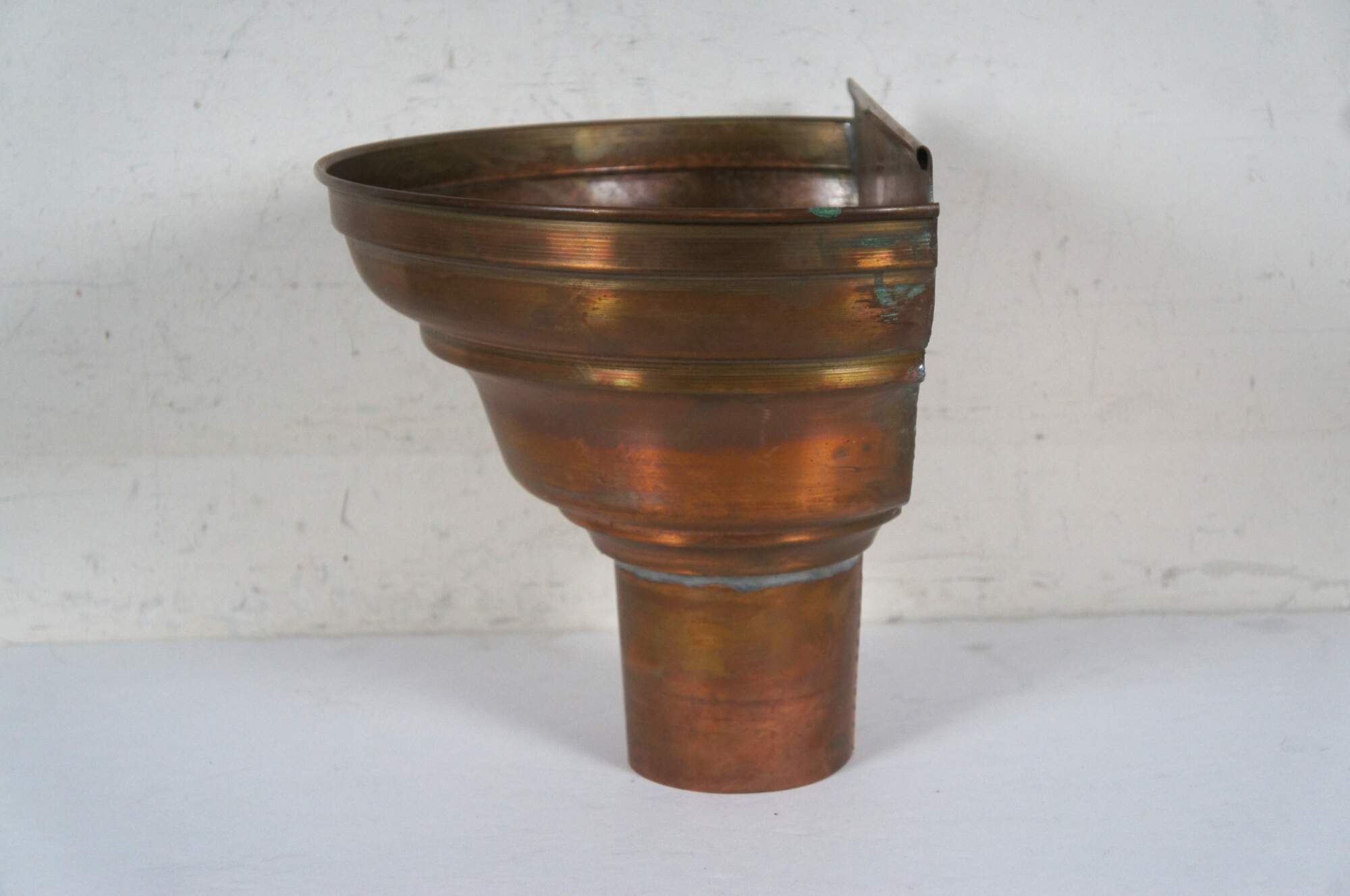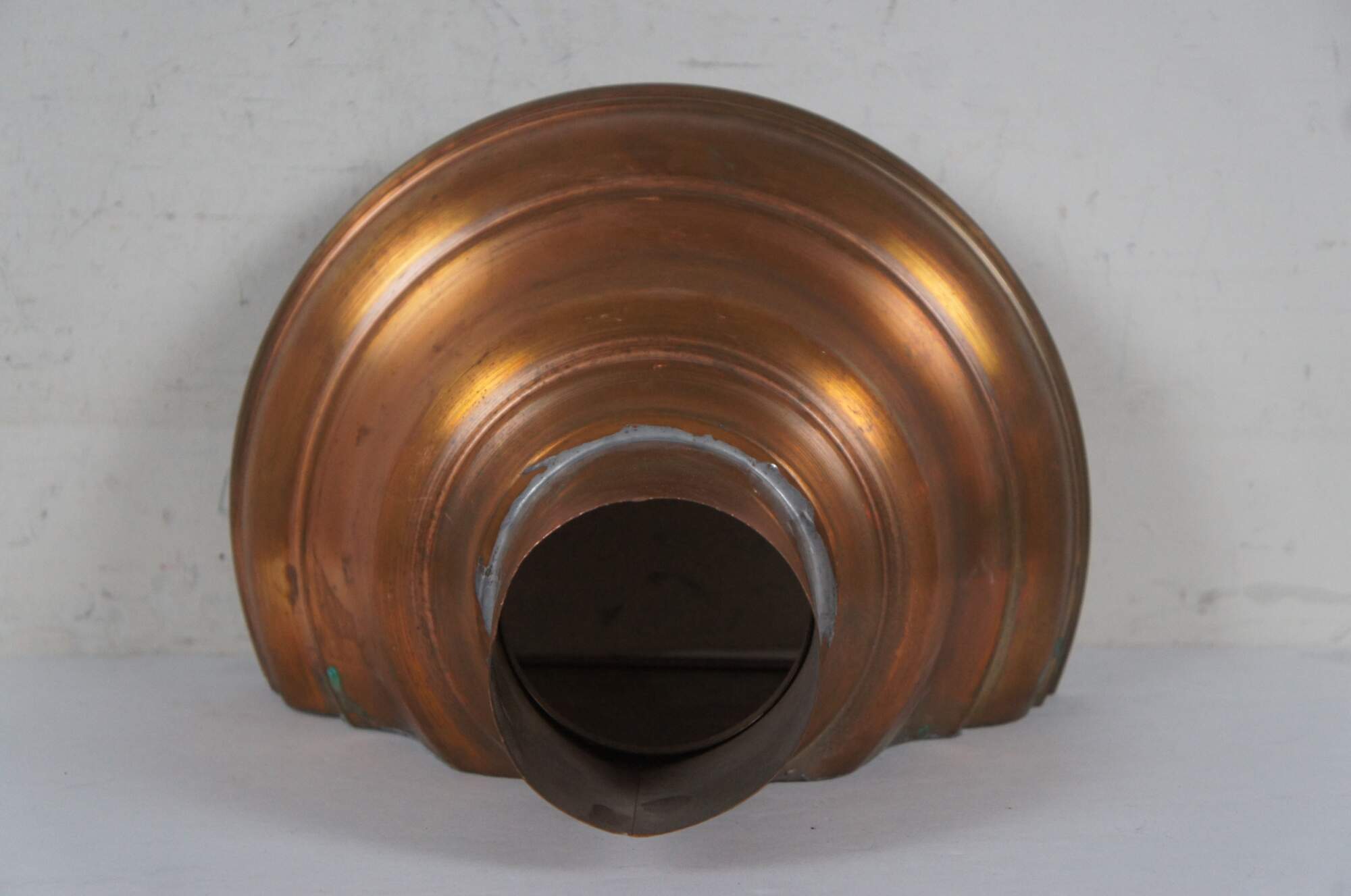 Late 20th century copper gutter leader head / leader box / hopper featuring a ridged and tapered half round / demi-lune form. Base Diameter 4". Includes one support bracket. No maker's mark.
