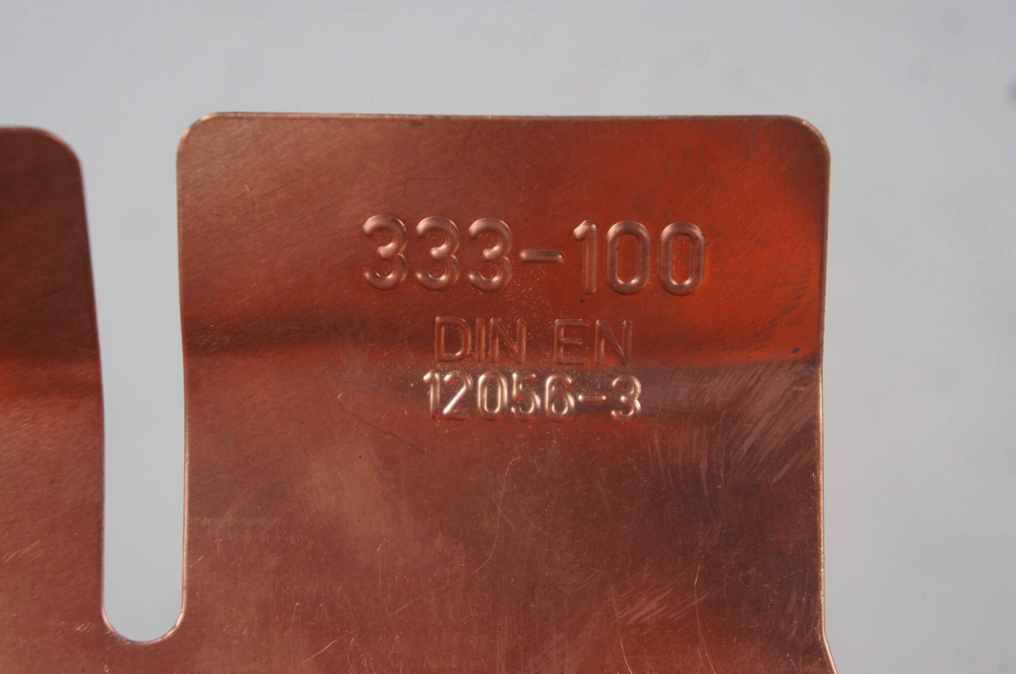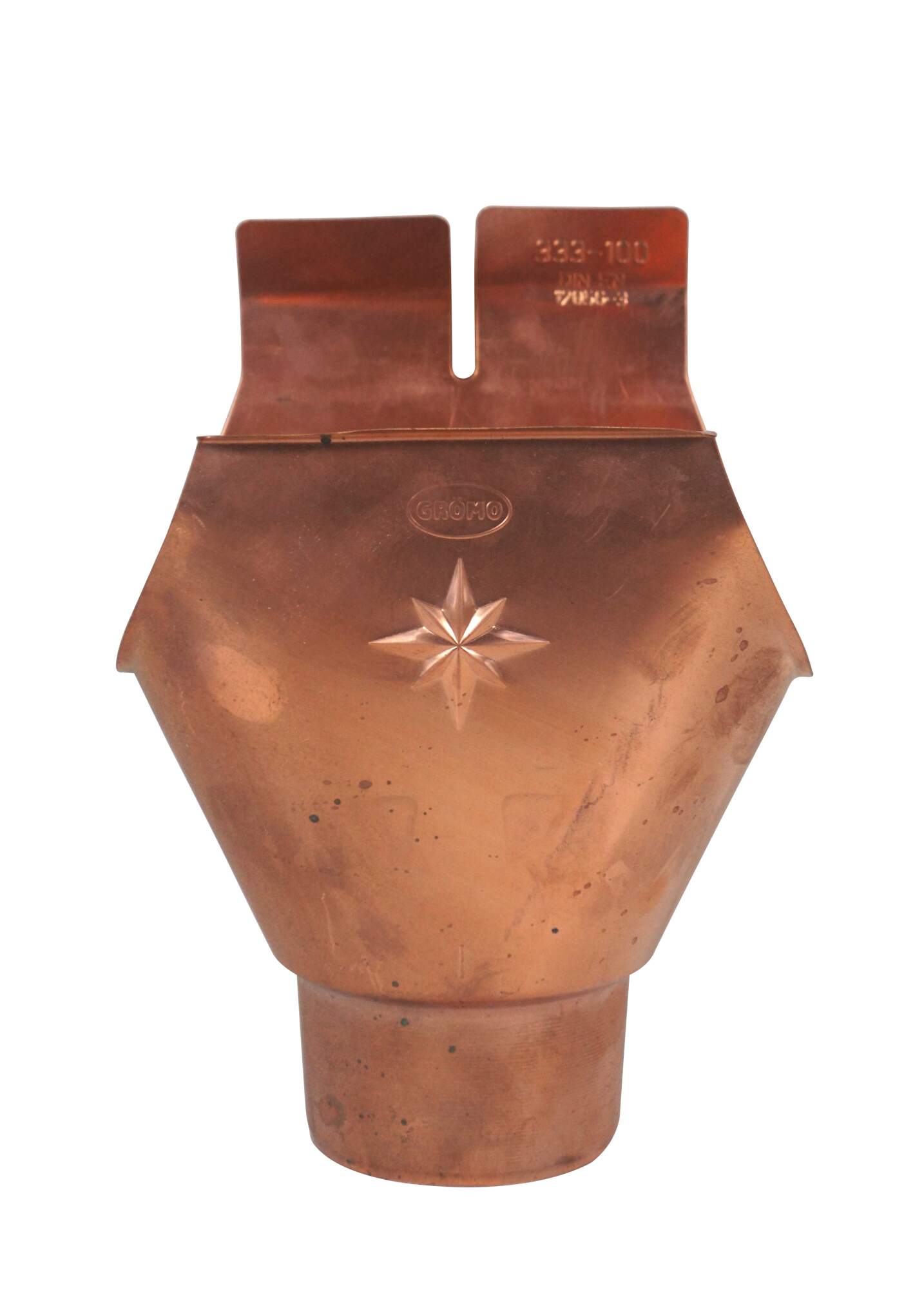 Gromo Plug-In Gutter Outlet Oval - Half Round Gutter - Number 333-100 Din En 12056-3 - Copper - 60450. Base Diameter 4". Decorated with embossed 8 pointed North Star. "The plug-in gutter outlet is the connecting piece between gutter and pipe. Its oval shape allows it to guide larger than average quantities over water safely and reliably into the downpipe. Mounting without tools and spring clip technology are just two of the numerous advantages."