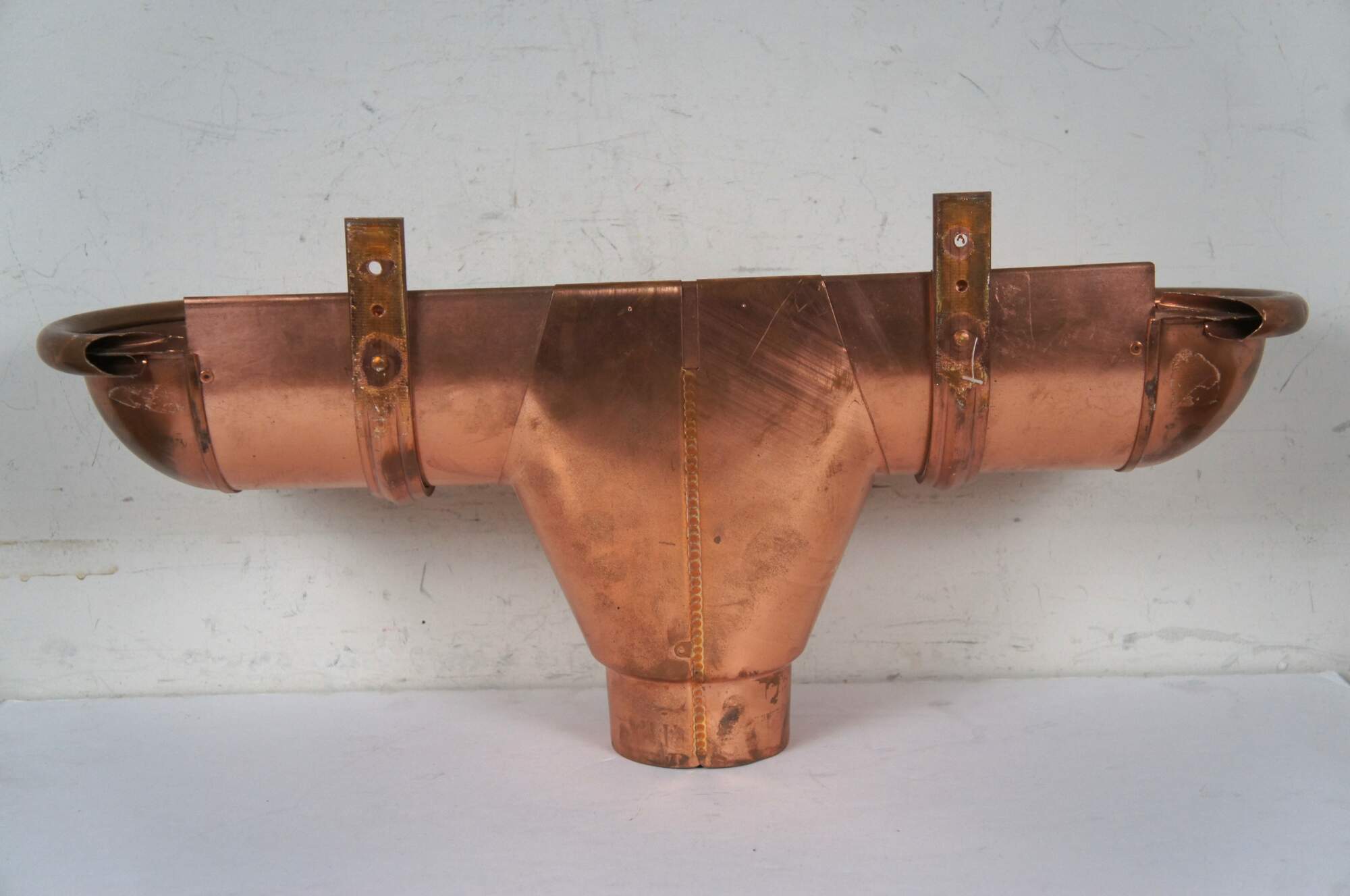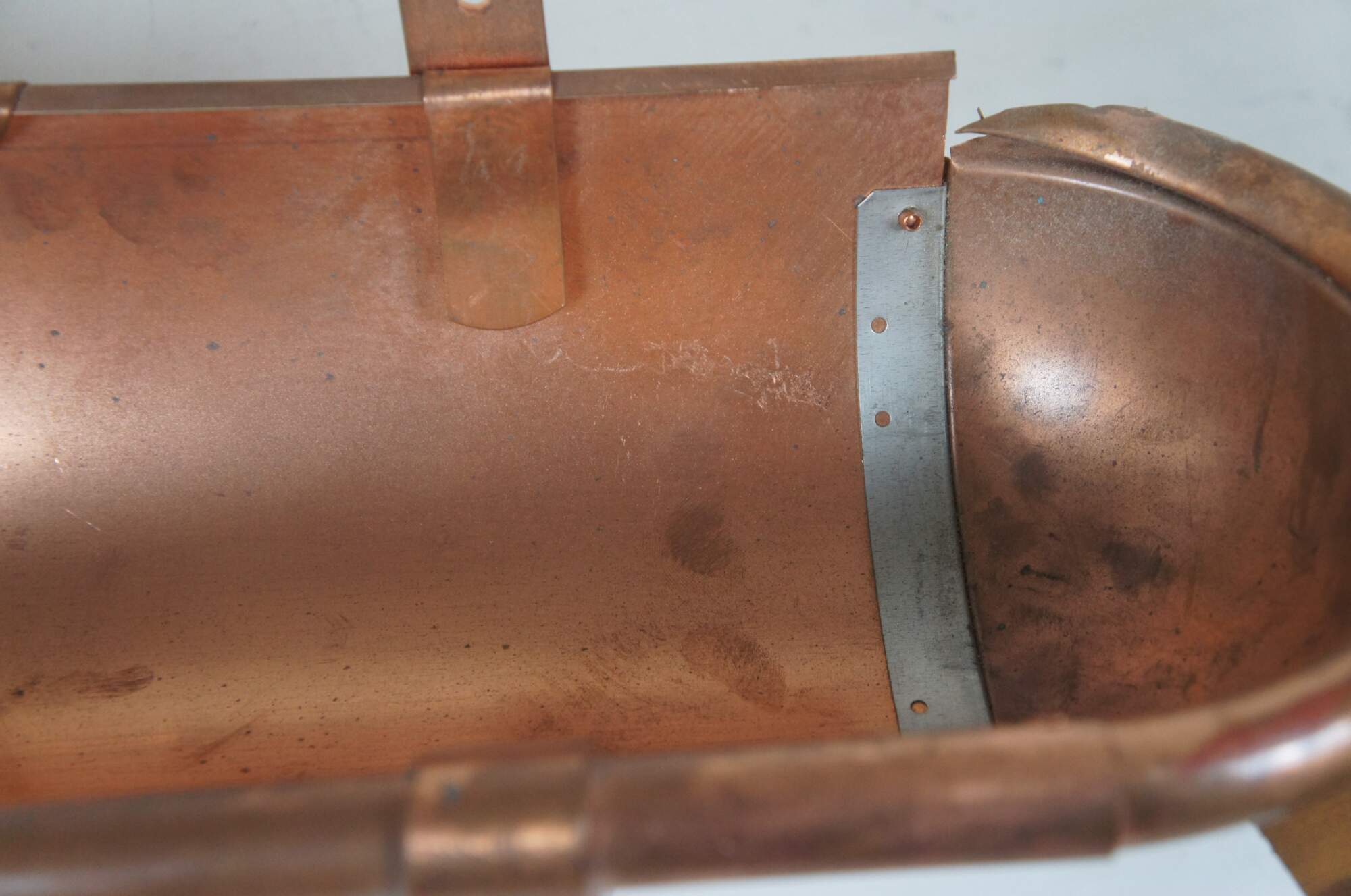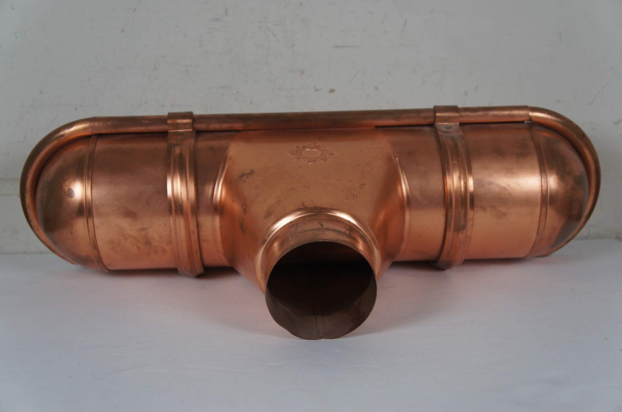 Late 20th century Minoletti copper downspout gutter segment, outlet embossed with a sun, and half-spherical end caps. Includes base connector and one support bracket. Numbered 330/100.