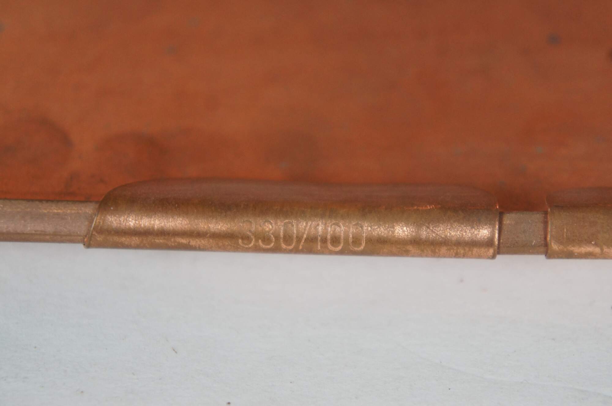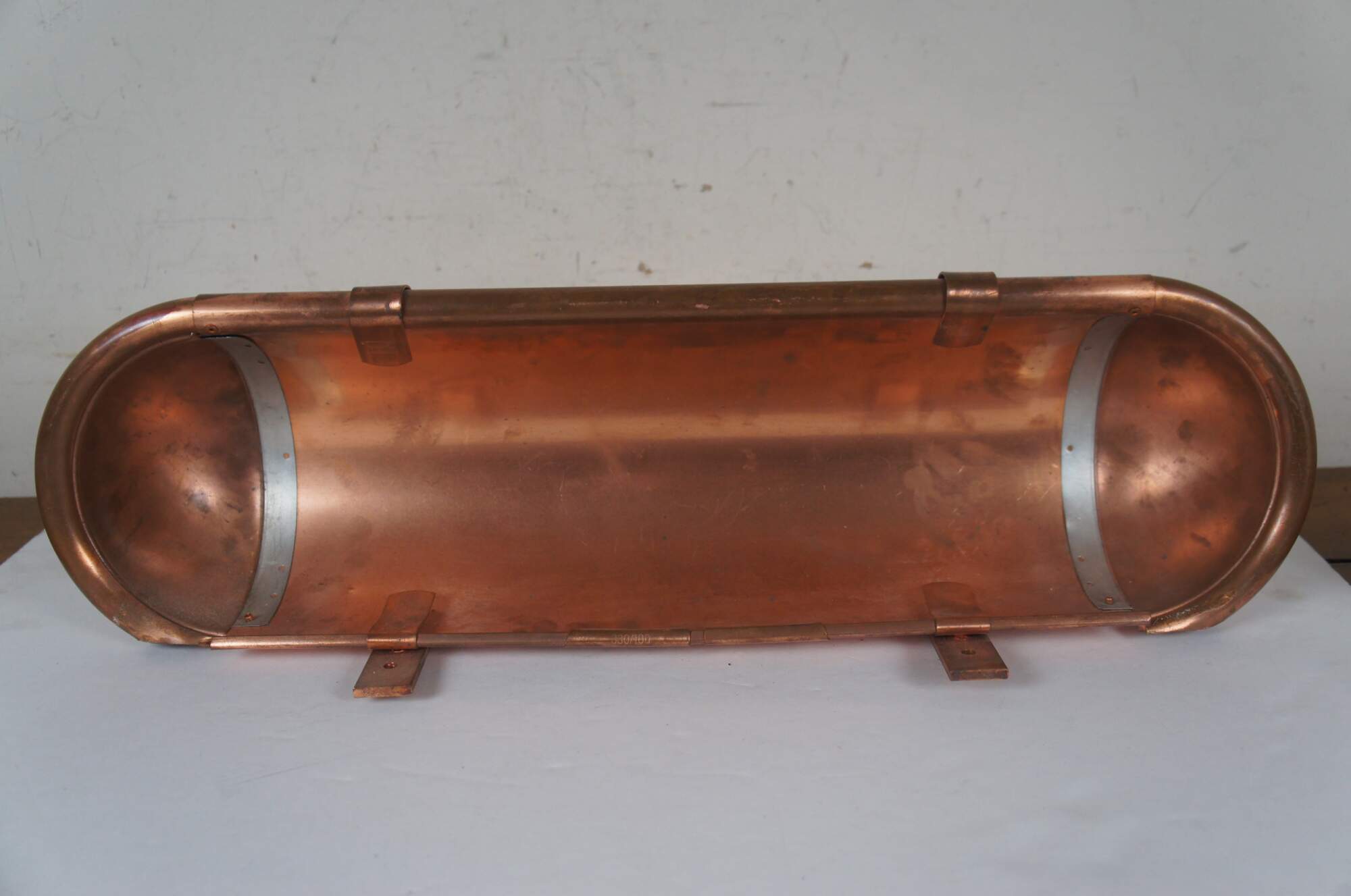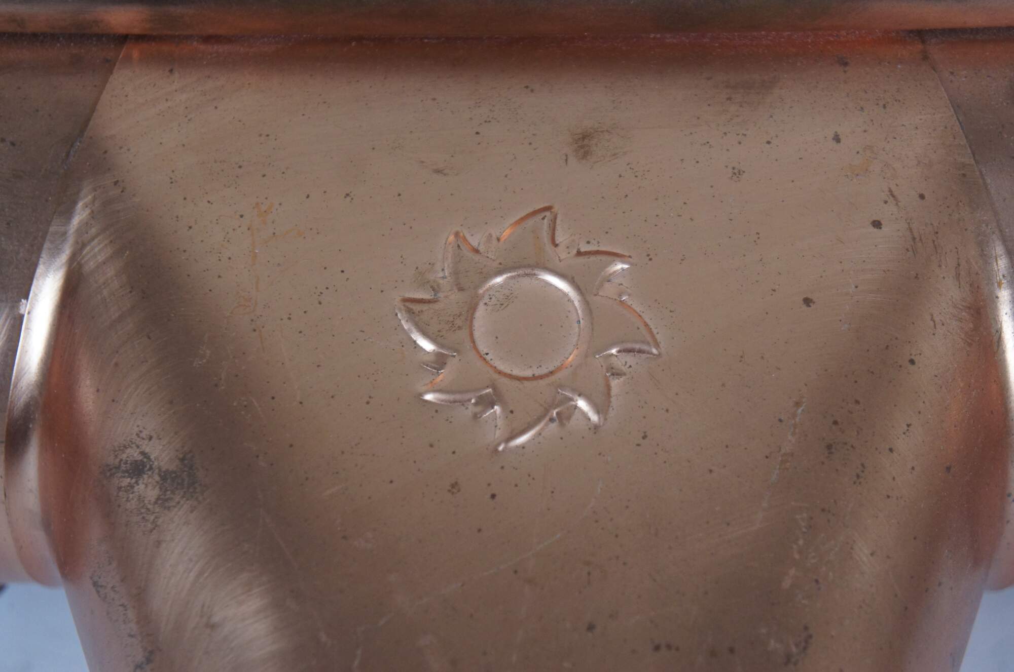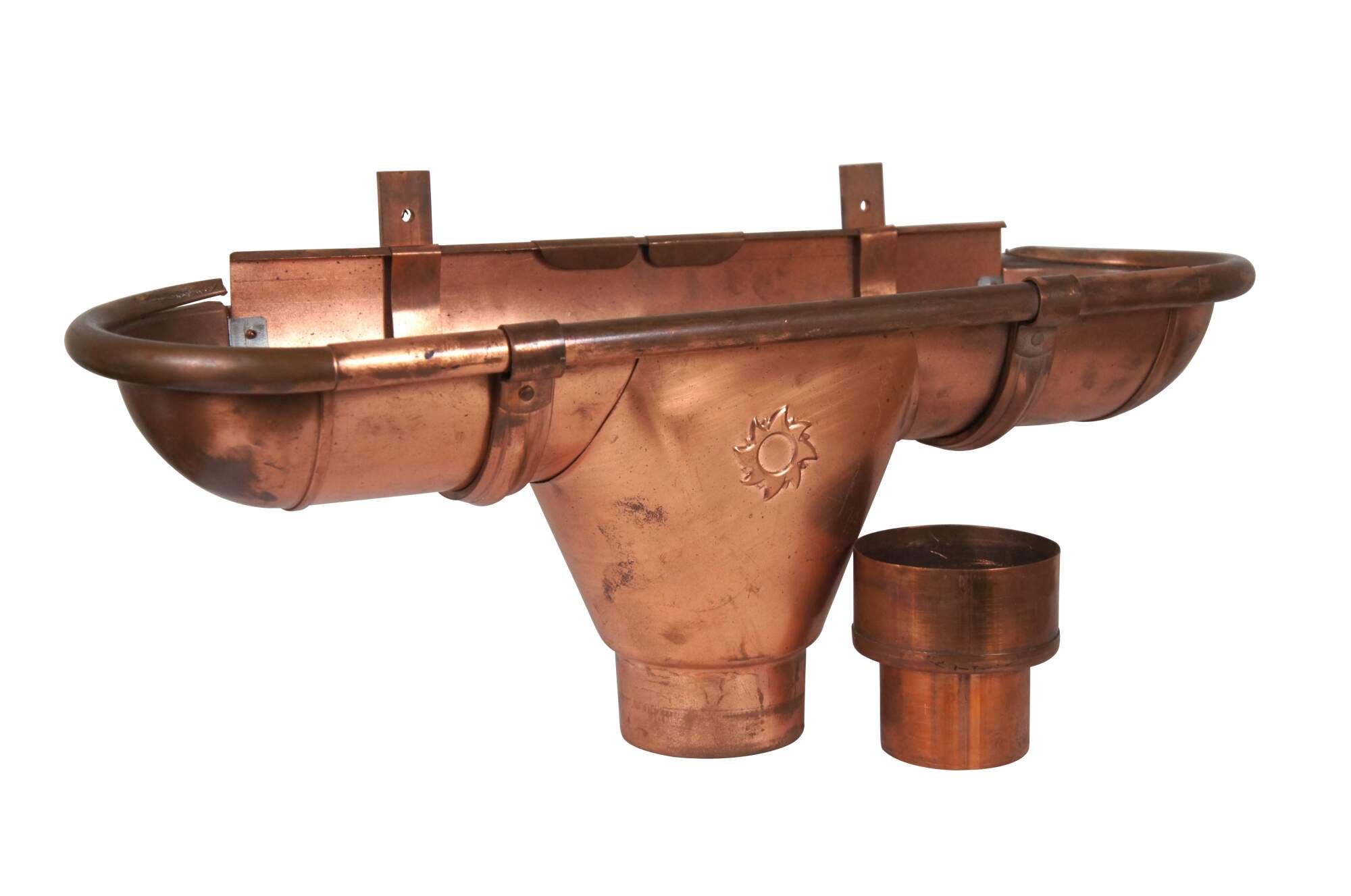 Late 20th century Minoletti copper downspout gutter segment, outlet embossed with a sun, and half-spherical end caps. Includes base connector and one support bracket. Numbered 330/100.