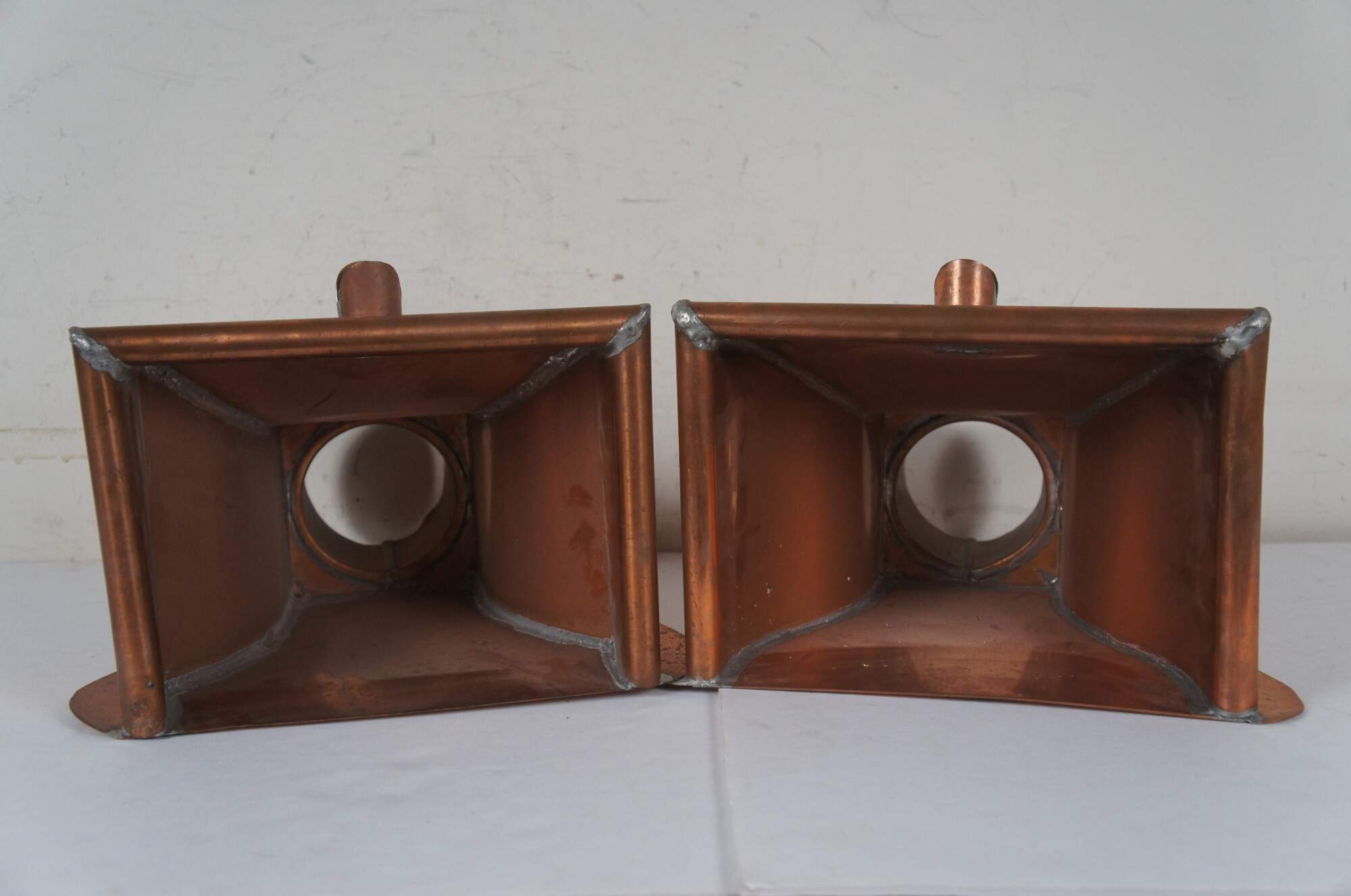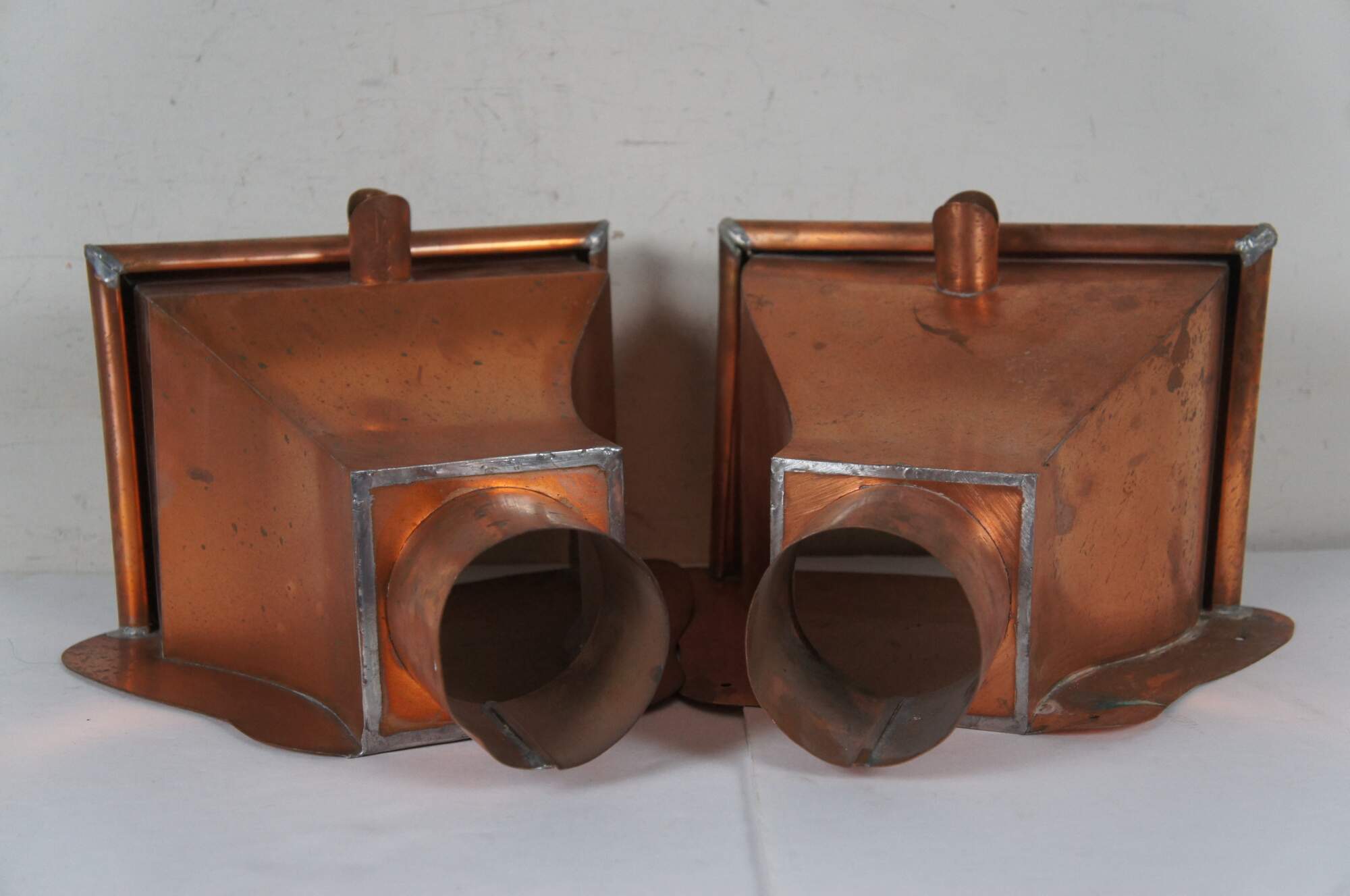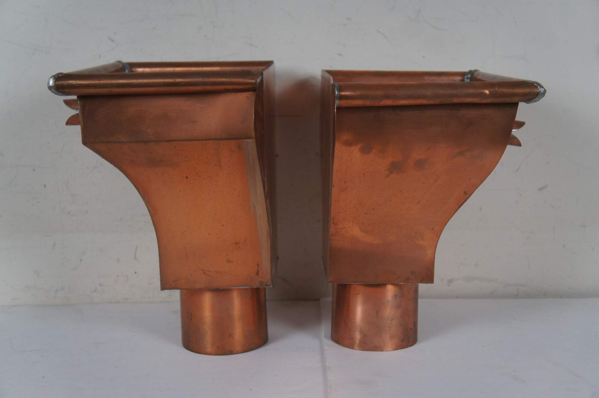 Pair of late 20th century copper gutter leader heads / leader boxes / hoppers with overflow pipe. Italian / Old Dutch styling with bird's beak shaped overflow spouts. Base Diameter 4". Includes two support brackets. No maker's mark.