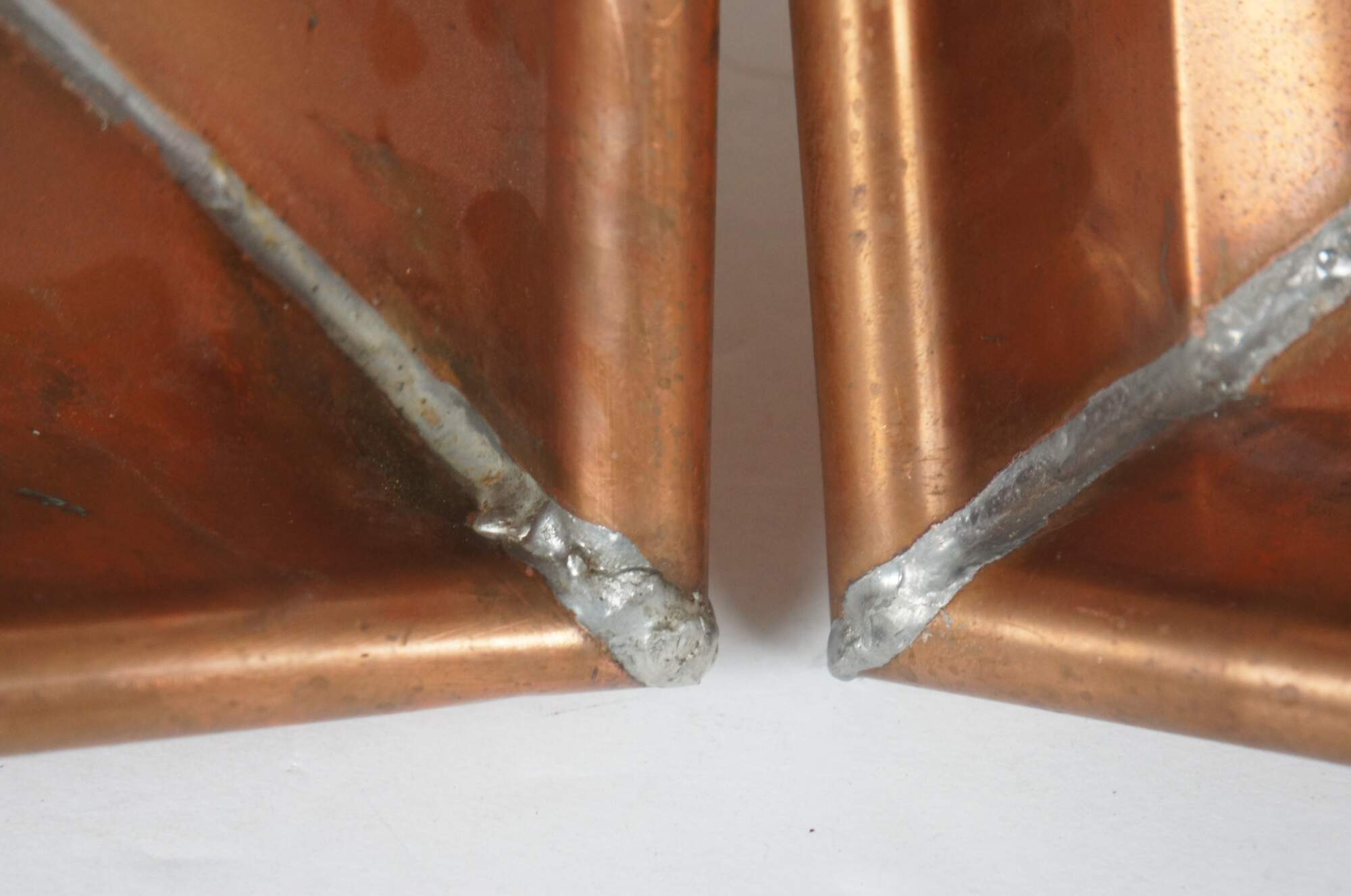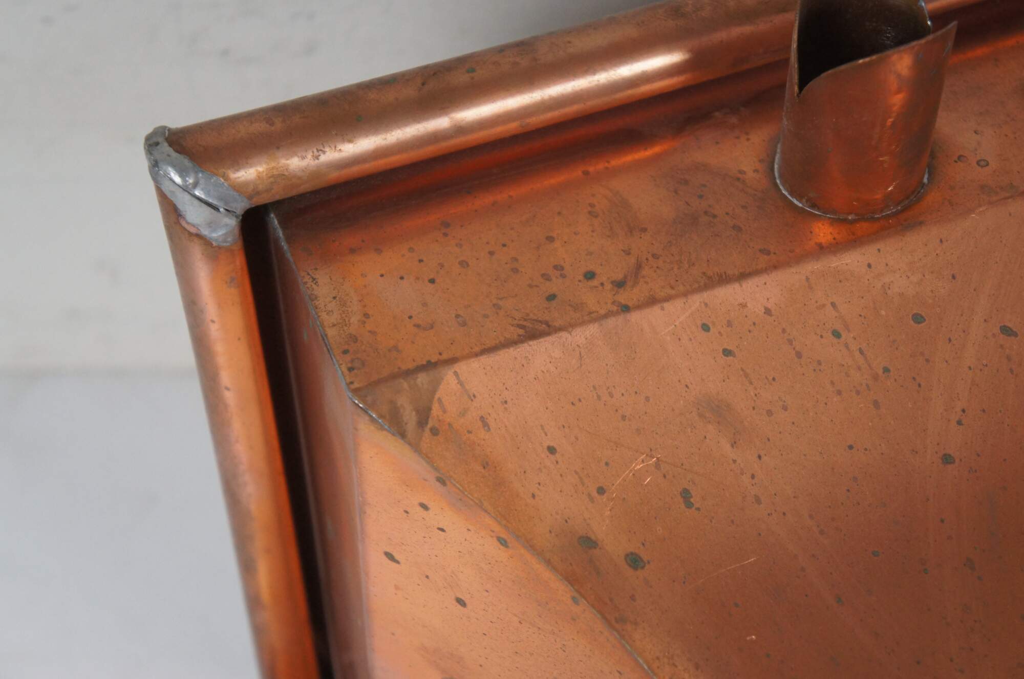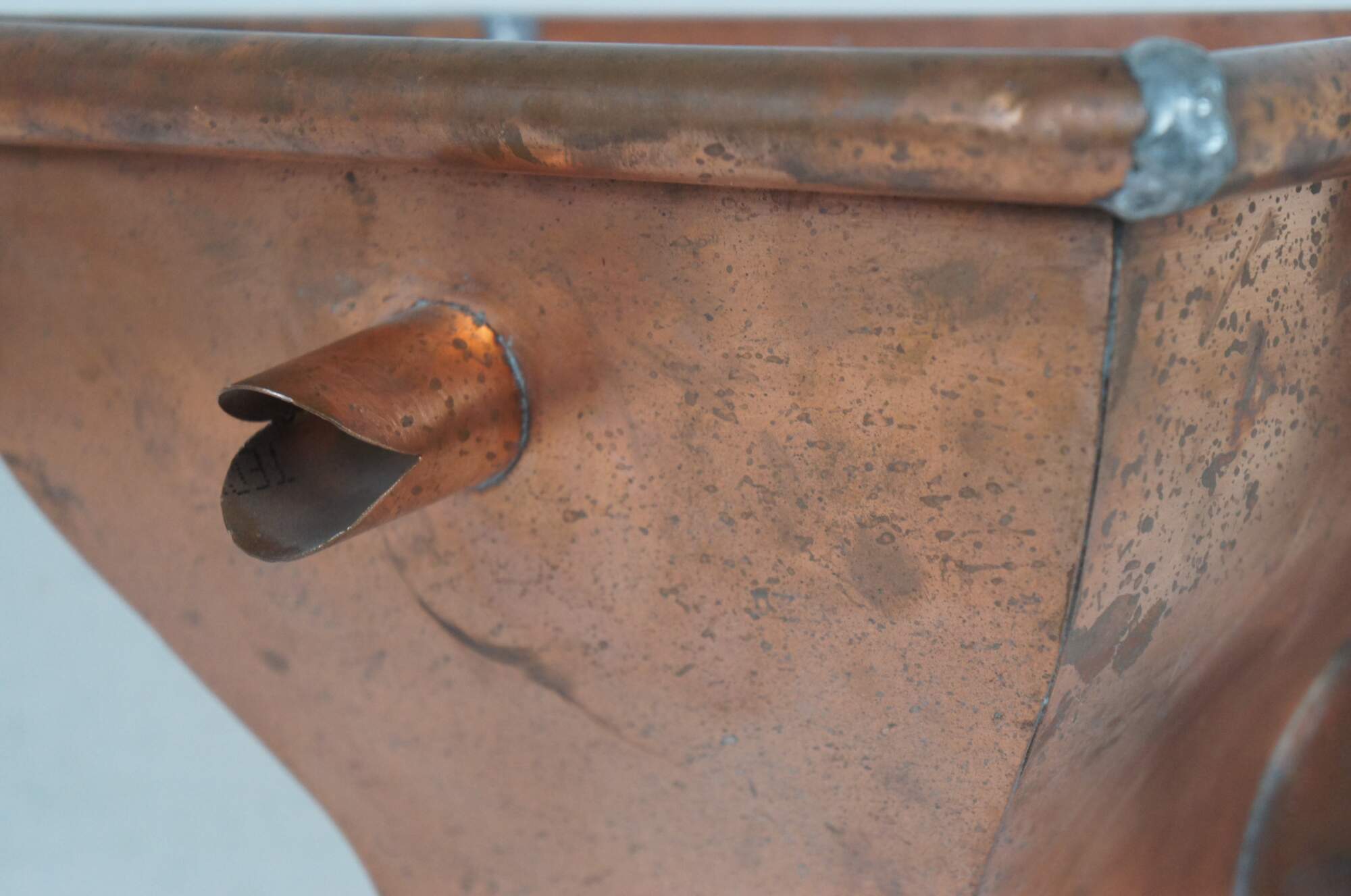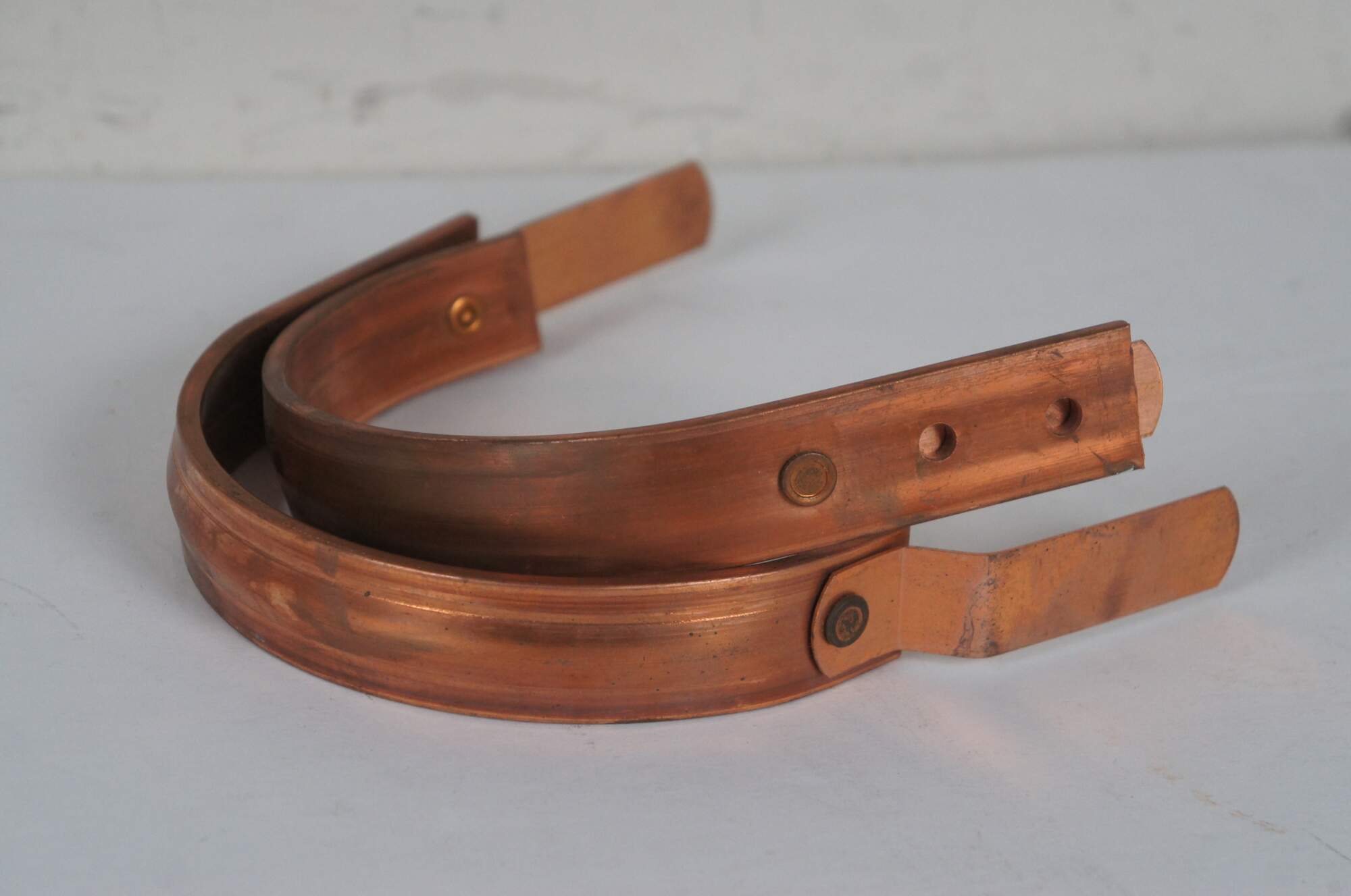 Pair of late 20th century copper gutter leader heads / leader boxes / hoppers with overflow pipe. Italian / Old Dutch styling with bird's beak shaped overflow spouts. Base Diameter 4". Includes two support brackets. No maker's mark.