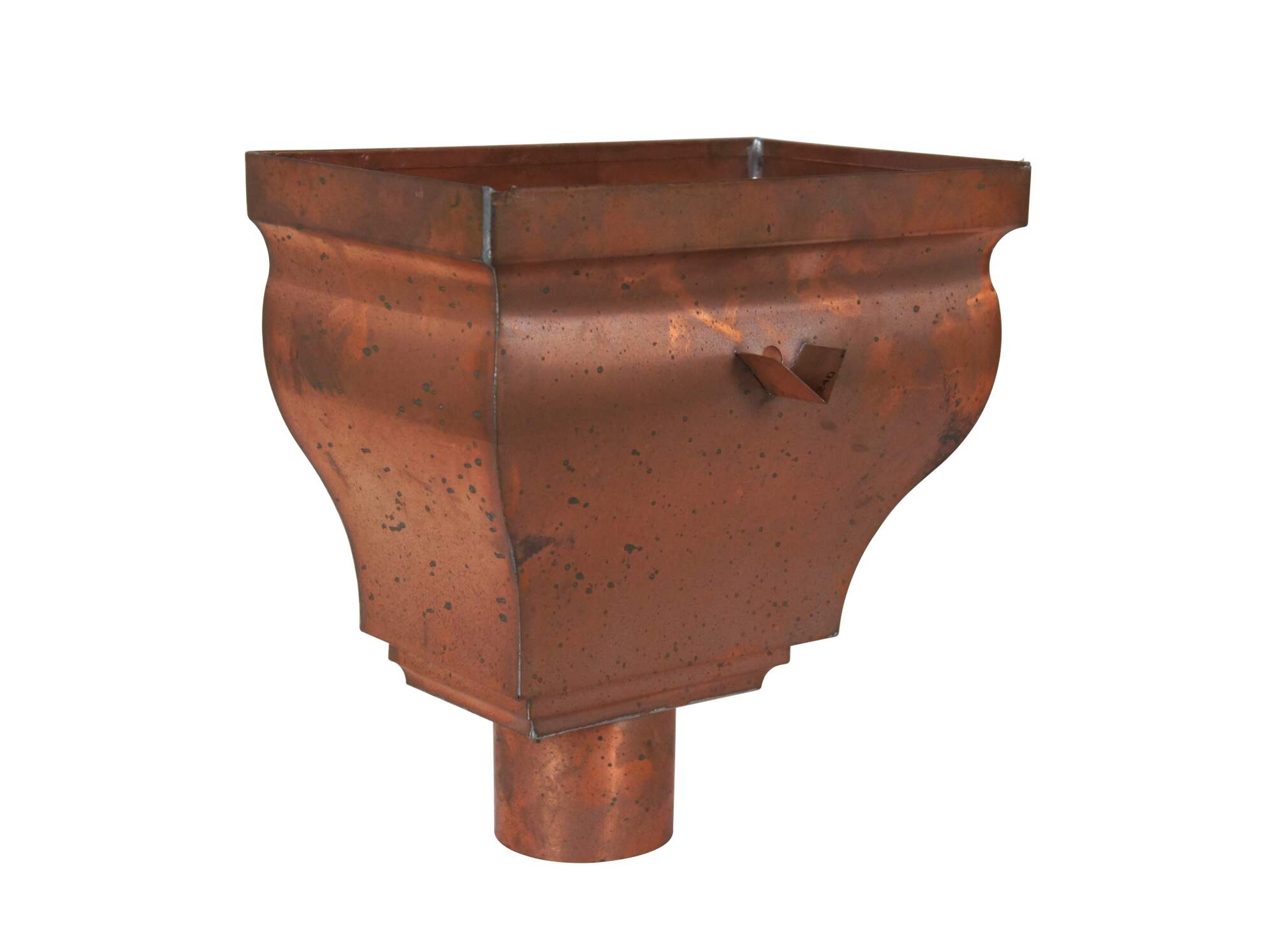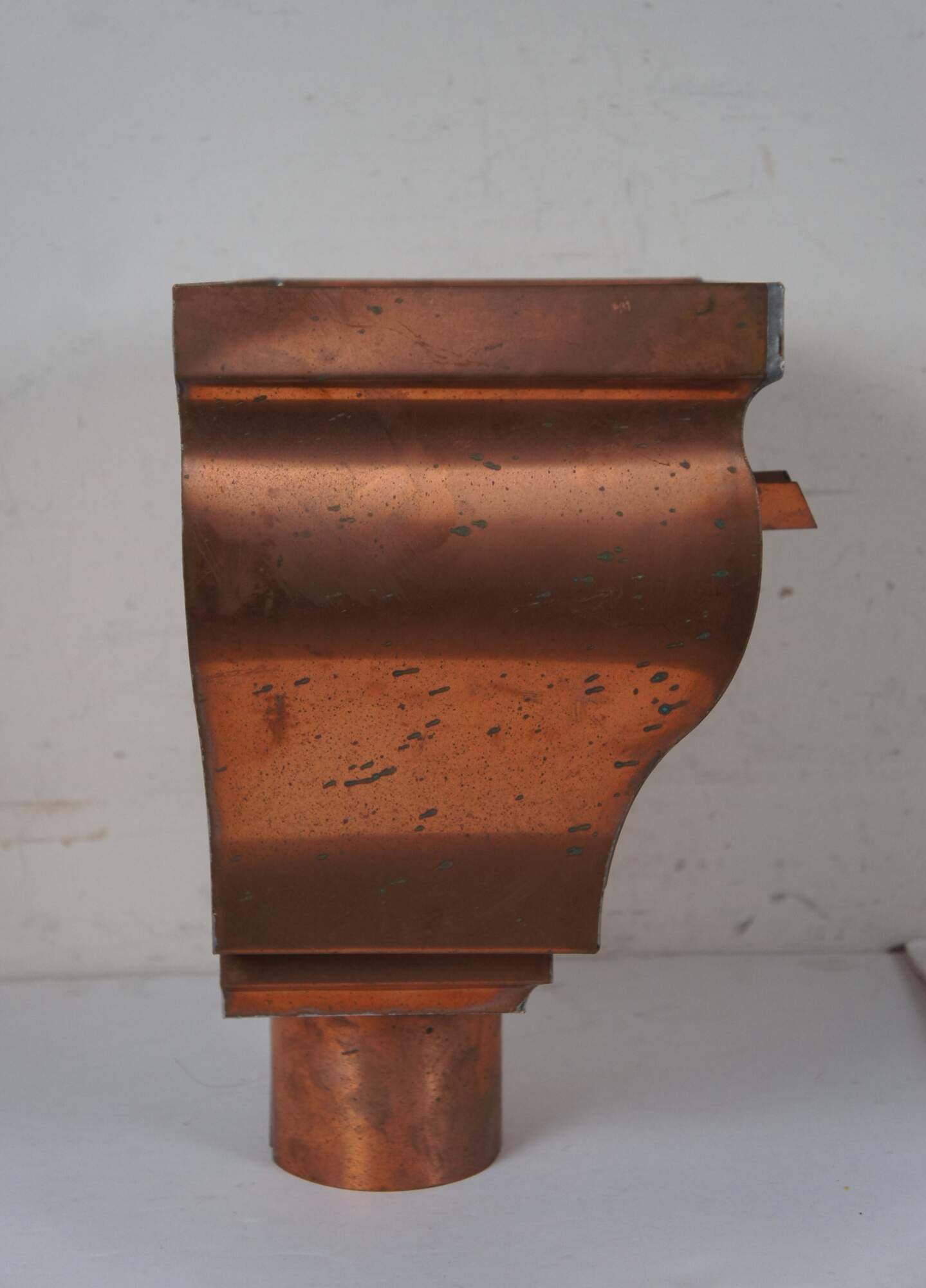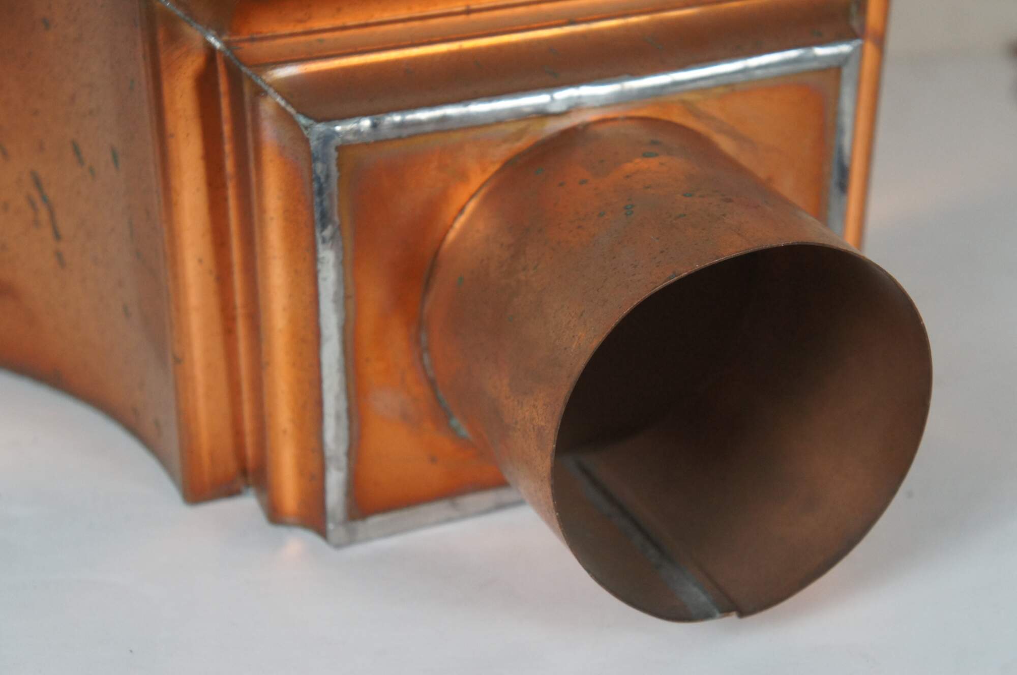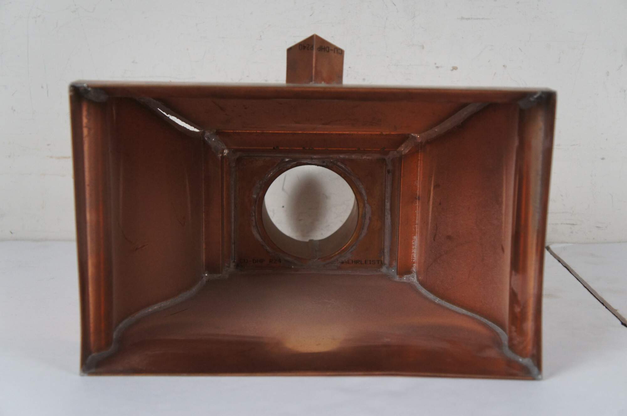 Late 20th century copper gutter leader head / leader box / hopper with triangular overflow spout. Possibly a Minoletti Deluxe. Stamped CU-DHP R24. Base Diameter 4". Includes one support bracket.