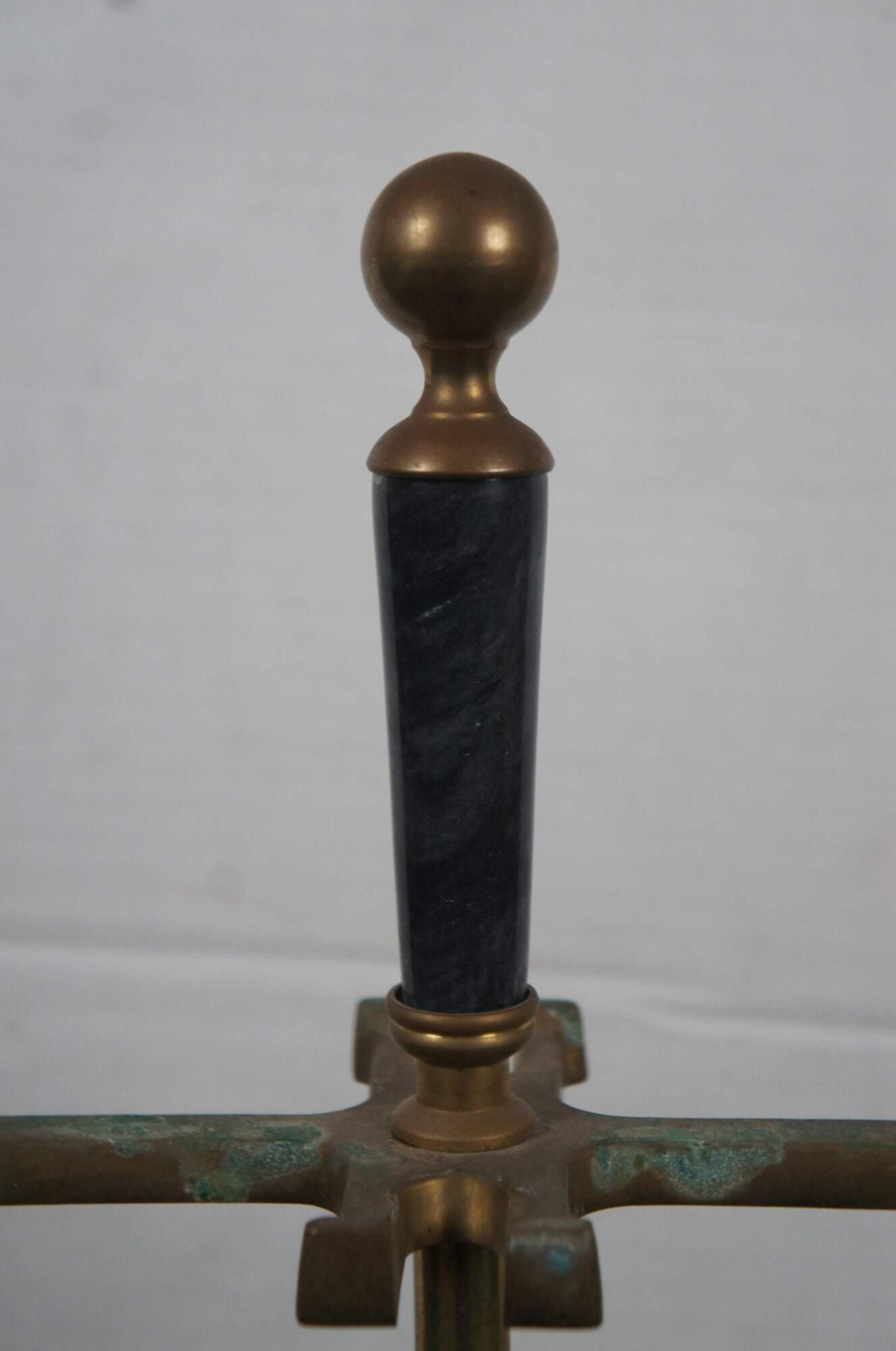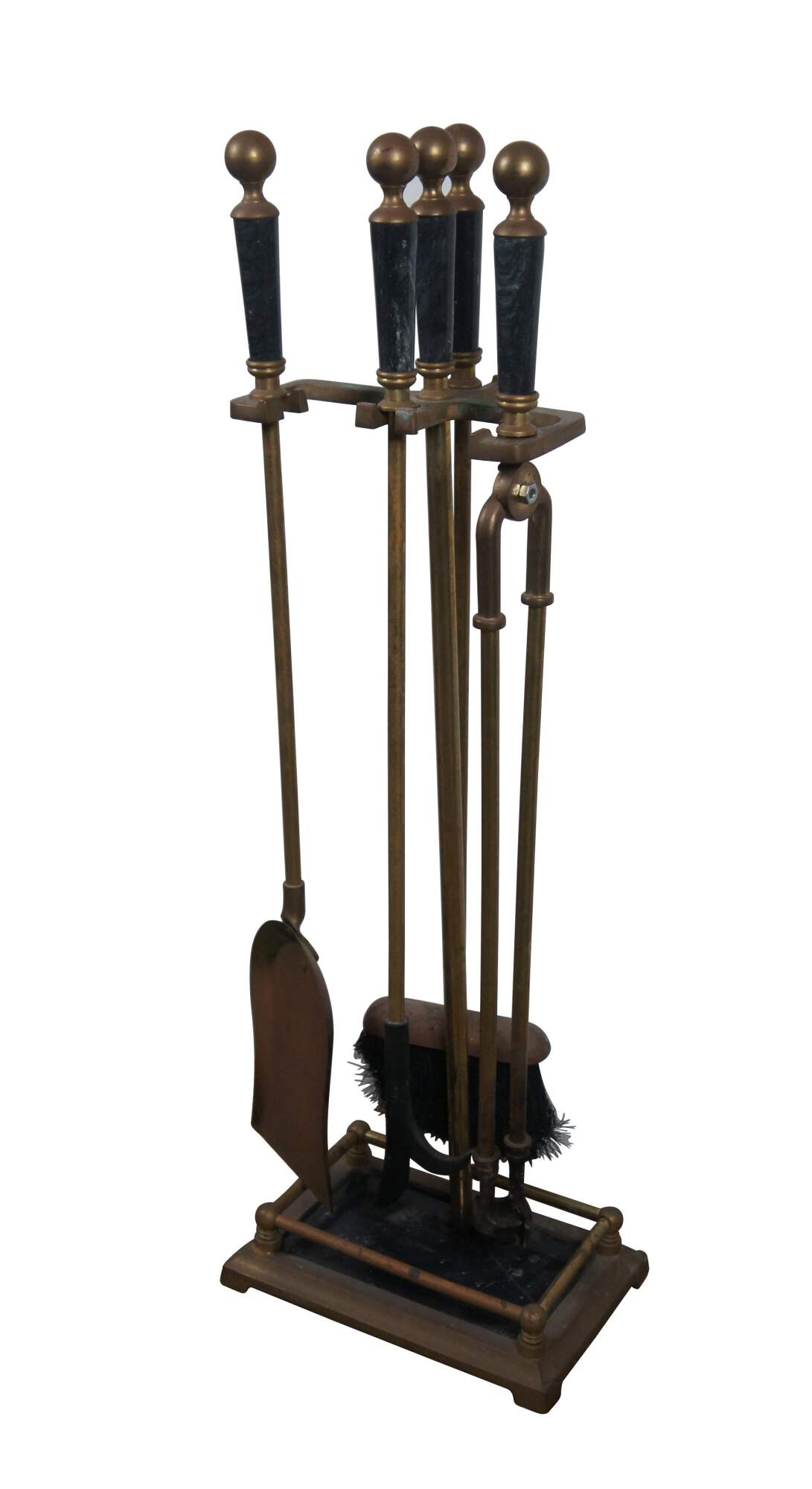 Mid to late 20th century five piece set of fireplace / hearth tools and stand by Decorative Crafts Inc, item number 2921. Made of brass with black marble base and tool grips with round finials. Set includes stand, shovel, poker, tongs, and brush.