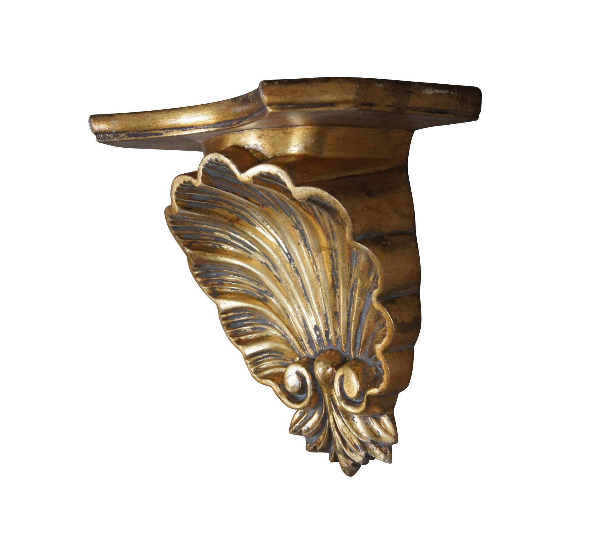 2 Gold Hollywood Regency sconces in the manner of Baroque / Rococo. Features am ornate gold sea shell motif. Hangs along the back via brackets.