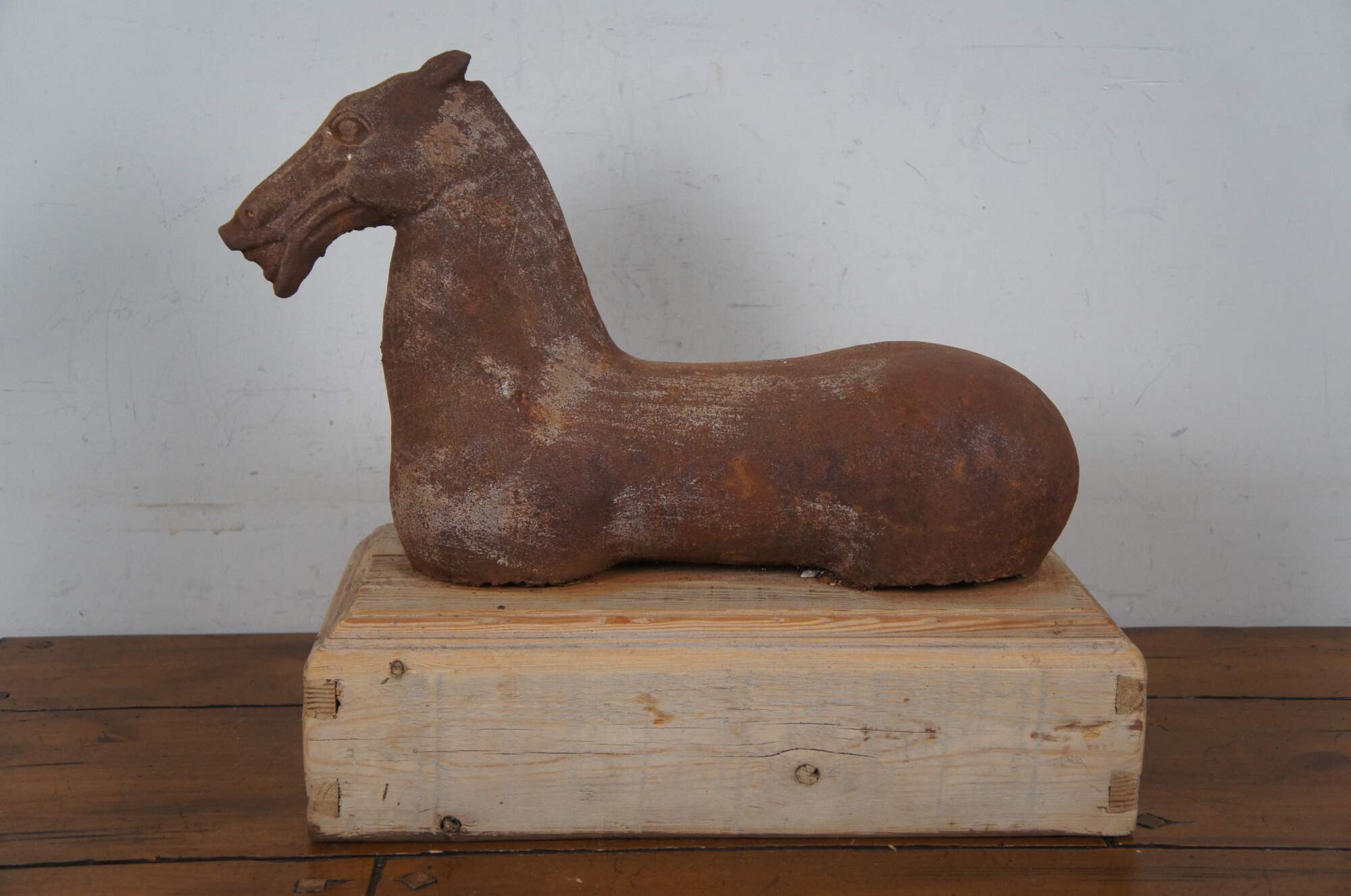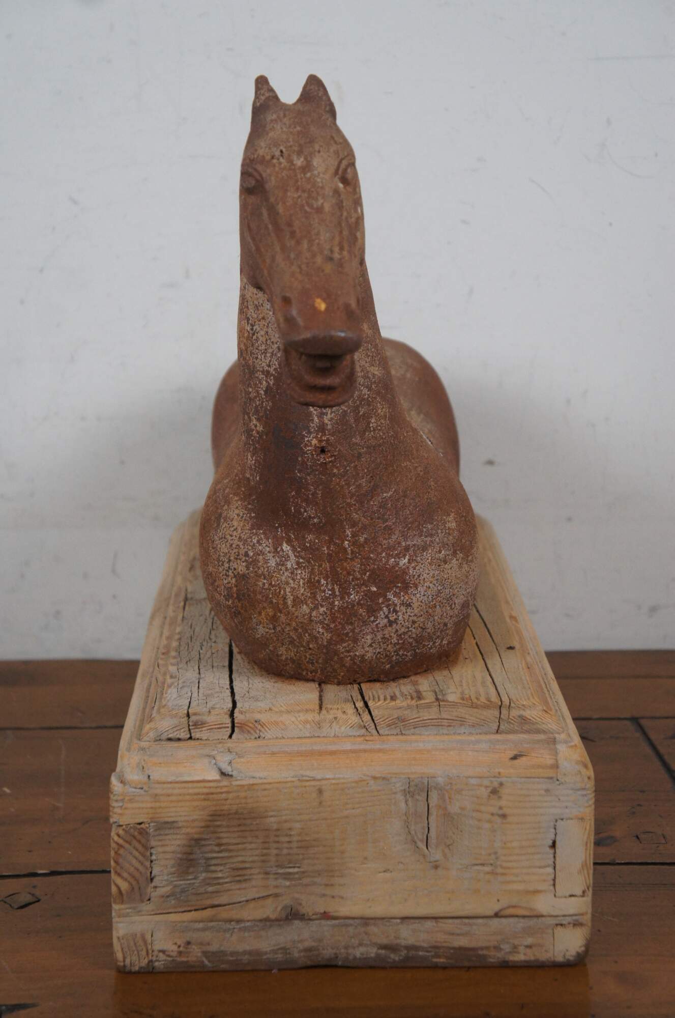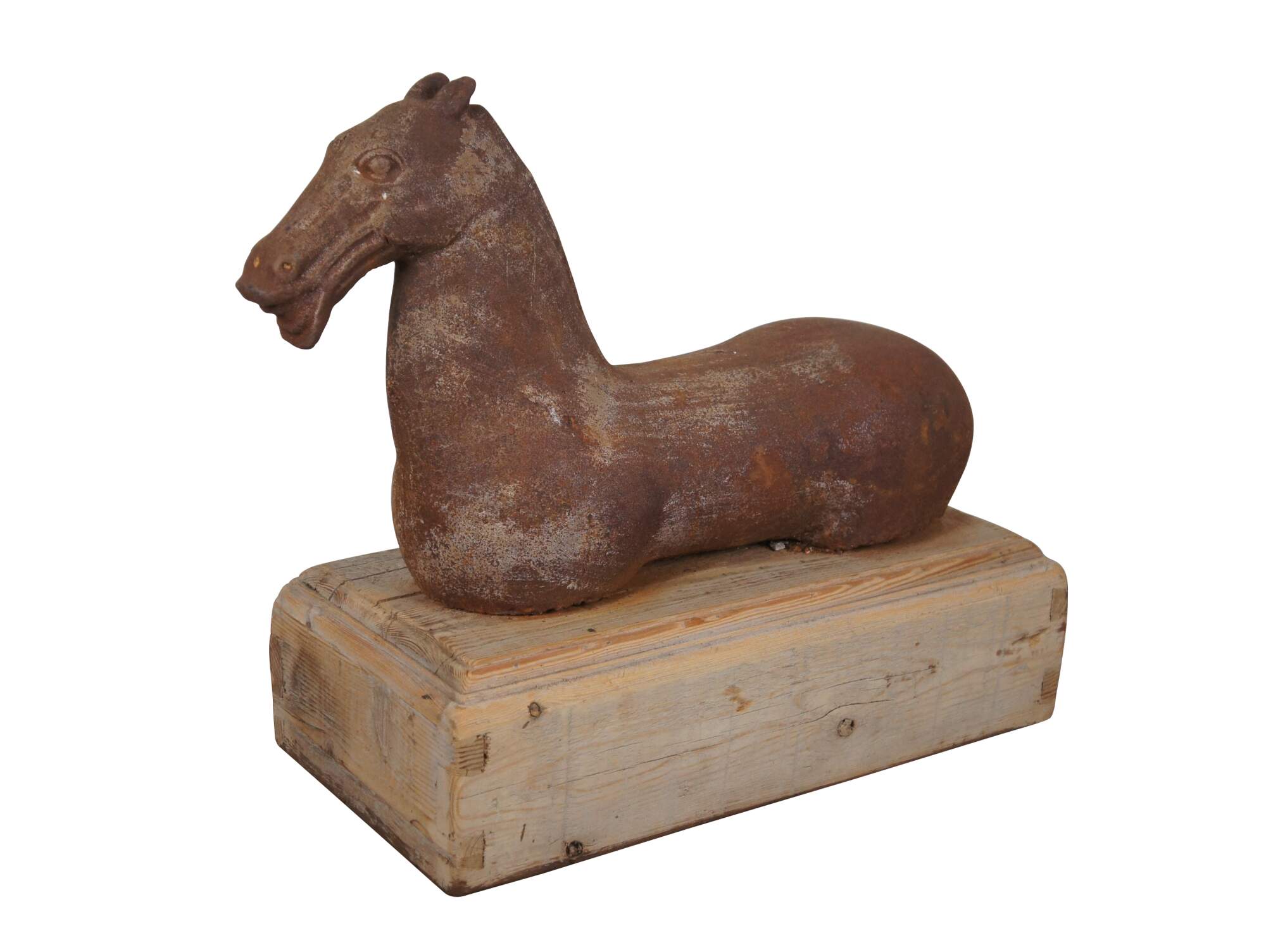 20th century cast iron sculpture or hitching post of a Han (or Tang) Dynasty style horse with muscular cheeks, open mouth and no legs. Mounted on a hollow, dovetailed, un-finished wood base.