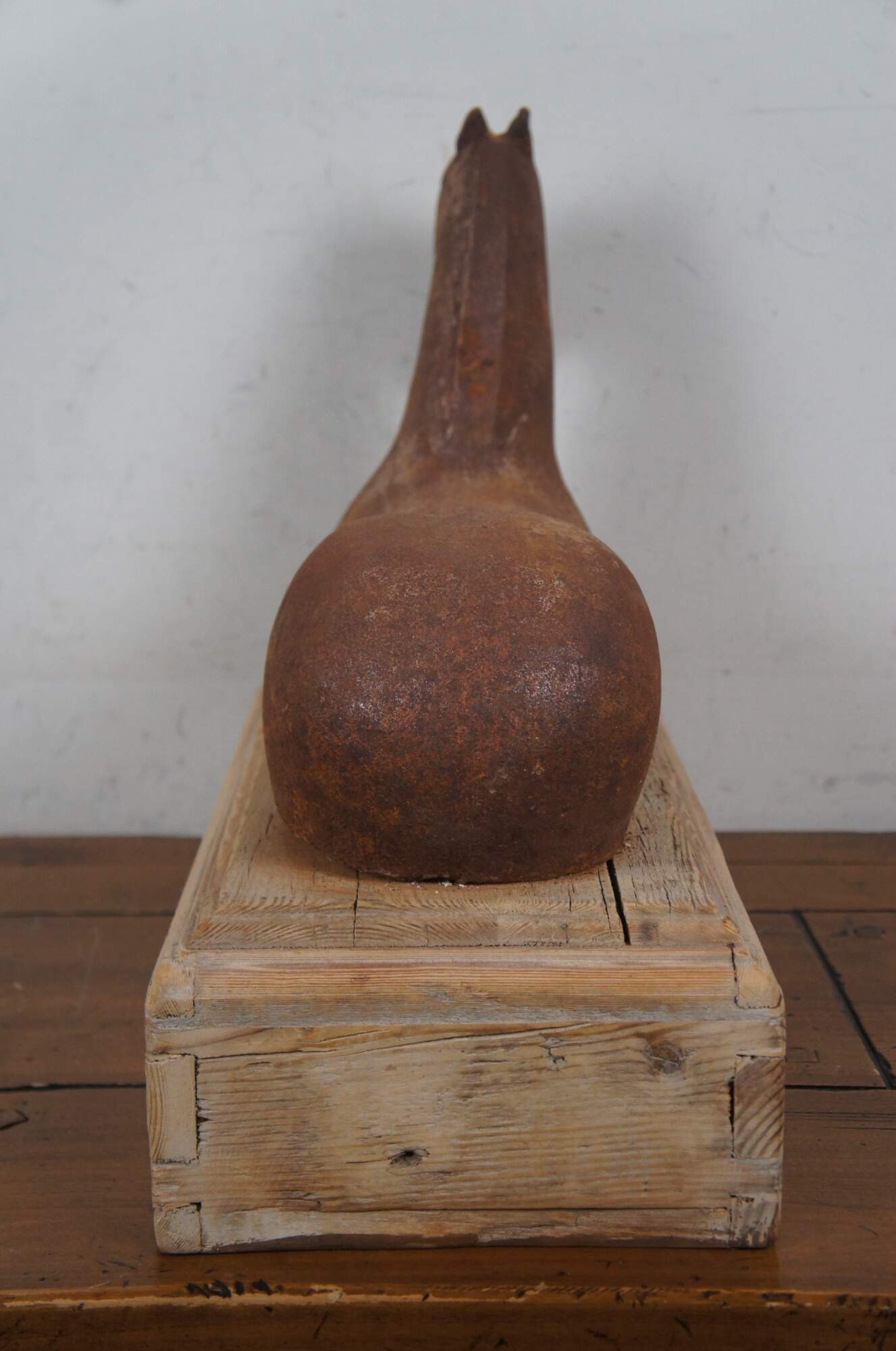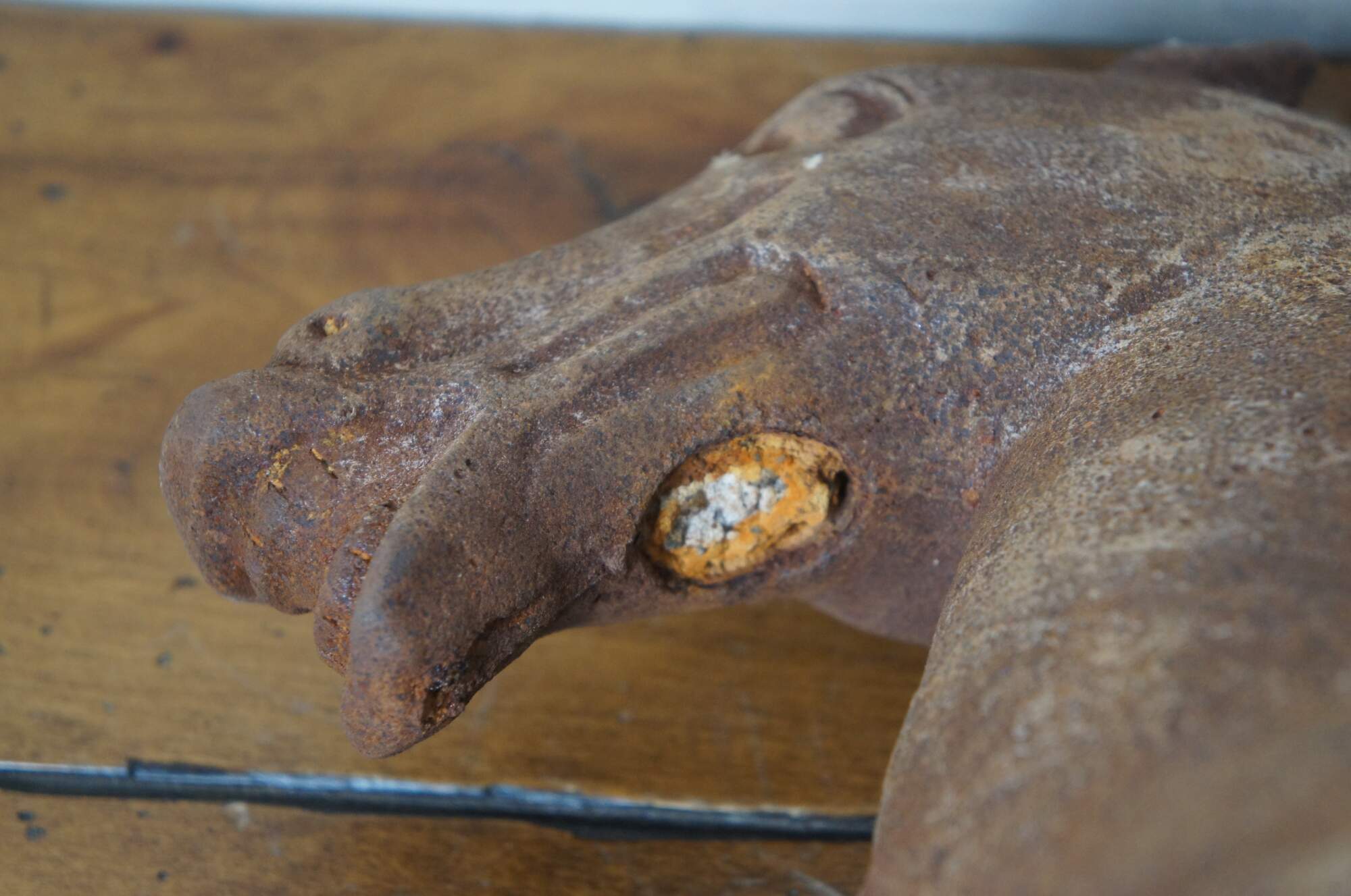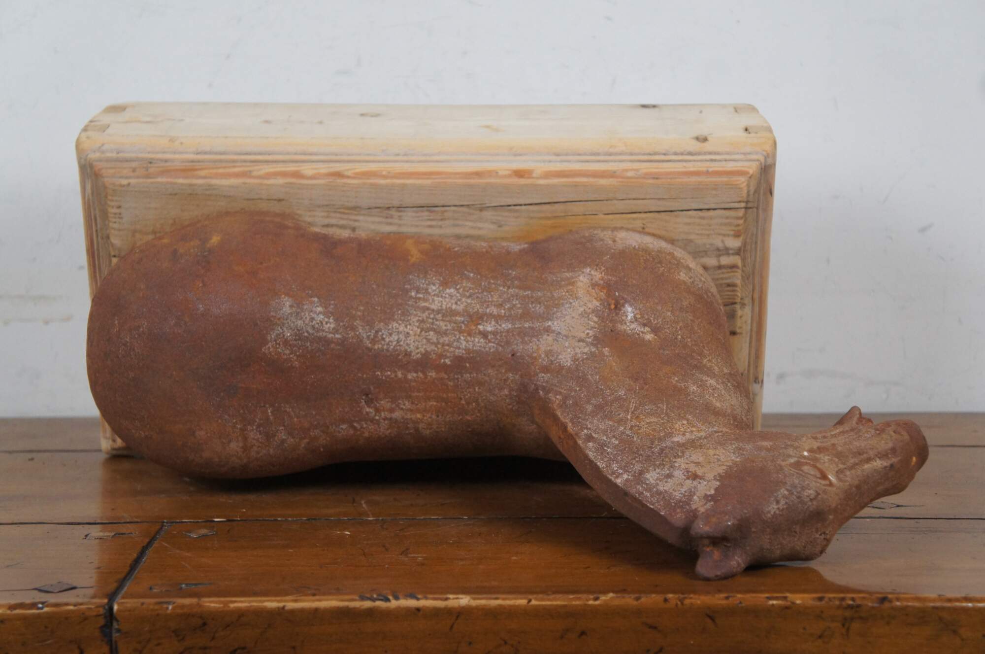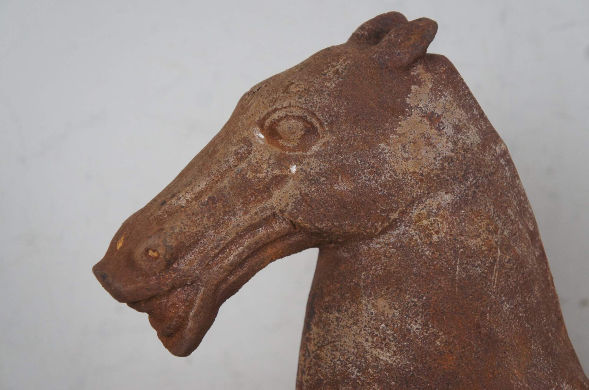 20th century cast iron sculpture or hitching post of a Han (or Tang) Dynasty style horse with muscular cheeks, open mouth and no legs. Mounted on a hollow, dovetailed, un-finished wood base.