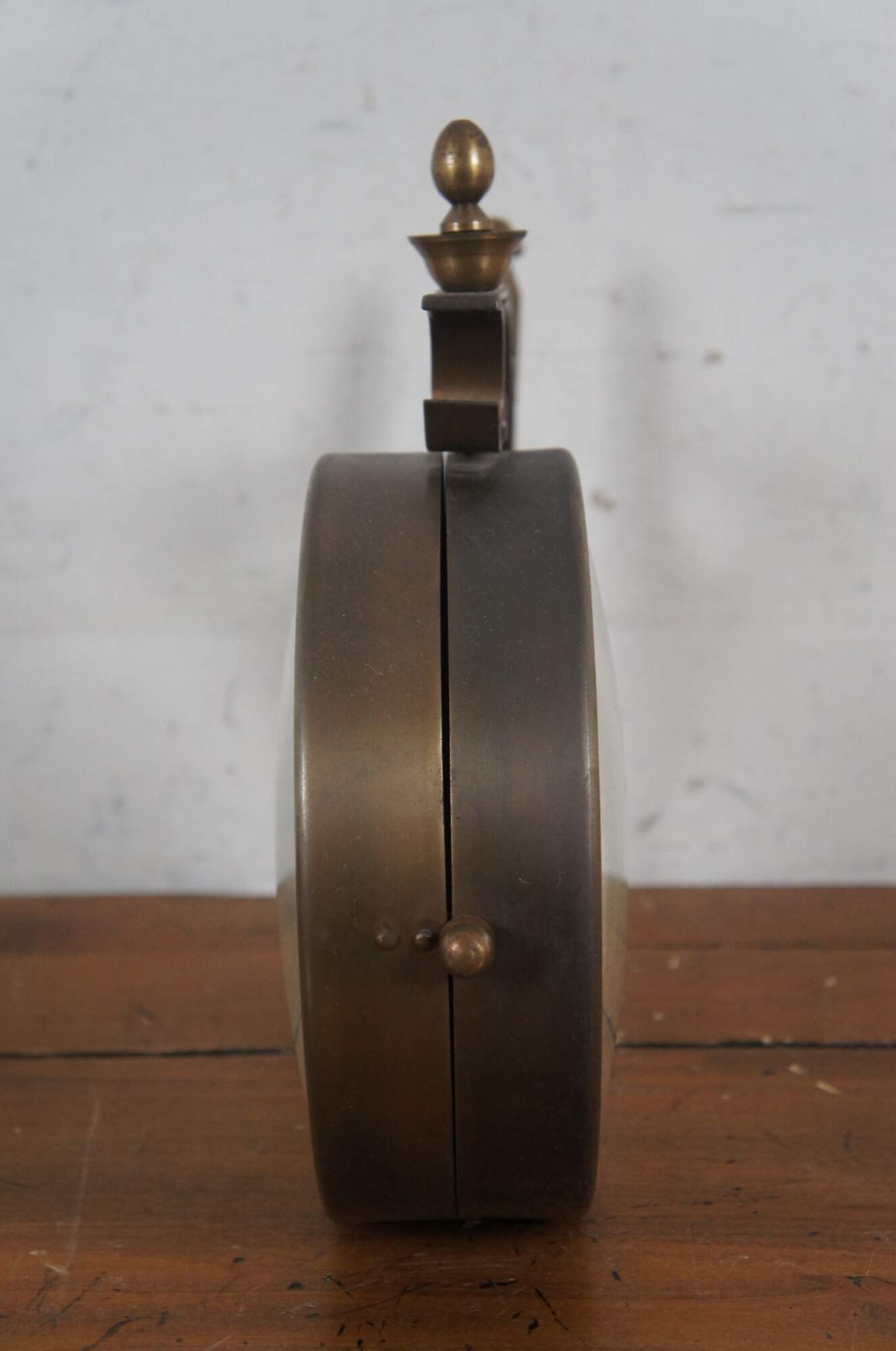3 Available - Late 20th century double sided railway clock styled after the famous clock at Victoria Station, London. Wrought metal wall mounted support and case in a dark brass finish. 8 inch diameter printed face with faux distressing, Roman numerals, and the words Victoria Station 1747 in orange. Black metal hands. Young Town Quartz, battery operated movement.