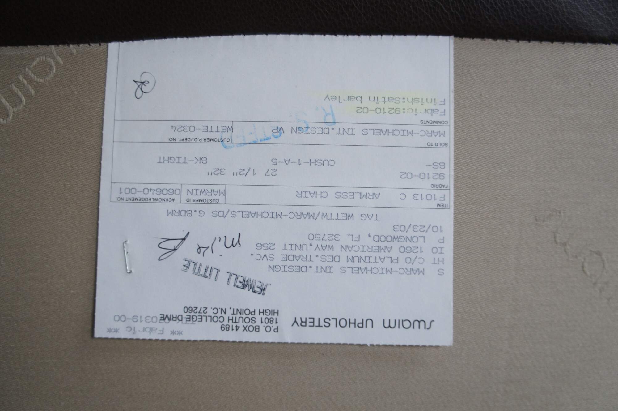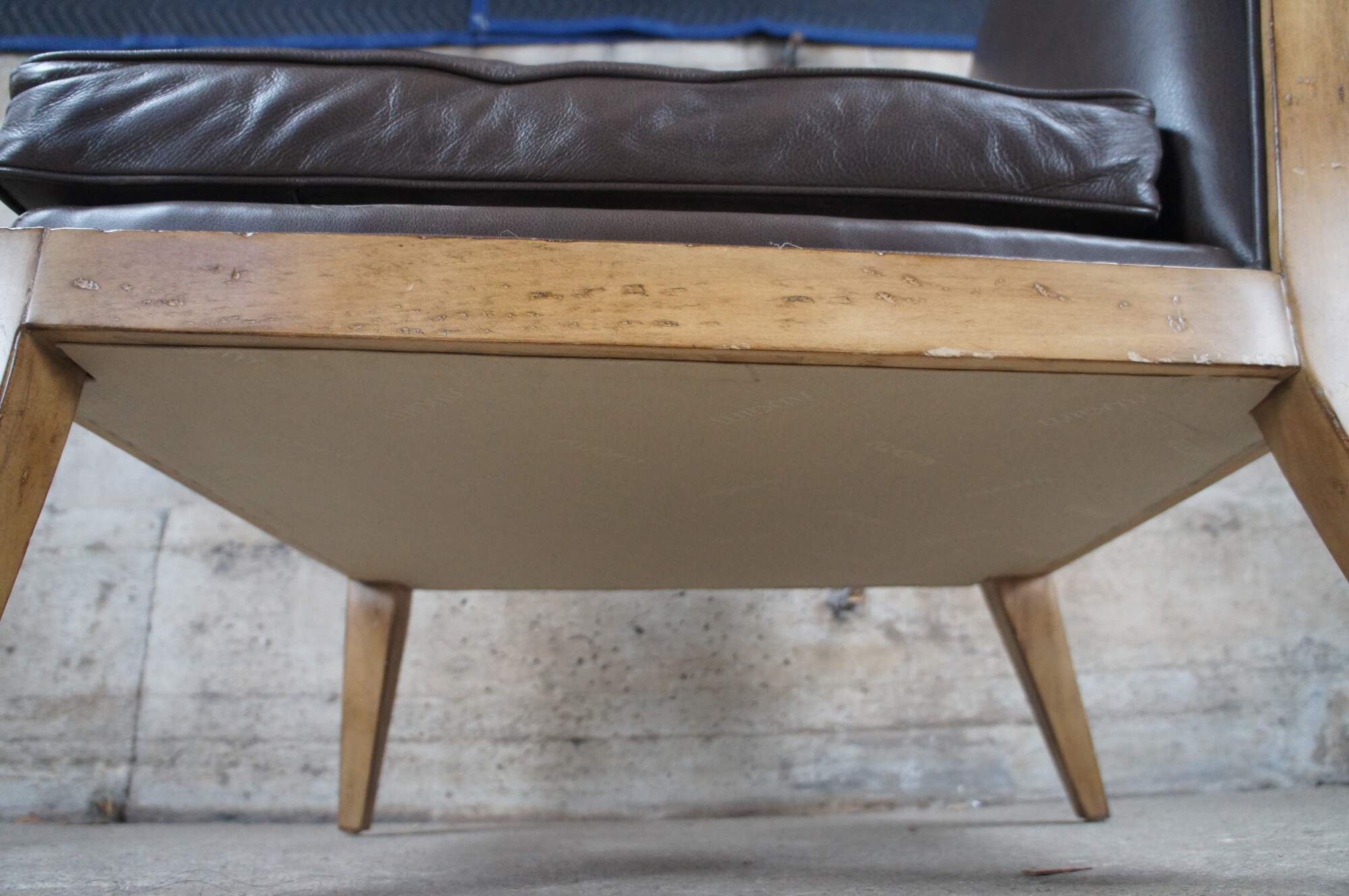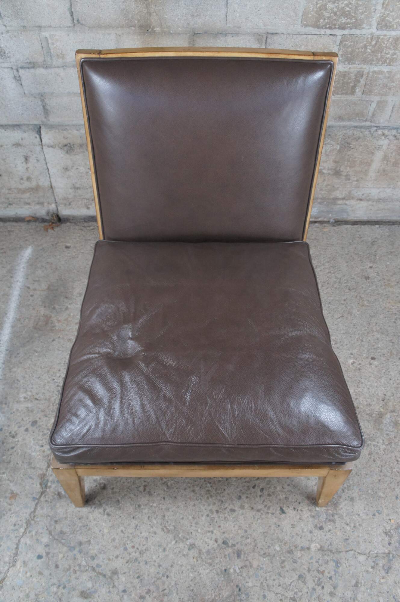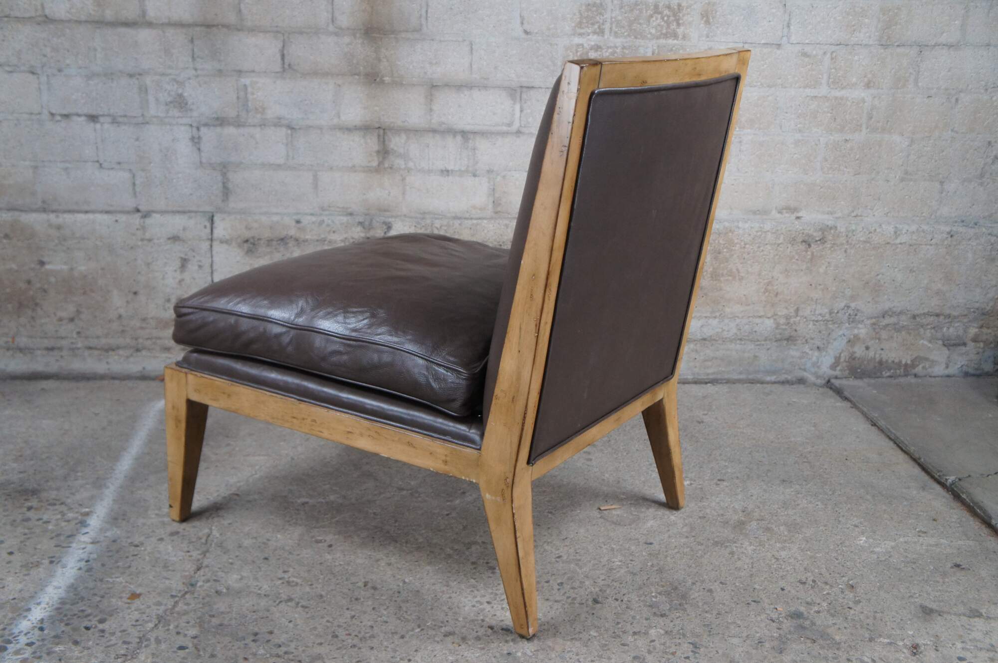 A beautiful armless slipper chair by Swaim Upholstery. Originally made for Marc-Miachaels Interior Design. Features brown leather upholsterly and an oak frame. The chair is supported by square tapered legs. A seemless modern design that will make a splash in any setting.