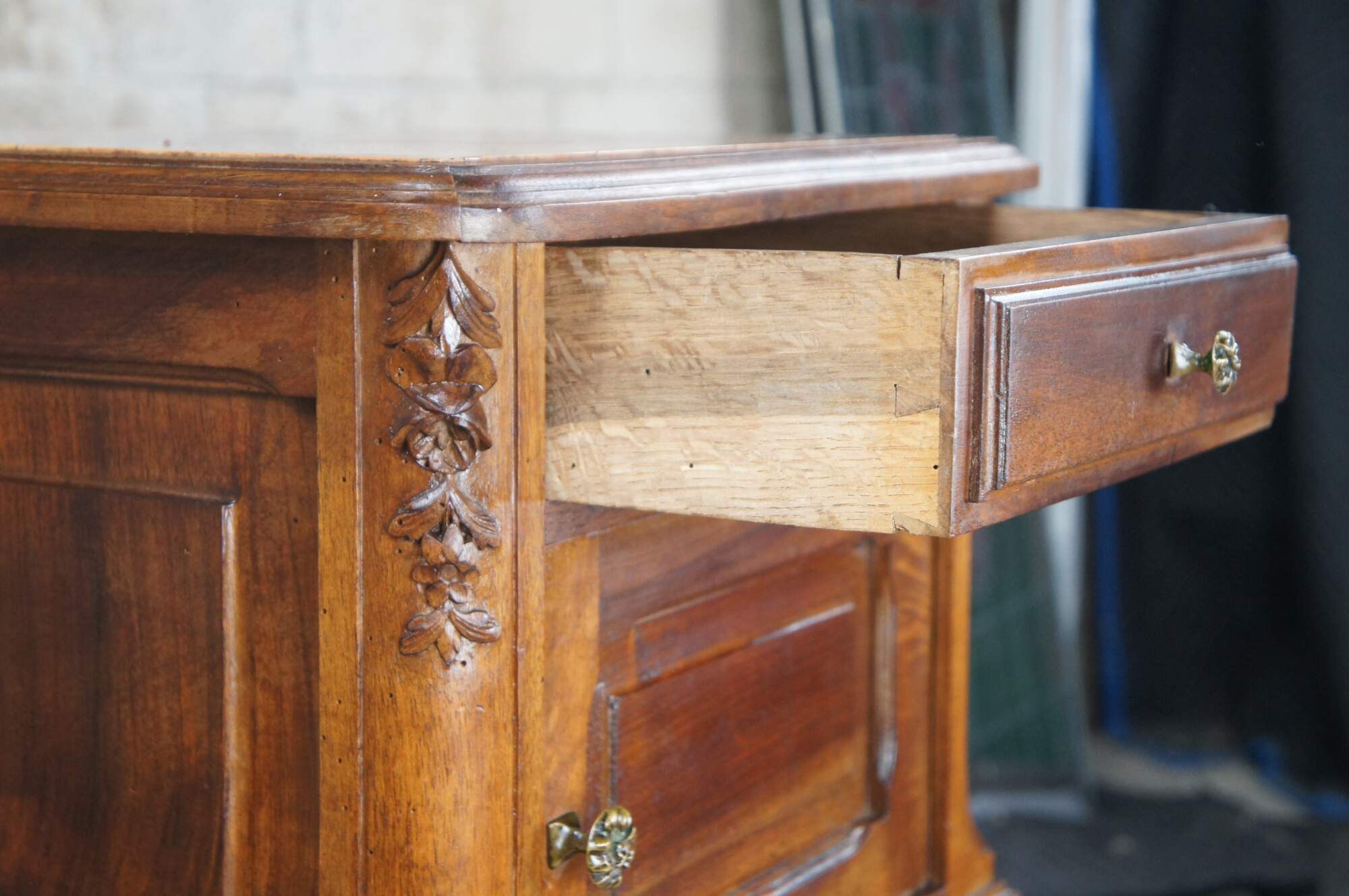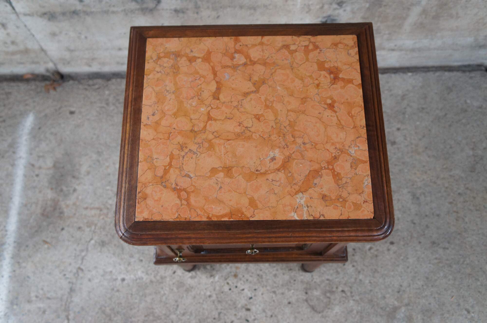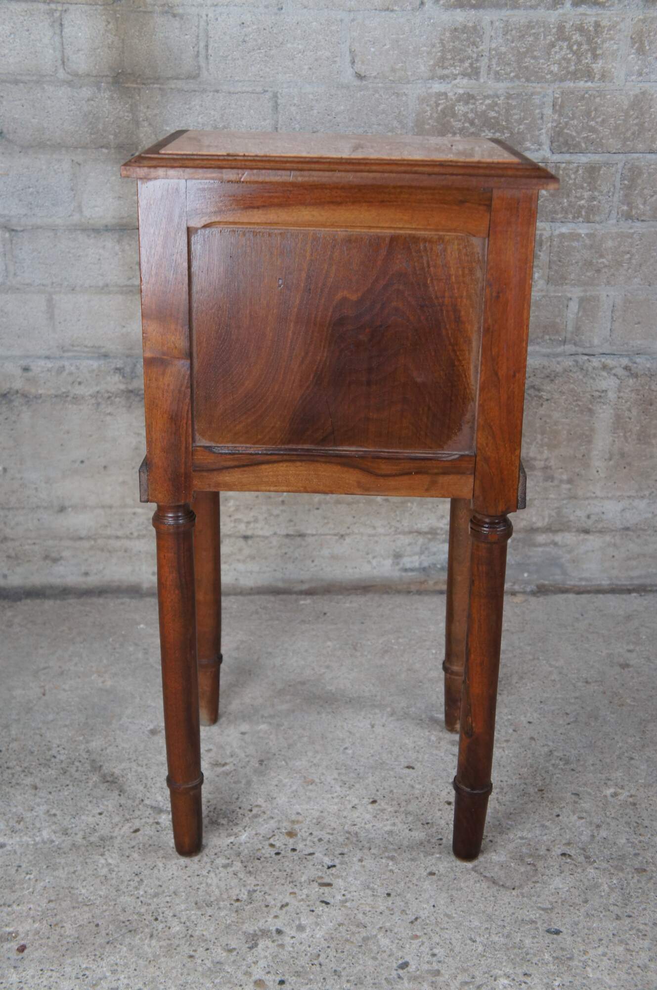 A quaint 19th century French bedside table / cabinet. Made from walnut with inset travertine top. Features a central hand dovetailed drawer made from oak and lower cabinet. Stiles are chamfered and carved with foliate motif. The cabinet rests on long legs that taper towards the feet.