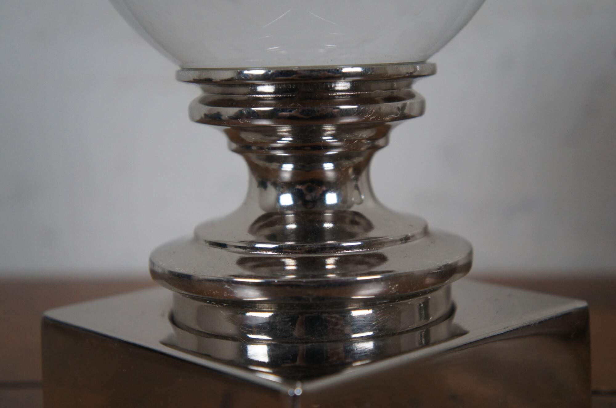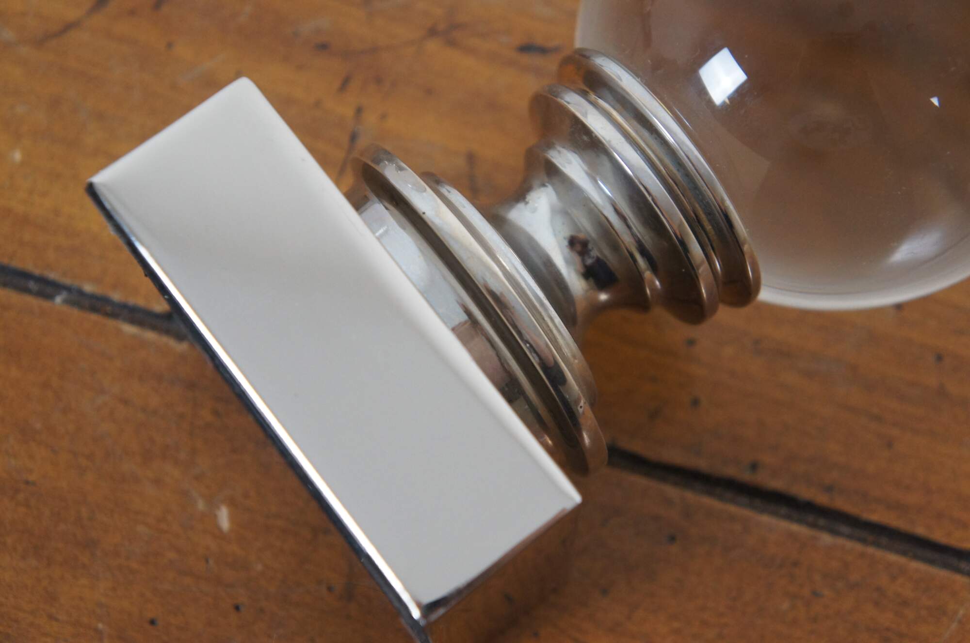 Pair of Restoration Hardware bookends / paperweights, featuring a clear crystal ball perched on a chrome finished turned pedestal.