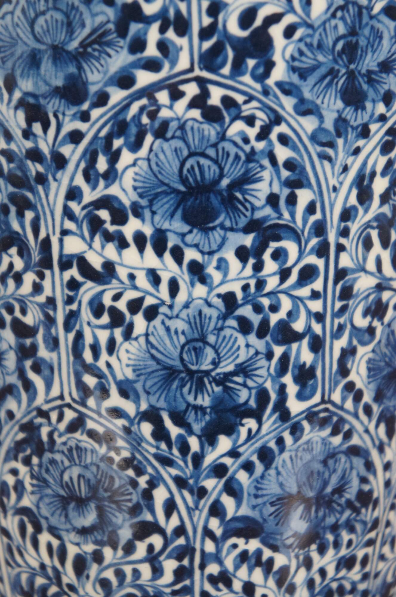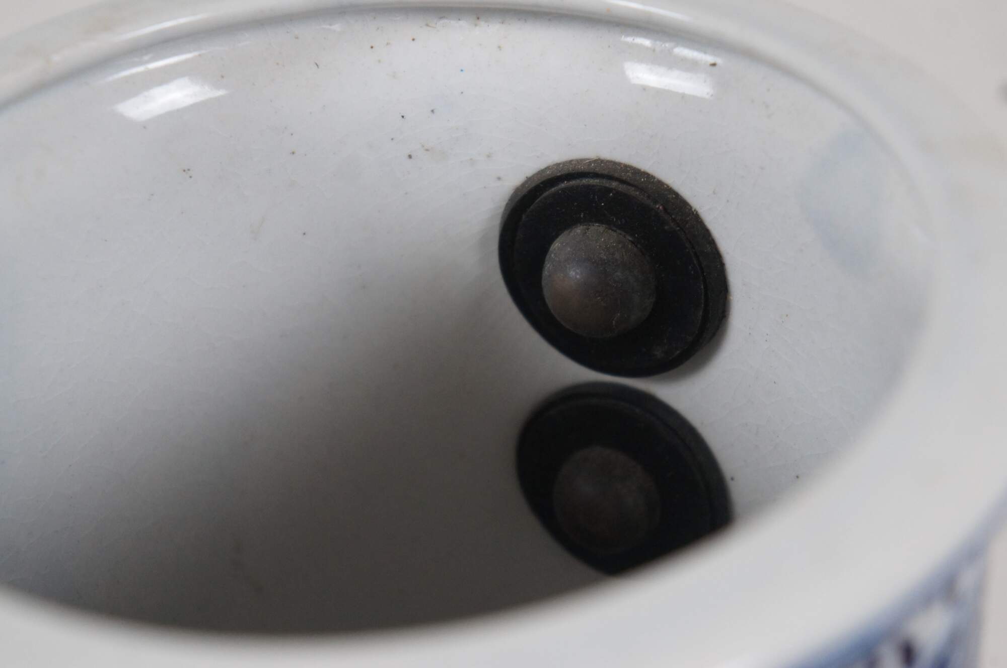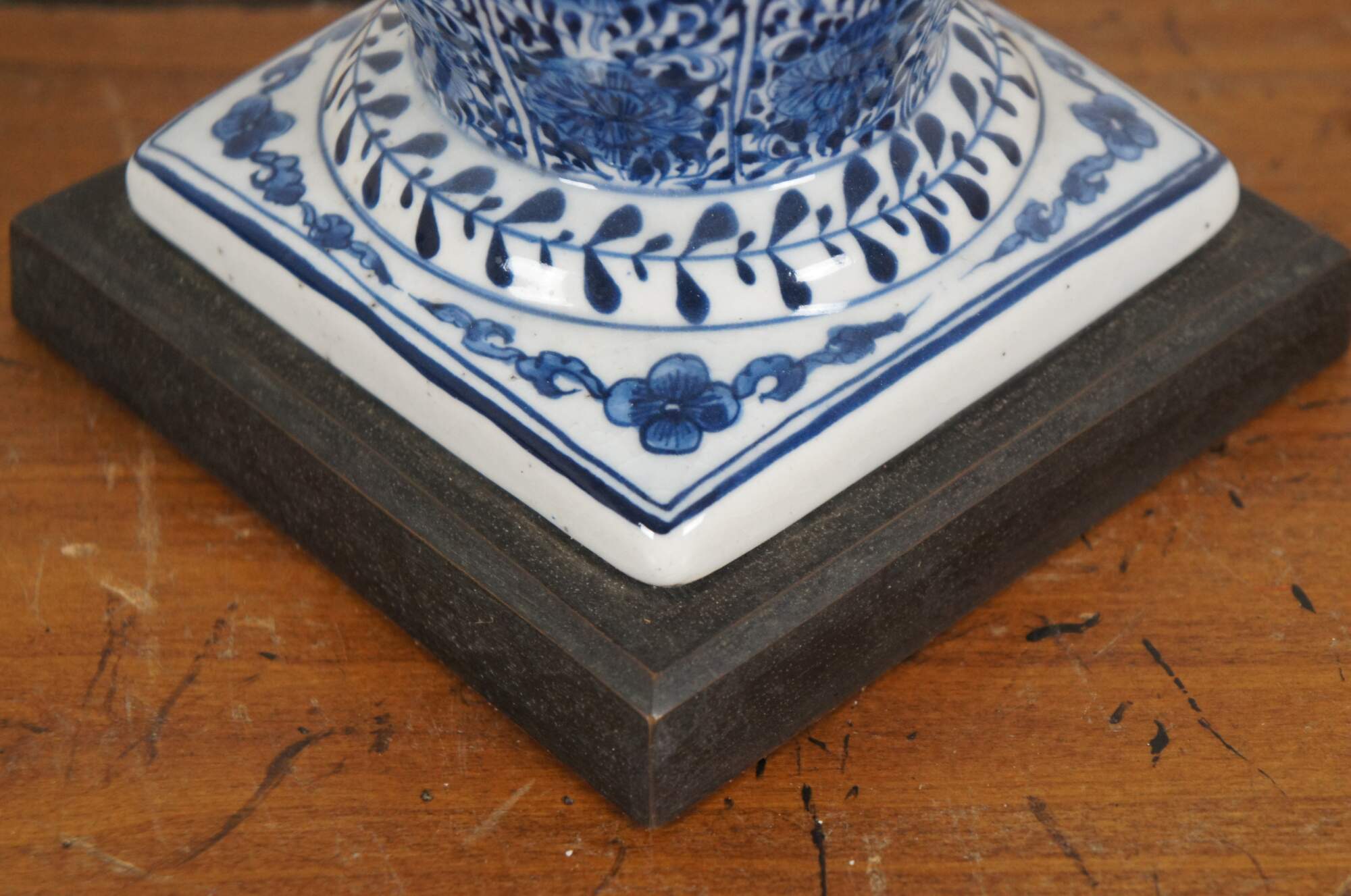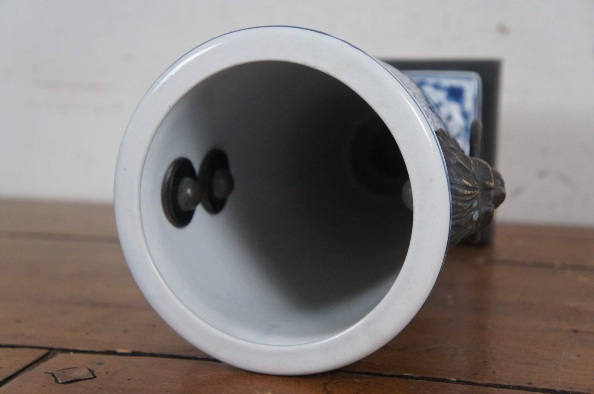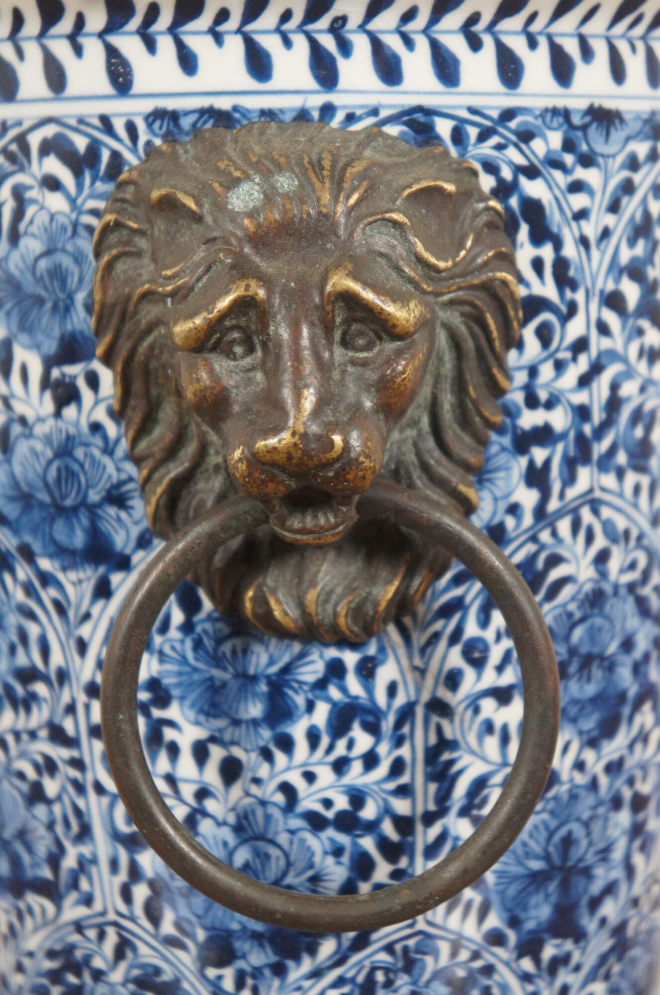 Vintage blue and white lotus flower porcelain vase with metal plinth base and lion's head holding ring handles. Attributed to Theodore Alexander.