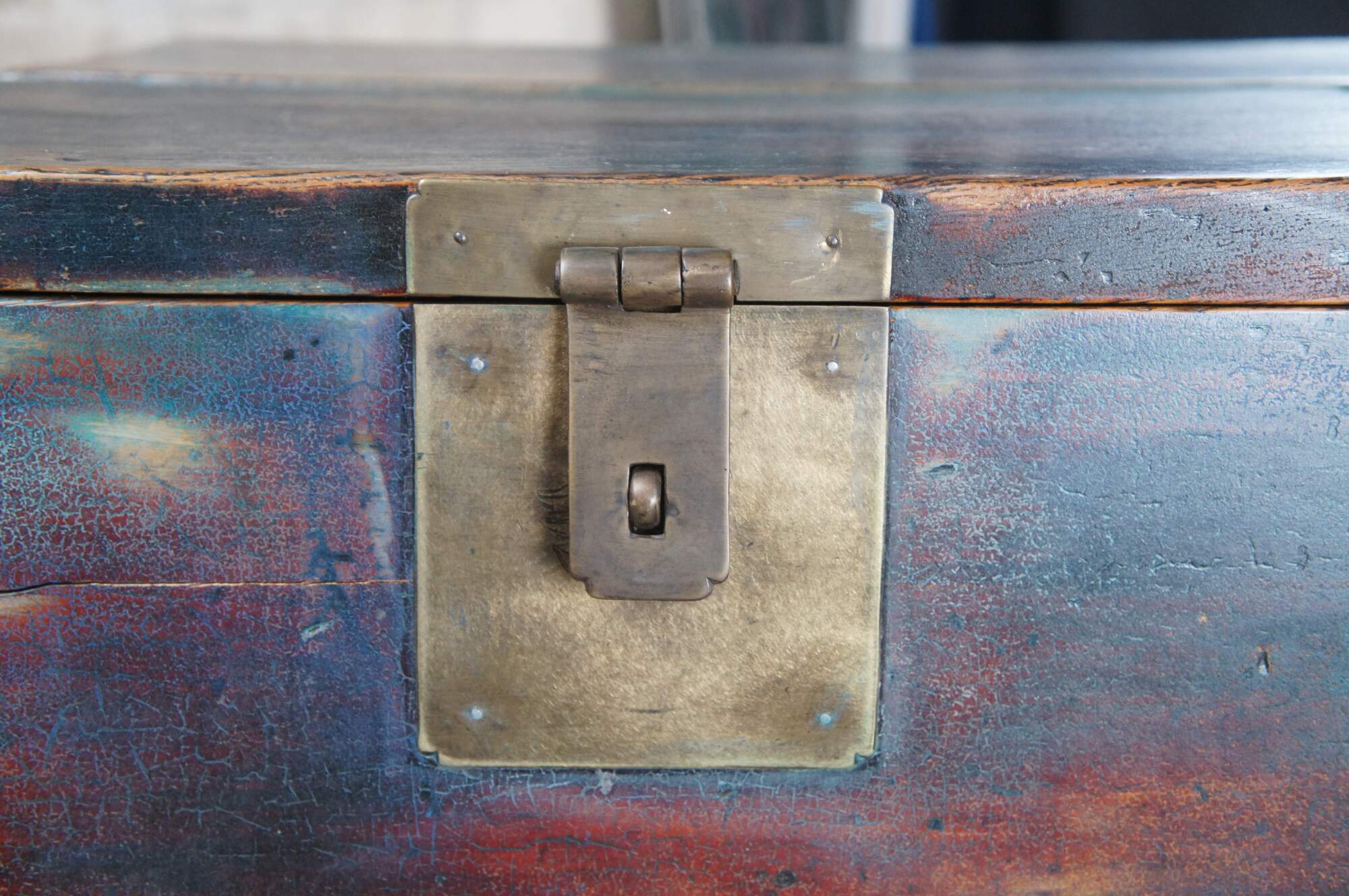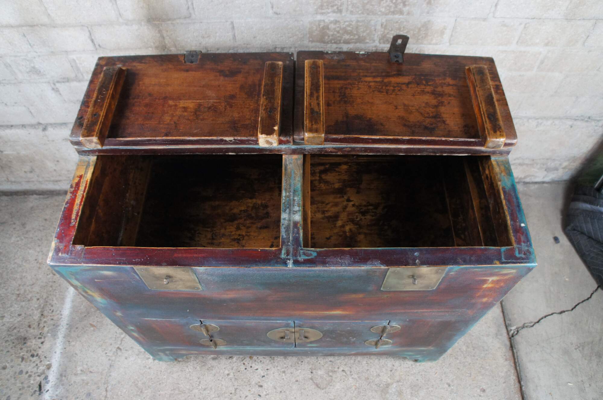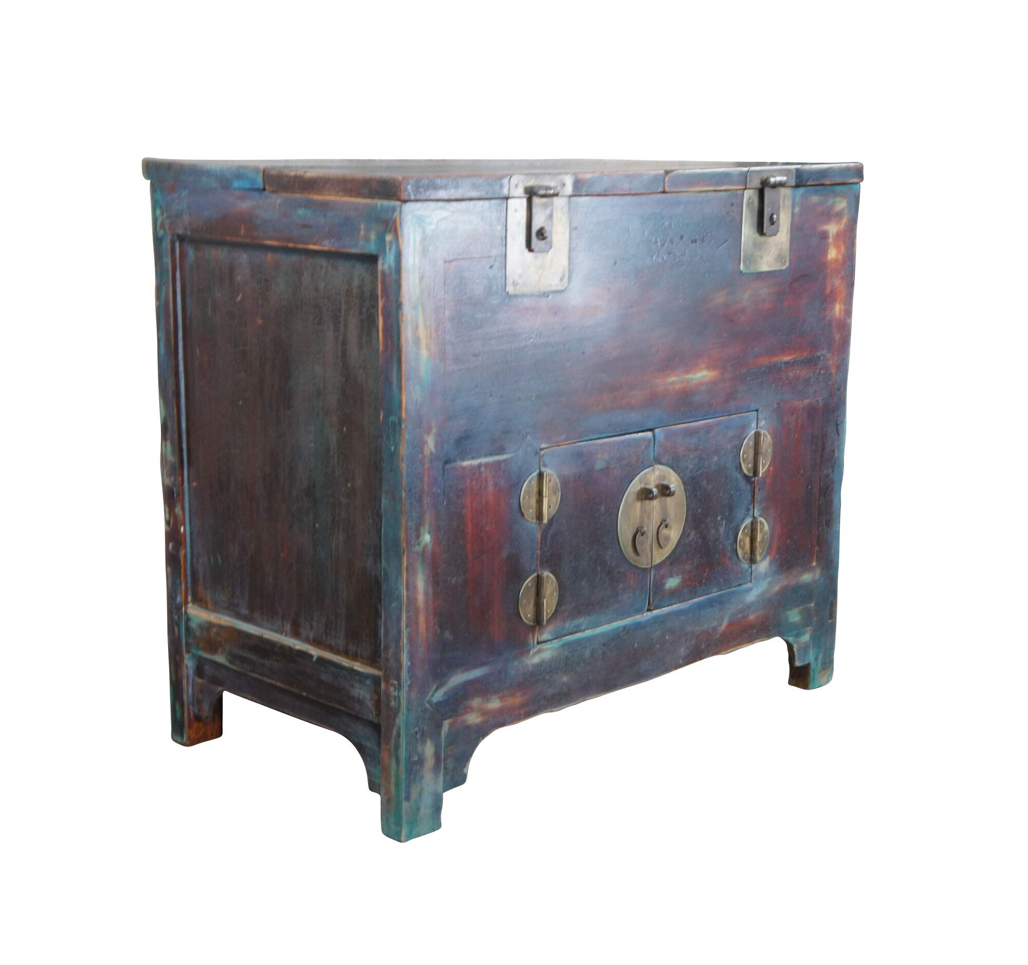 Late Qing Dynasty iridescent painted Elm Money Trunk / Storage Chest. Made in Shandong East China, circa 1870s. Features two upper compartments and lower cabinet for accessory storage. Upper compartments have brass latches allowing them to be locked while lower cabinet has classic Chinese moon hardware. The chest is made with mortise and tenon construction.