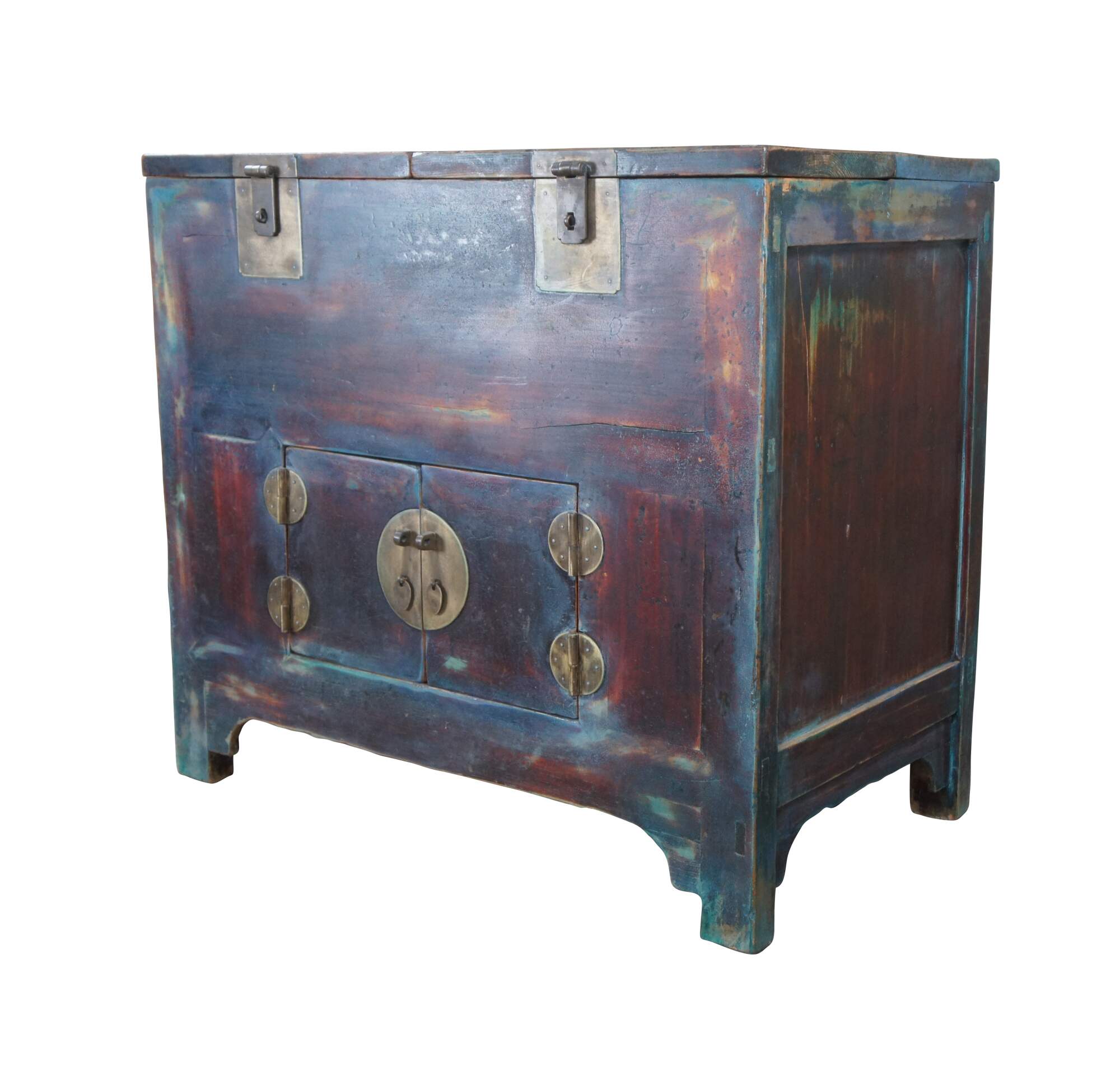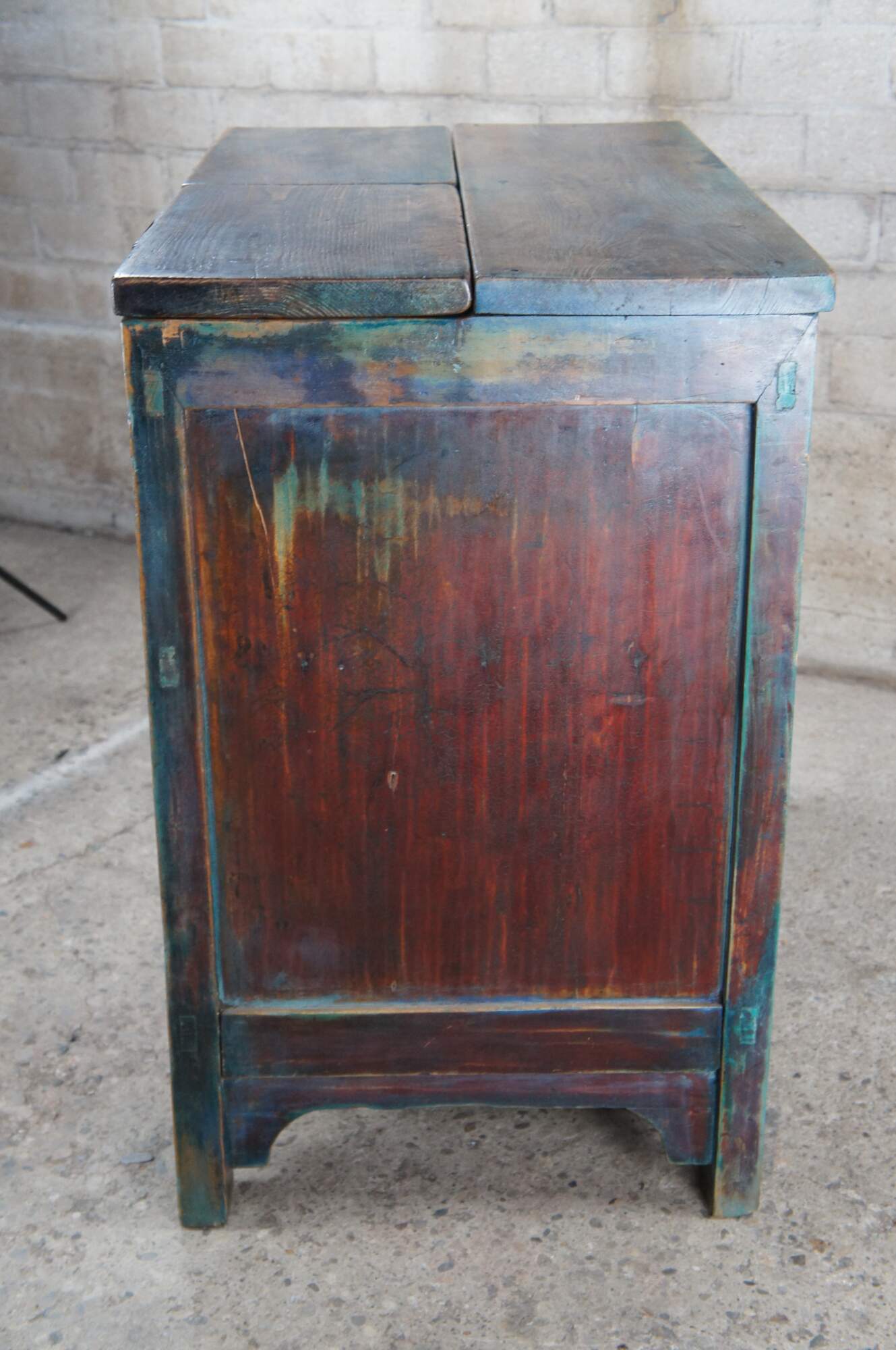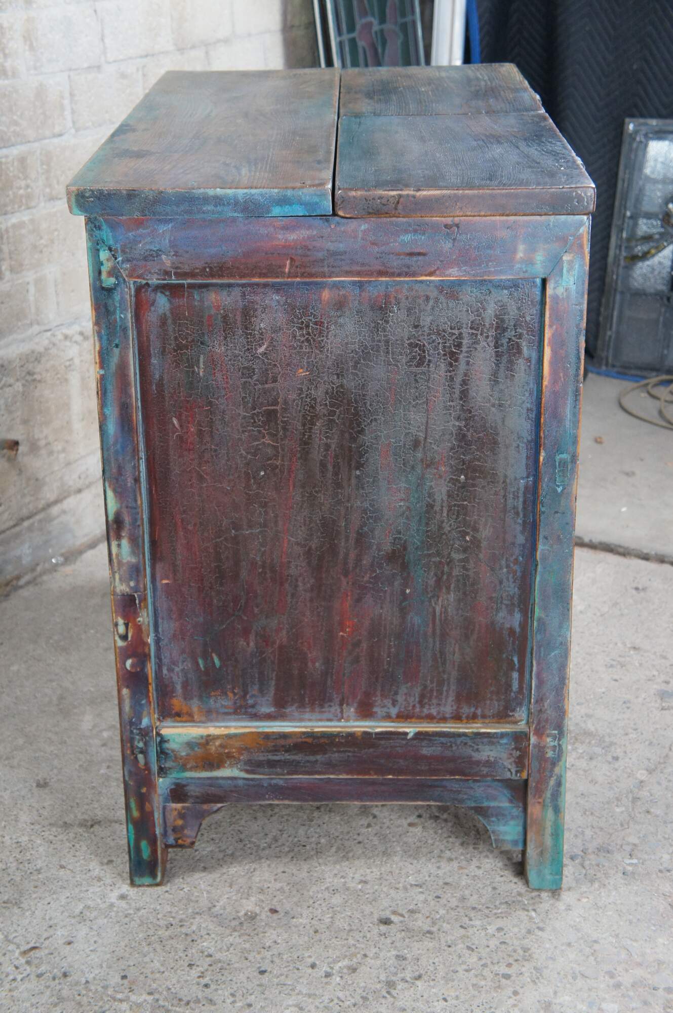 Late Qing Dynasty iridescent painted Elm Money Trunk / Storage Chest. Made in Shandong East China, circa 1870s. Features two upper compartments and lower cabinet for accessory storage. Upper compartments have brass latches allowing them to be locked while lower cabinet has classic Chinese moon hardware. The chest is made with mortise and tenon construction.
