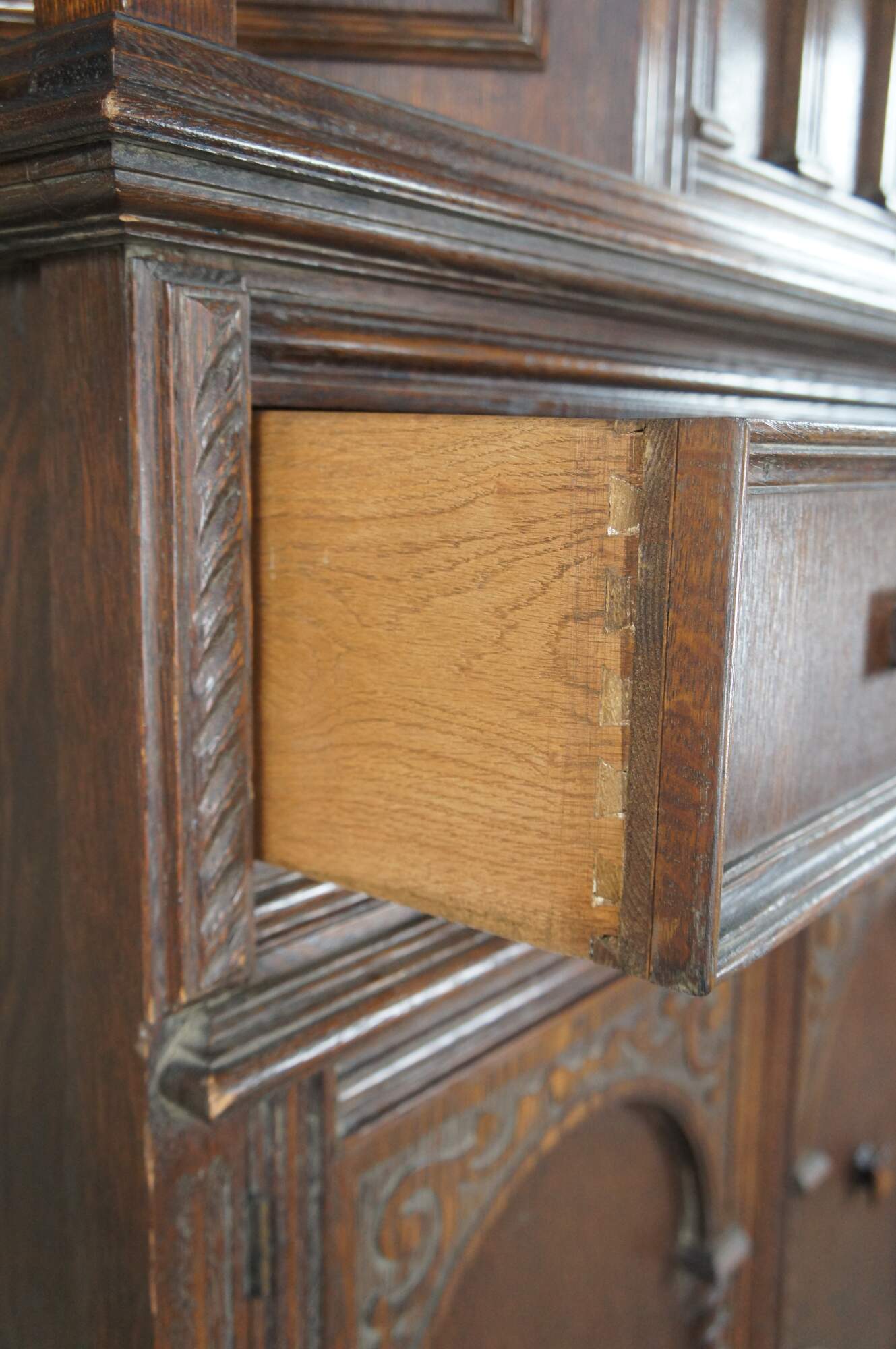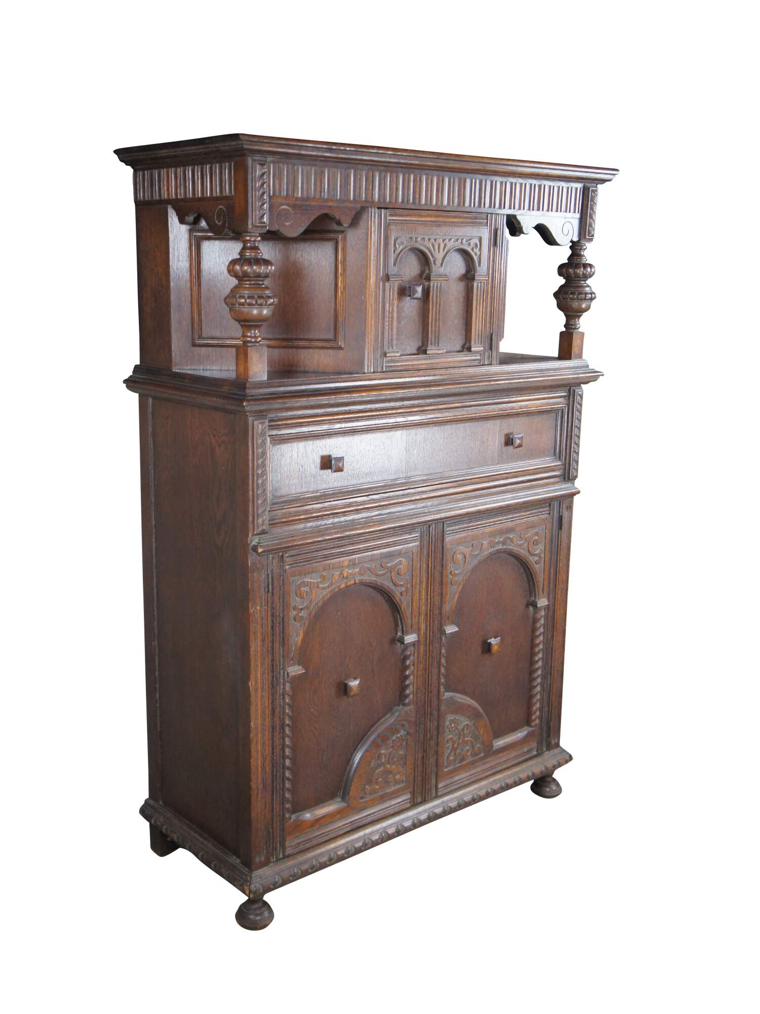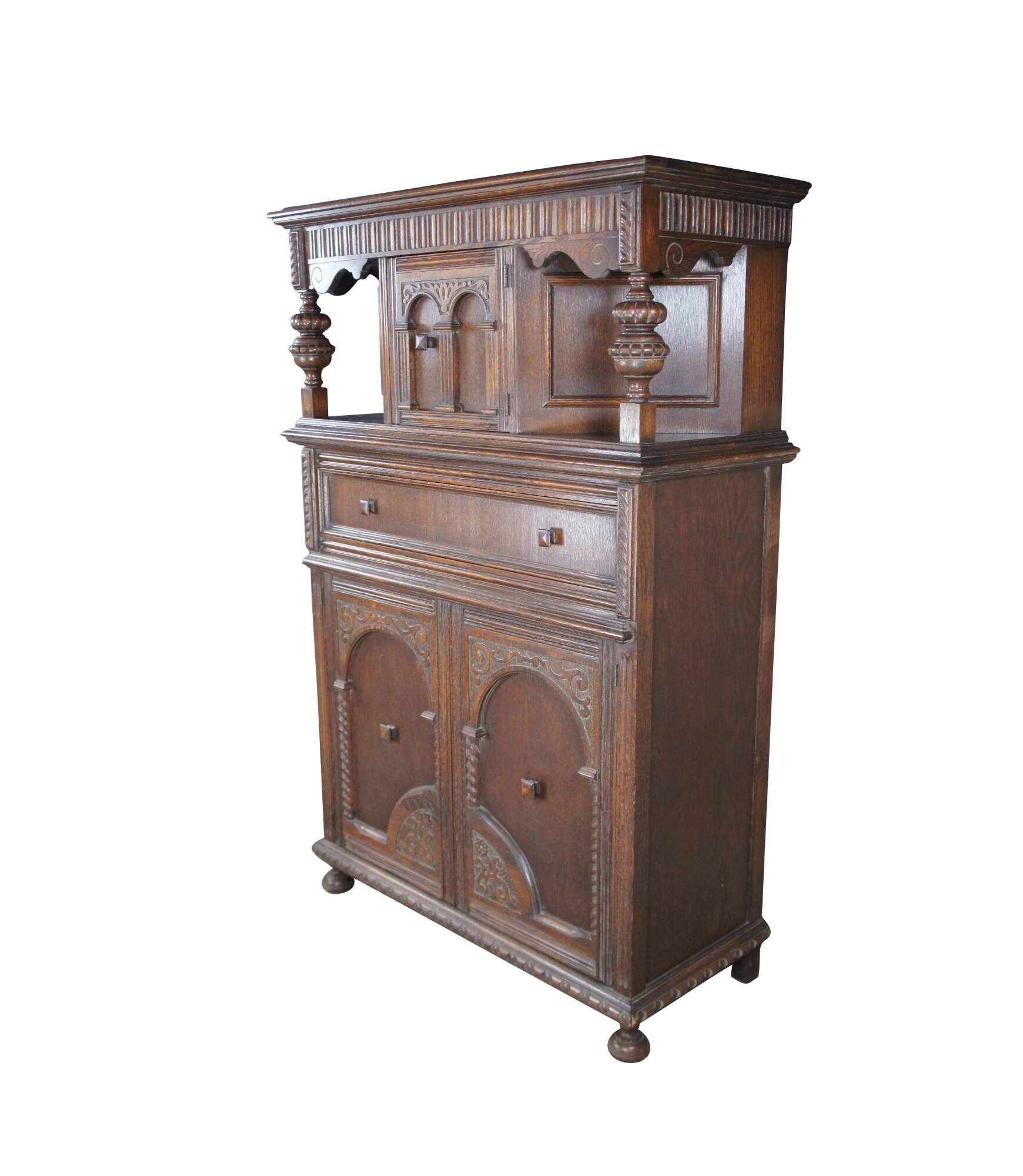 An exceptional Jacobean style Court Cupboard, Circa 1920s. Features a tall case with upper hutch between robust turned baluster supports and scrolled spandrels. Upper apron has fluted paneling in a linen fold manner. Below is a large central dovetailed drawer and lower cabinet for accessory storage. Lower doors are carved with rope twist design and foliate scrolling. The cabinet is supported by turned bun feet.