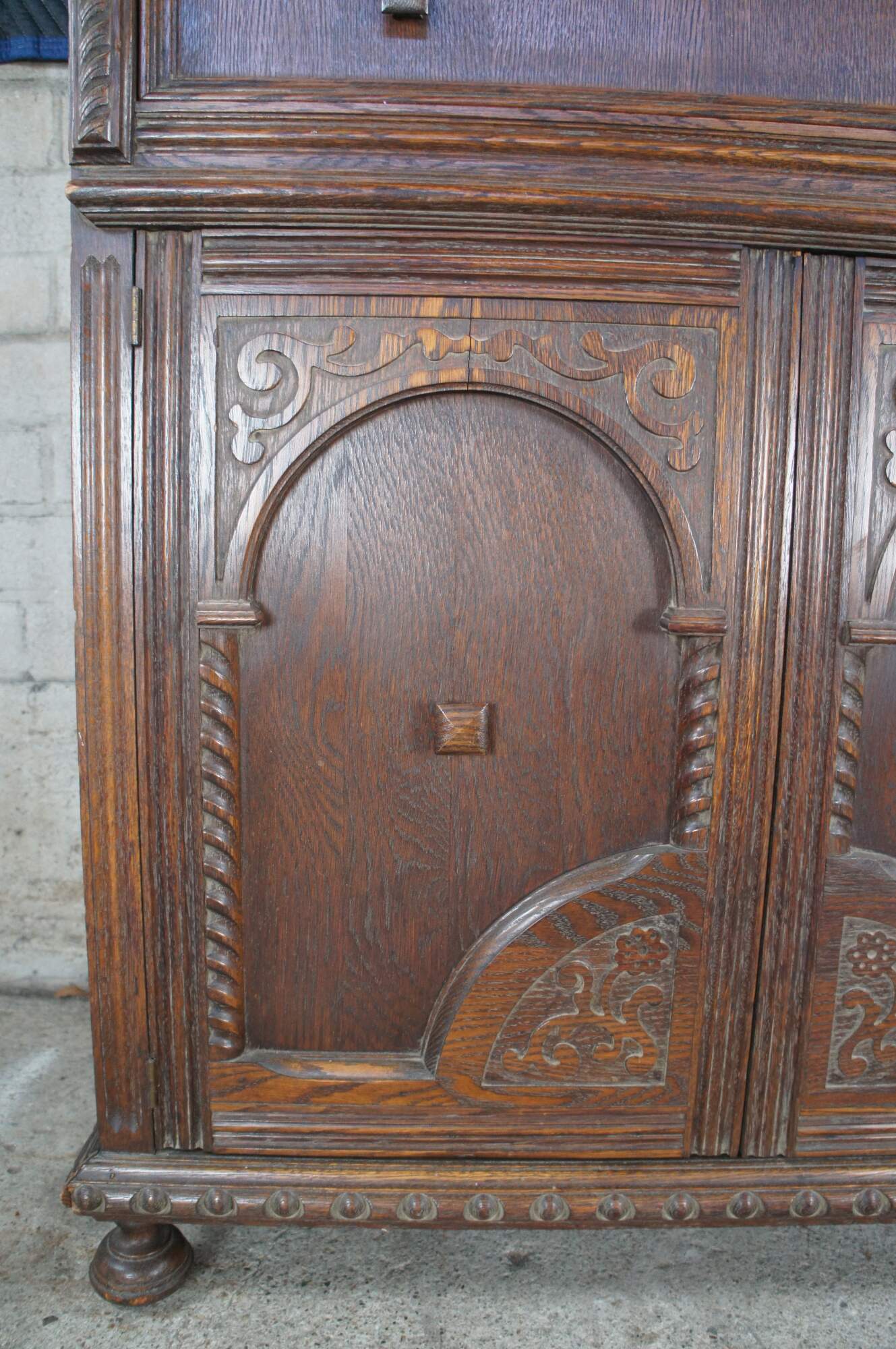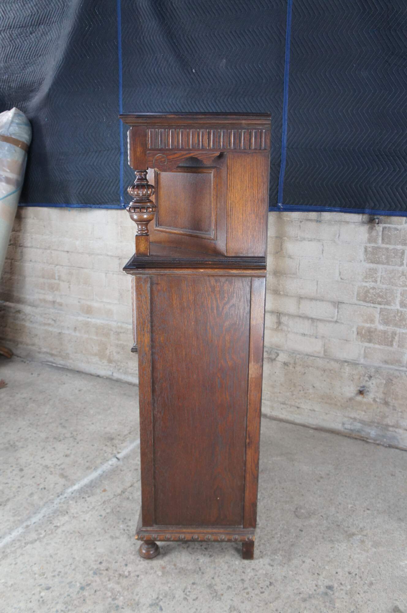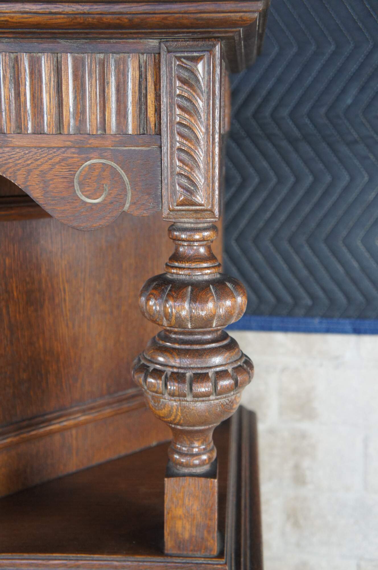 An exceptional Jacobean style Court Cupboard, Circa 1920s. Features a tall case with upper hutch between robust turned baluster supports and scrolled spandrels. Upper apron has fluted paneling in a linen fold manner. Below is a large central dovetailed drawer and lower cabinet for accessory storage. Lower doors are carved with rope twist design and foliate scrolling. The cabinet is supported by turned bun feet.
