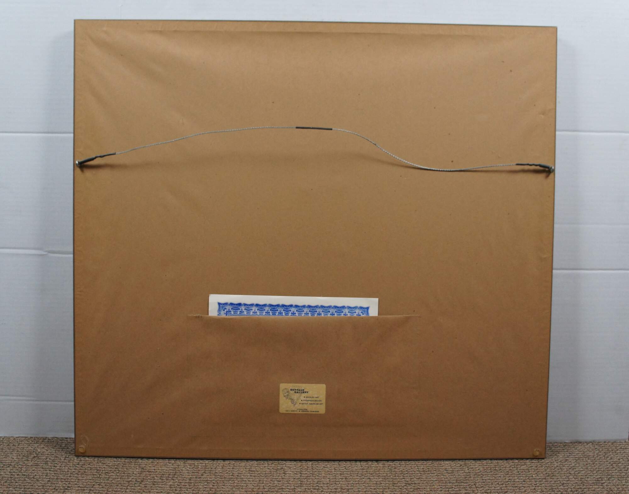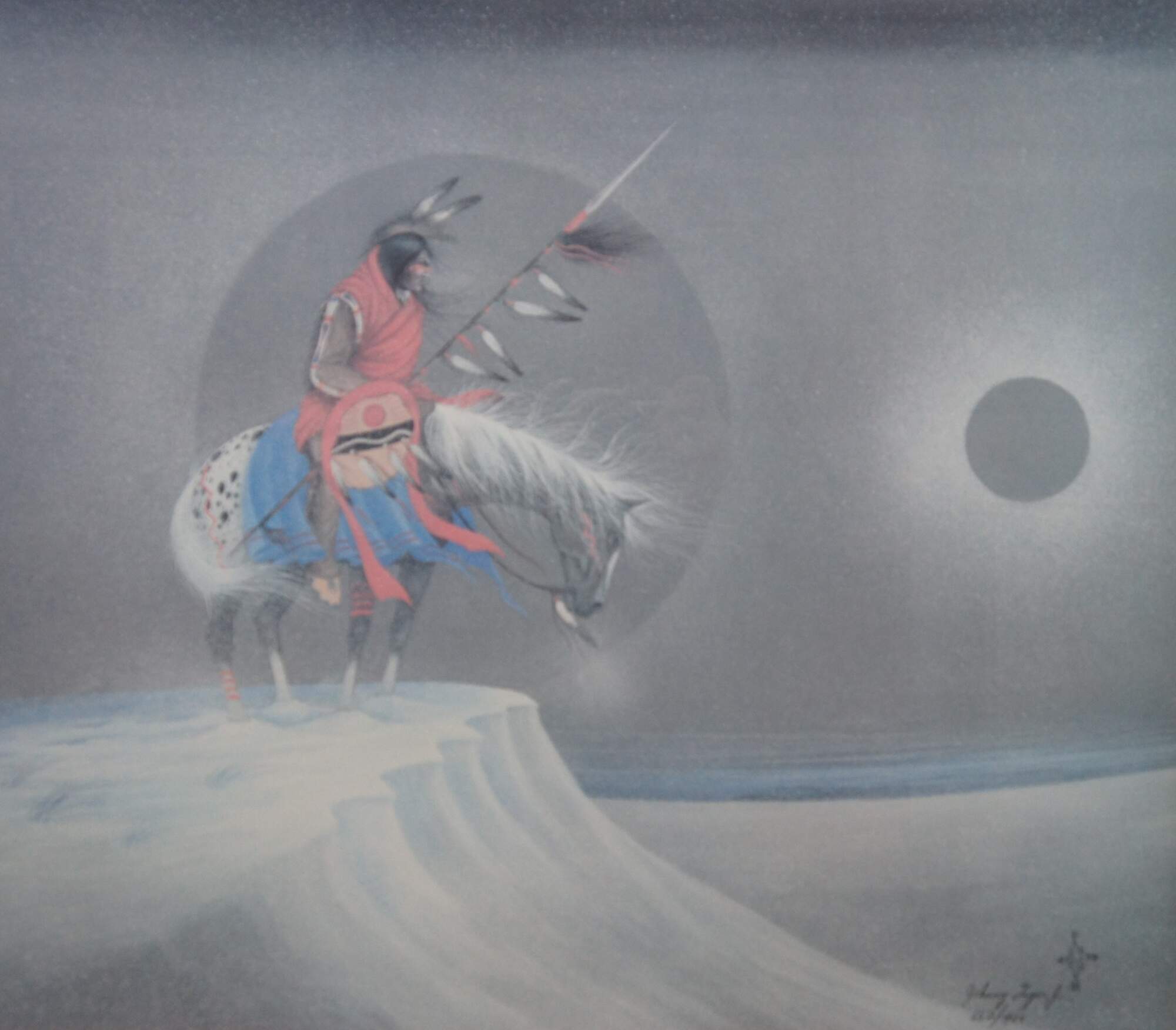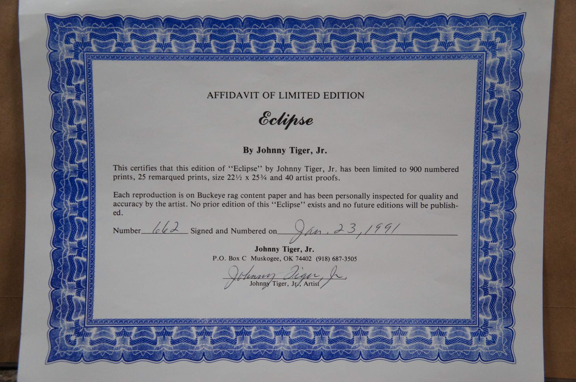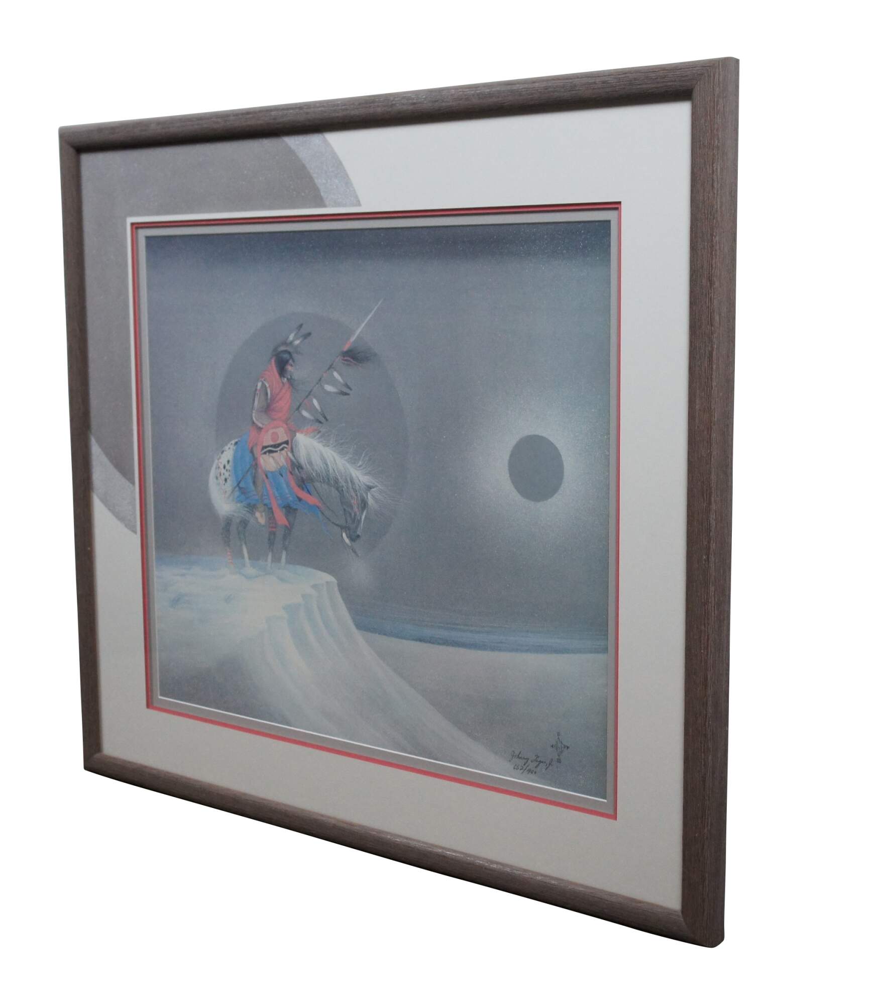 Vintage 1991 lithograph print titled "Eclipse" by Johnny Tiger, Jr. Shows a Native American warrior / hunter on a paint horse, standing on a sand dune under a total eclipse. Pencil signed and numbered 662/900. Includes Affidavit of Limited Edition. Dark brown wood frame, gray and red layered mat with eclipse printed in the upper corner.