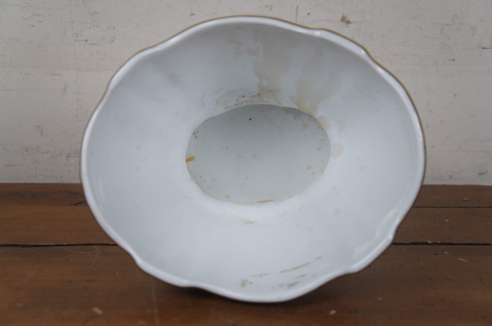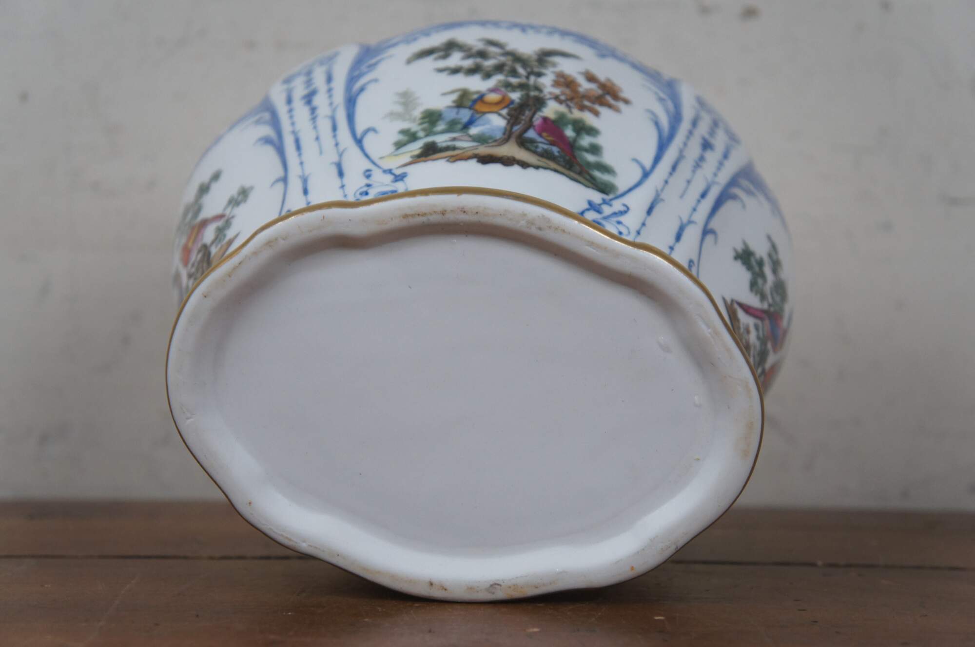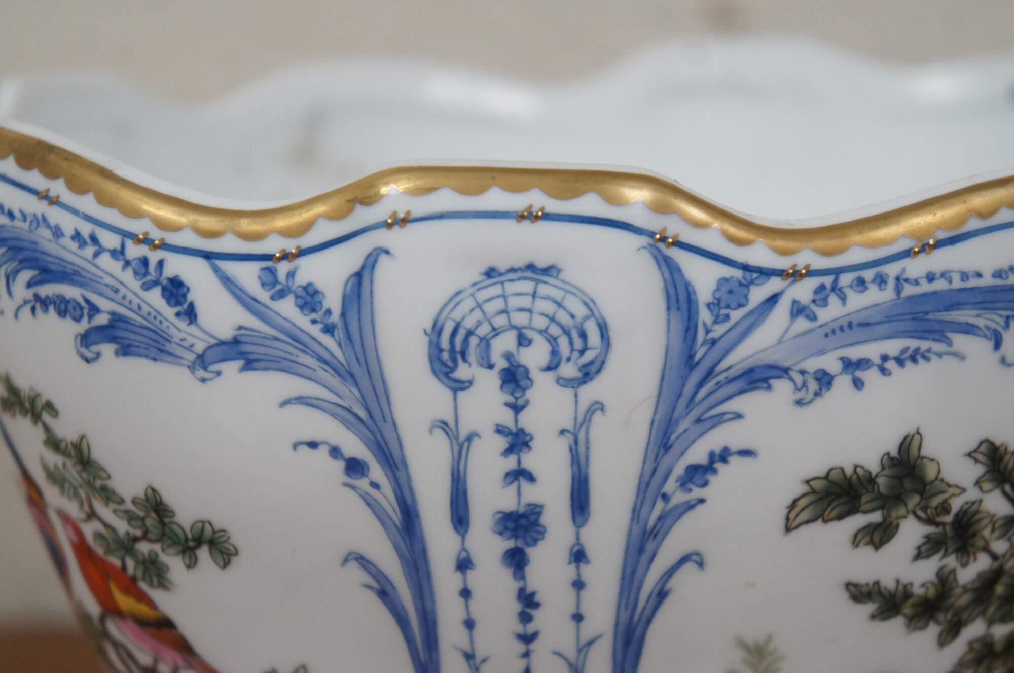 French Desvres style porcelain planter / jardiniere / cachepot / compote / footed centerpiece bowl - oval form with scalloped, gilded edge, tapering to a flared base. Hand painted with delicate blue frames arouns brightly colored birds on small trees.