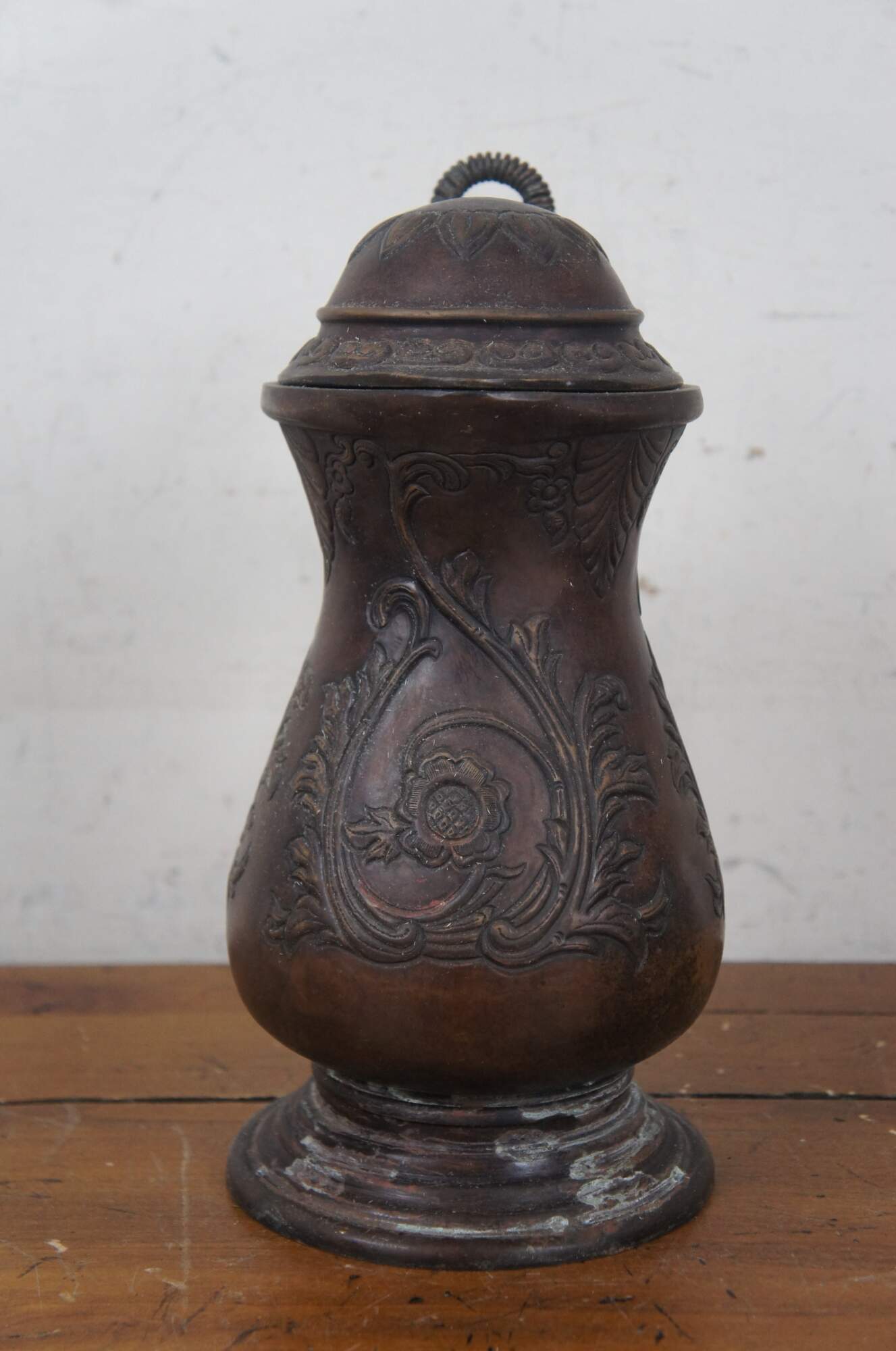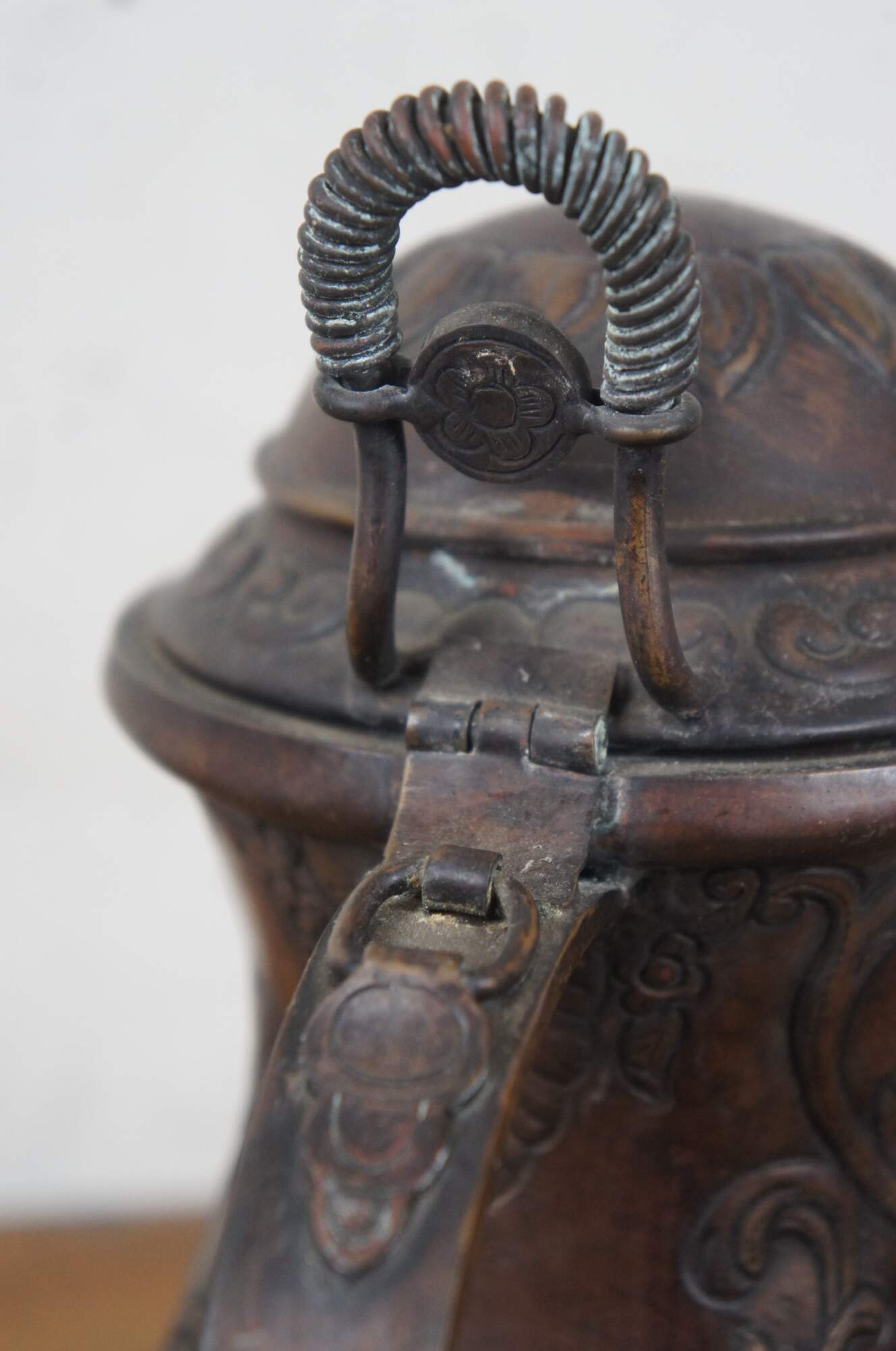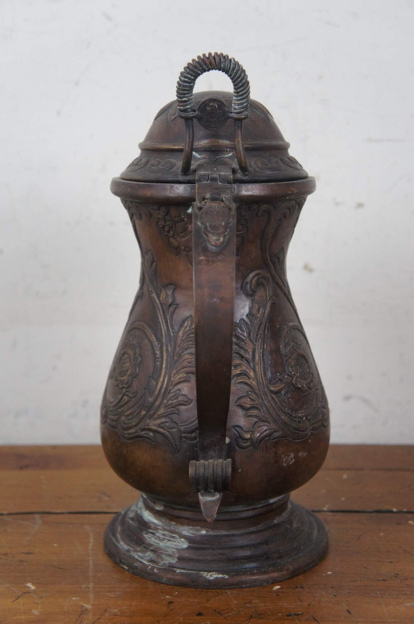 Rare Maitland Smith brass flip top jug / pitcher / flagon, with dark patina, scrolled handle and embossed with a design of swirling leaves, roses, and sunflower on the lid.