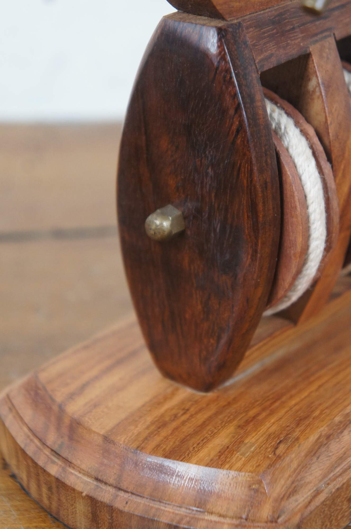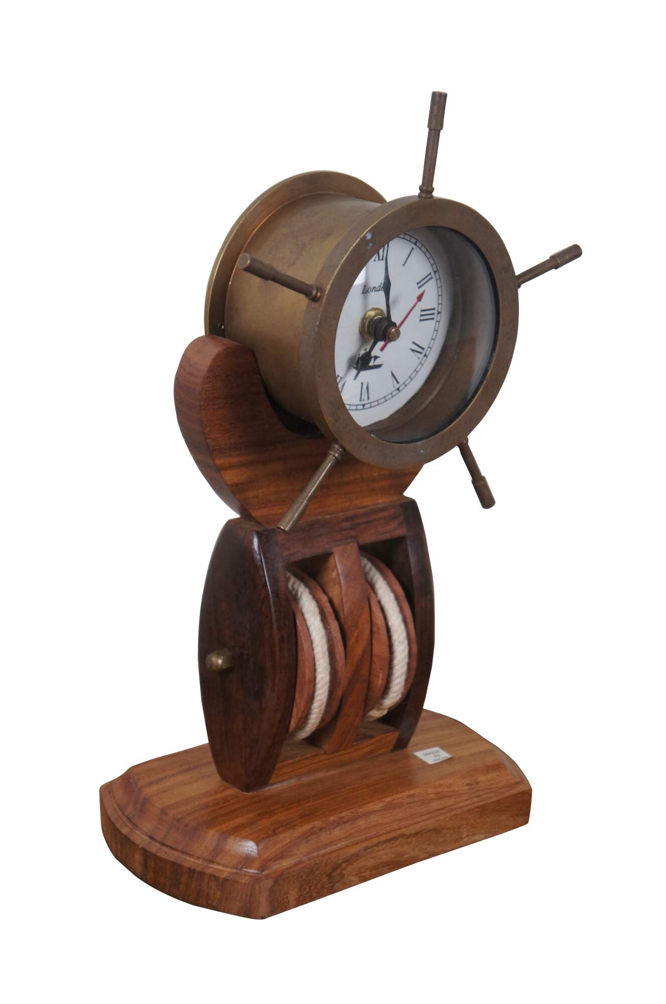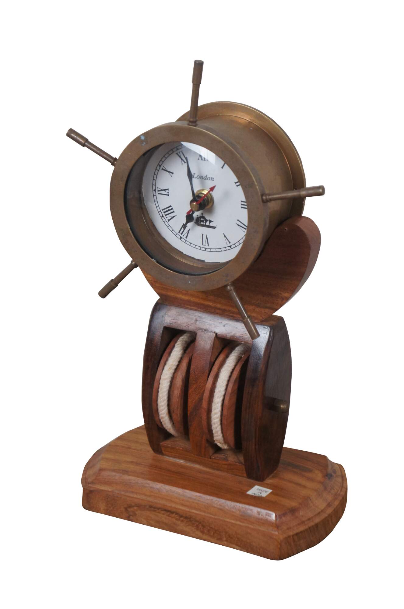 Late 20th century desk clock in the shape of a brass ship's wheel / helm, mounted on a wooden double pulley base. White face with Roman numerals, marked London. Prestige Quartz battery operated movement. Made in India.
